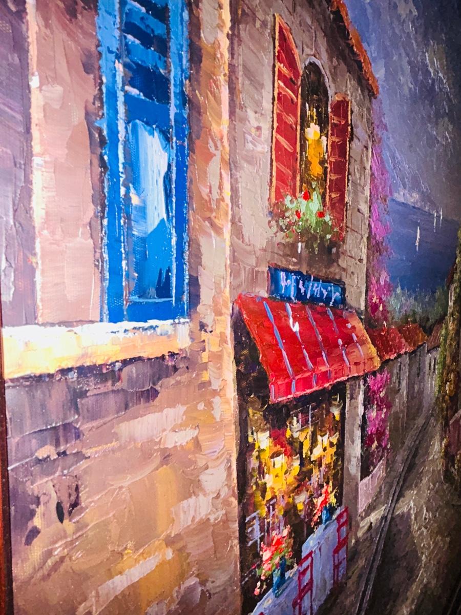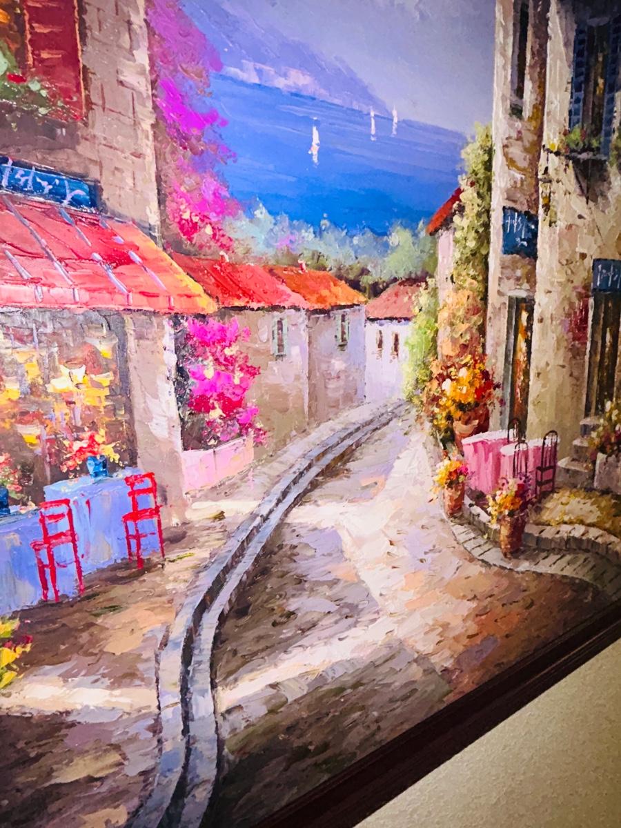 Subject Matter: The painting depicts a Mediterranean or European town scene, possibly inspired by the French Riviera or a similar coastal area.