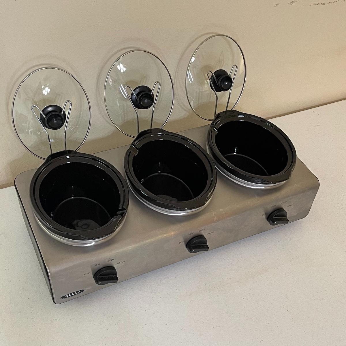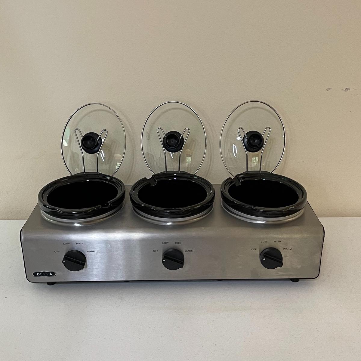 All pots and lid brackets remove for easy cleaning and storage. Serving spoons not included. 9”H x 26”W x 12-1/4” D. Each oval is 6-1/2” x 8-1/2” and 4” Deep.