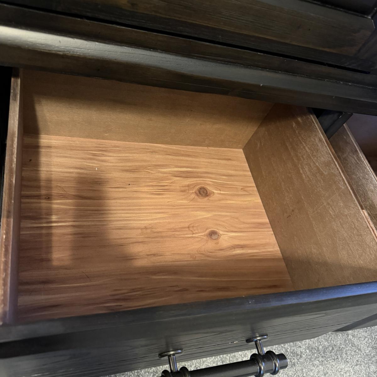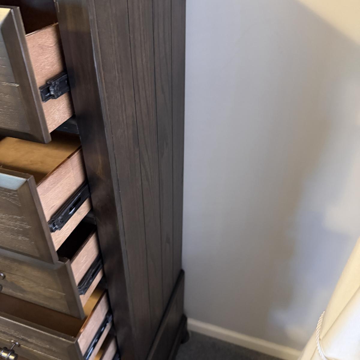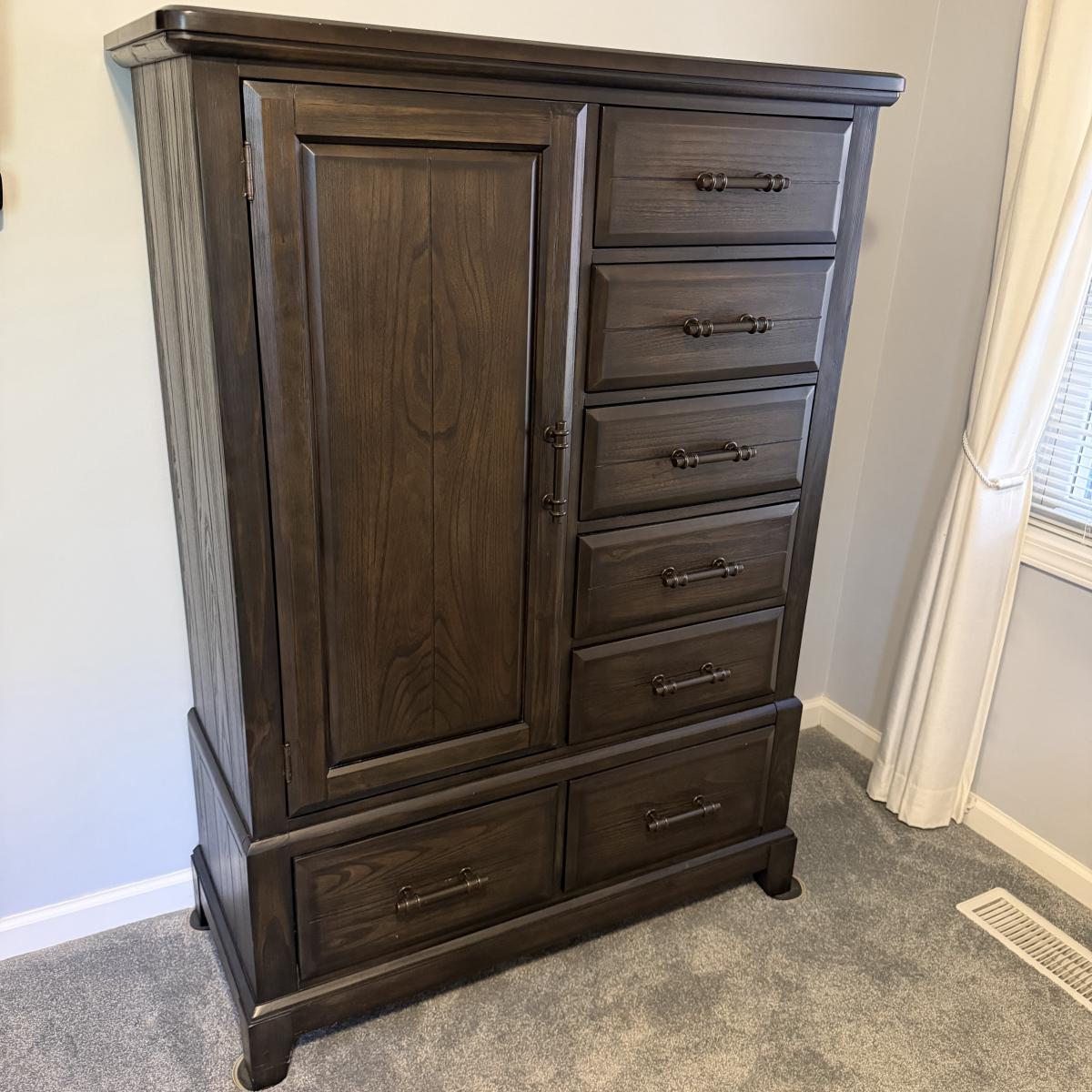 This Bellamy Lane Man’s door chest is made by Bernard’s Furniture Group. Chest has seven drawers with a cabinet with two adjustable shelves. Piece measures 43” x 18” x 60”H and appears to be solid wood.