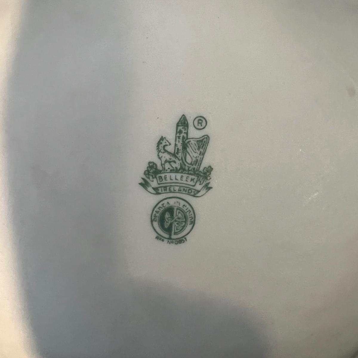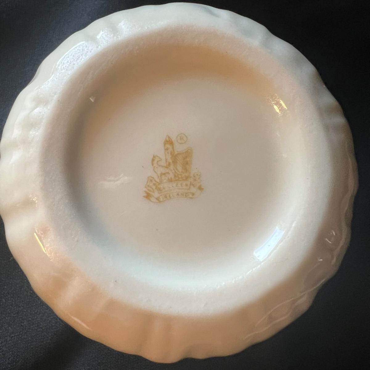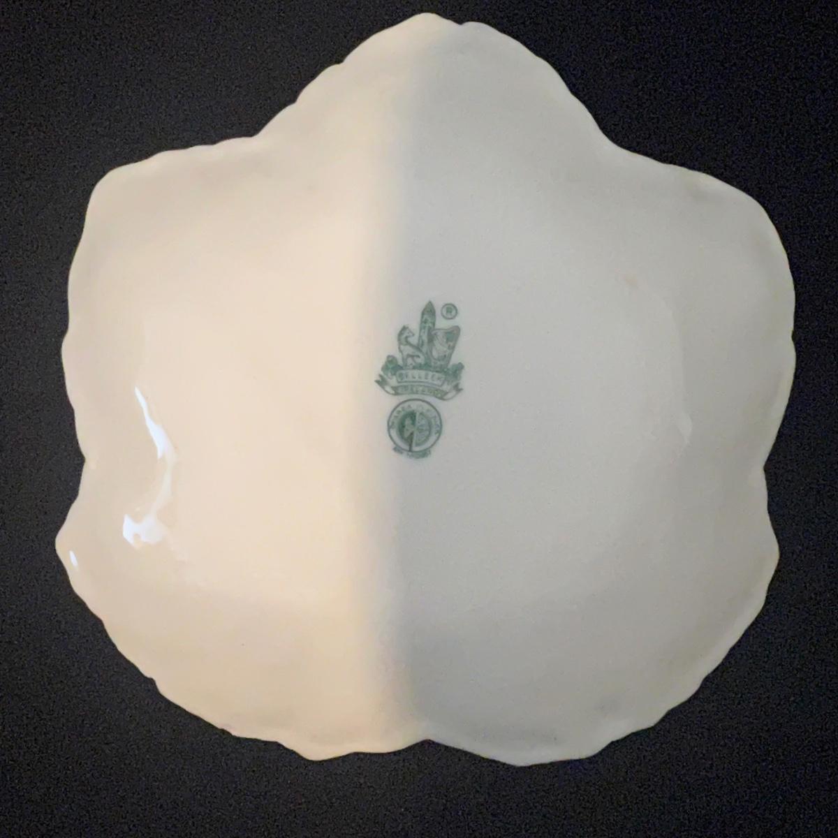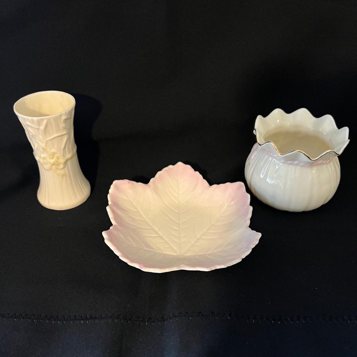 A collection of small Belleek Ireland porcelain. A small bud vase measures 2”D x 4”H. The leaf dish measures approximately 5”D and the small vase measures 3.25”S x 2.5”H.