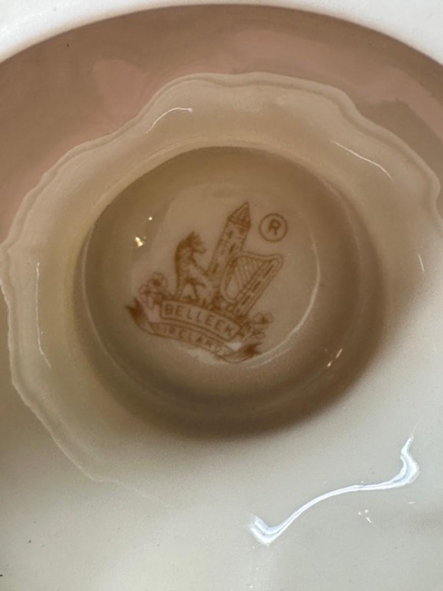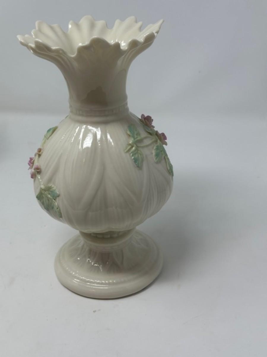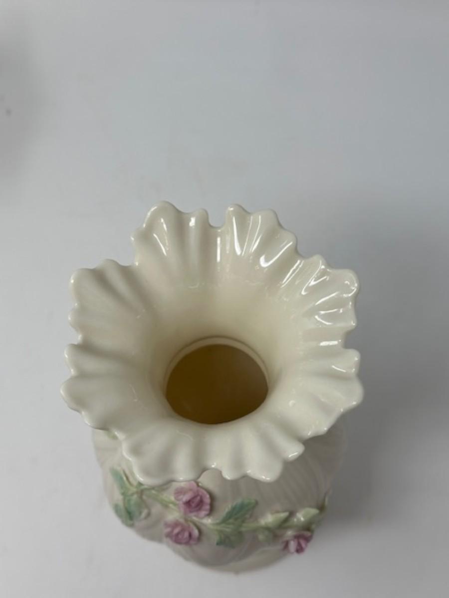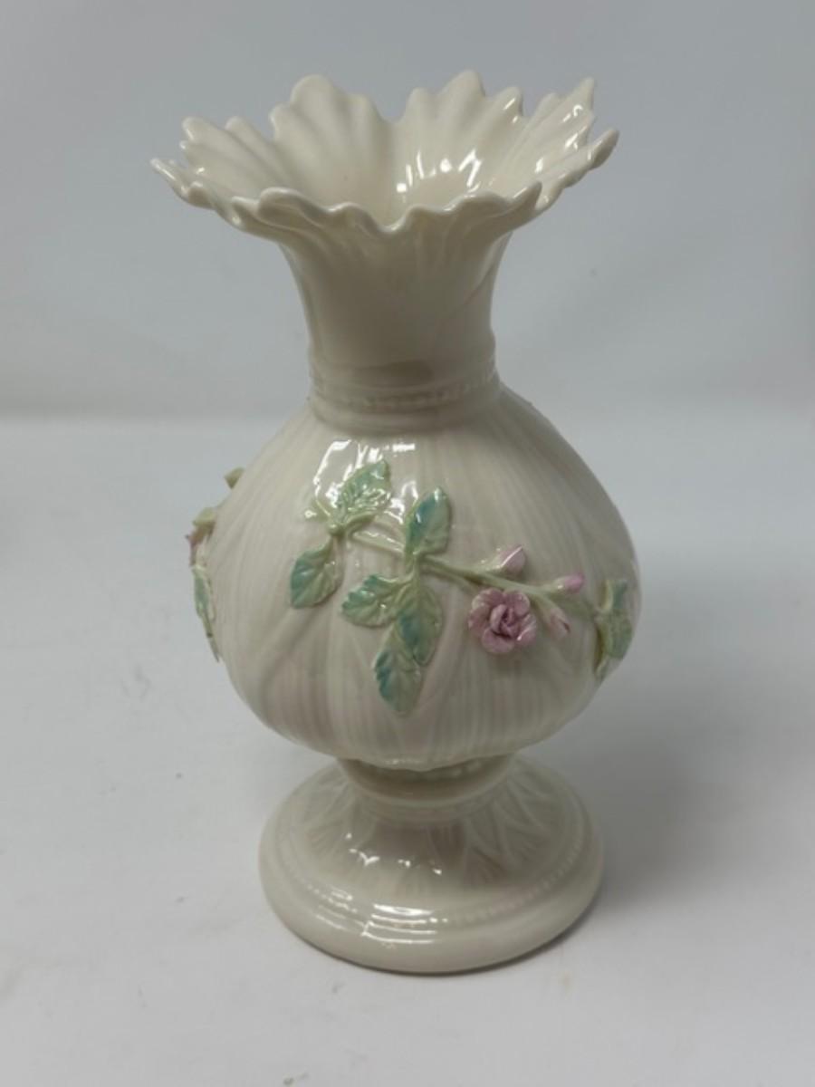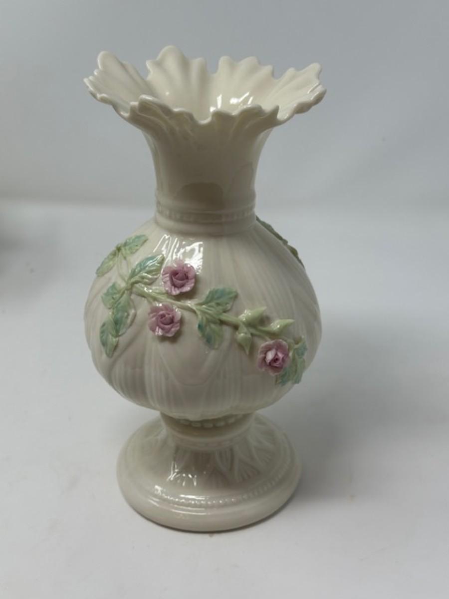 BELLEEK APPLIED PINK ROSES RIBBON 8' FLOWER VASE