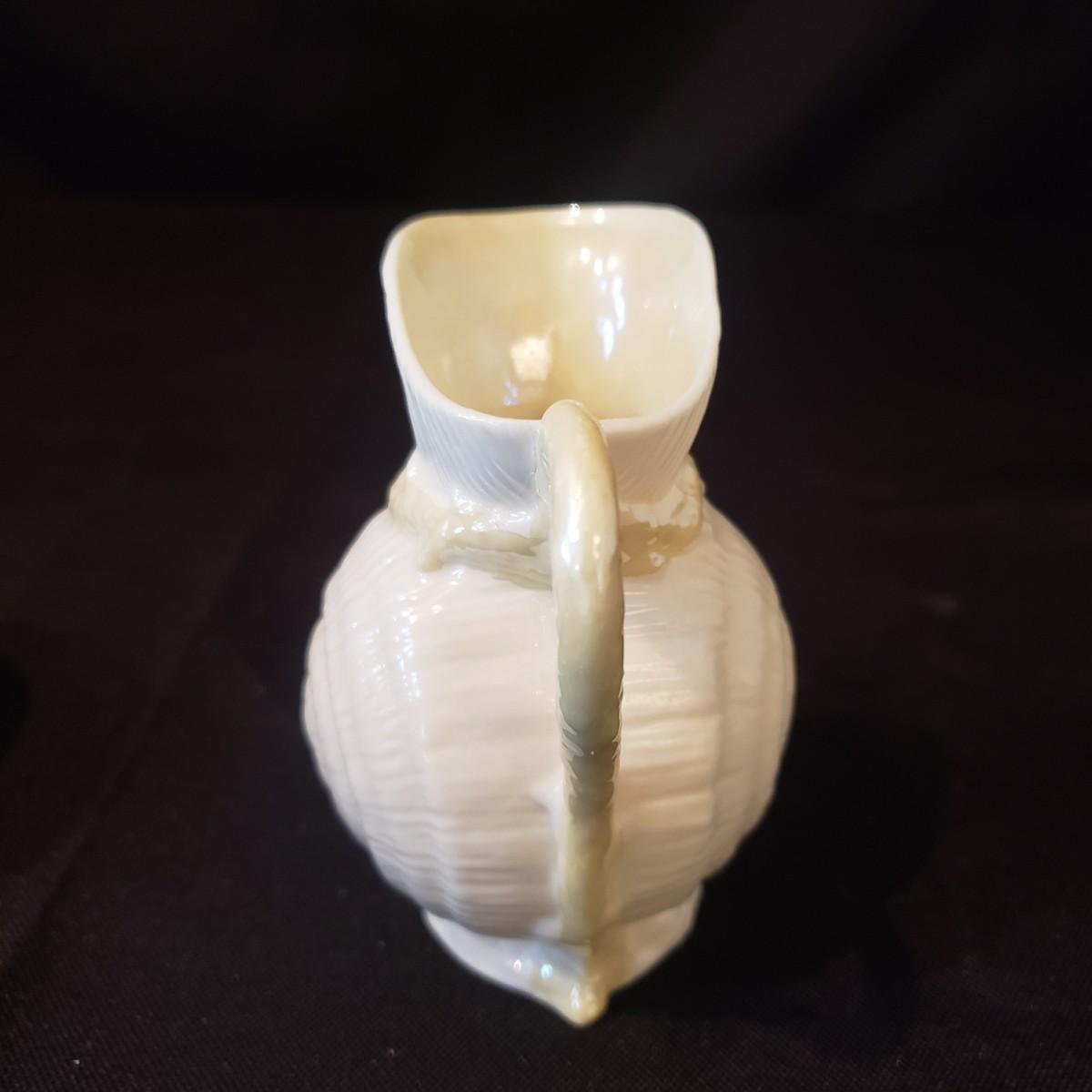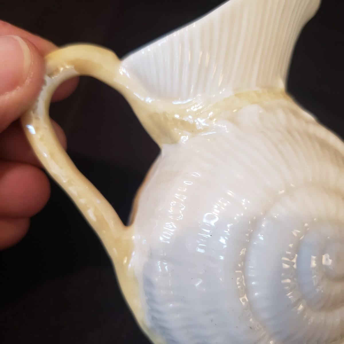 This pair of fine China cream and sugar bowls are made by Belleek Ireland. They each have a Nautilus shell pattern on the outside. There is a soft hint of yellow iridescent coloring on the inside, as well as on the creamer handle. The creamer measures 3" x 4"H.