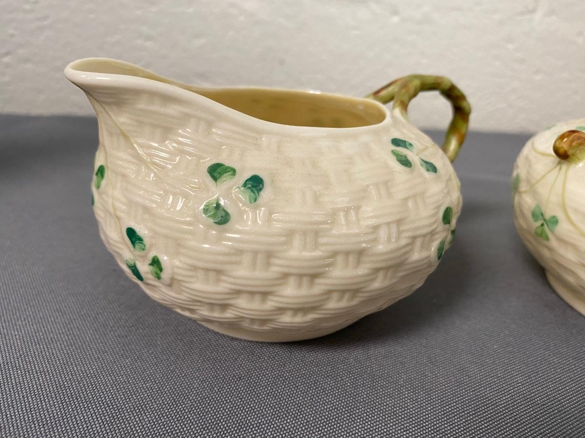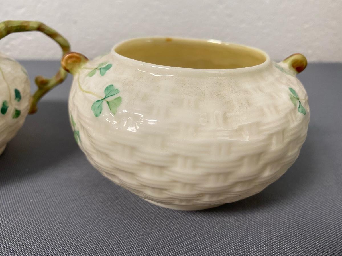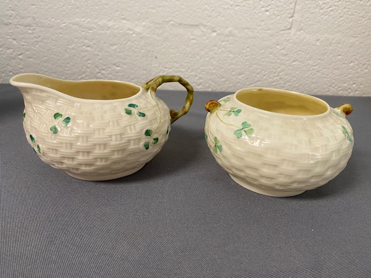 Belleek Ireland Shamrock Basket Weave Sugar & Creamer