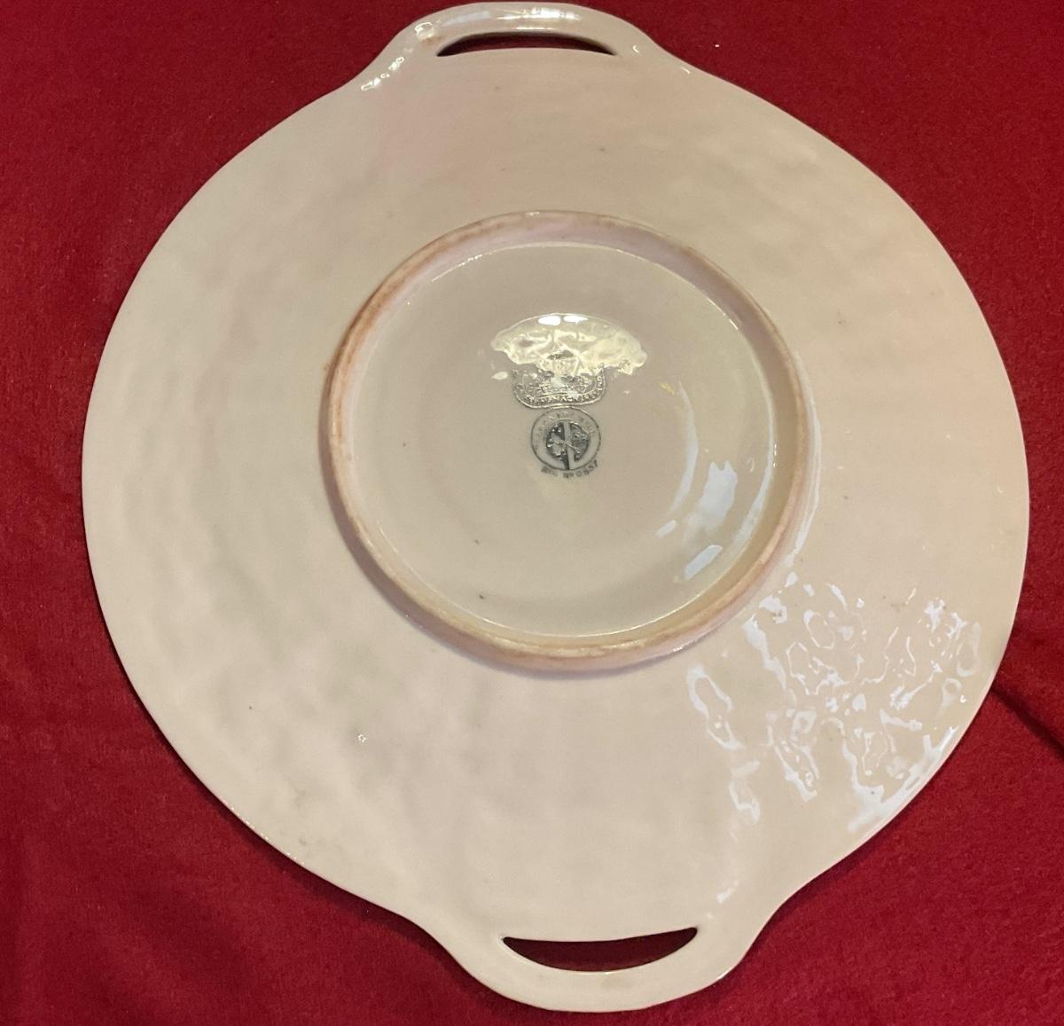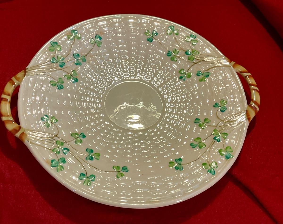 Belleek Irish pottery cake plate with basket weave pattern and clovers