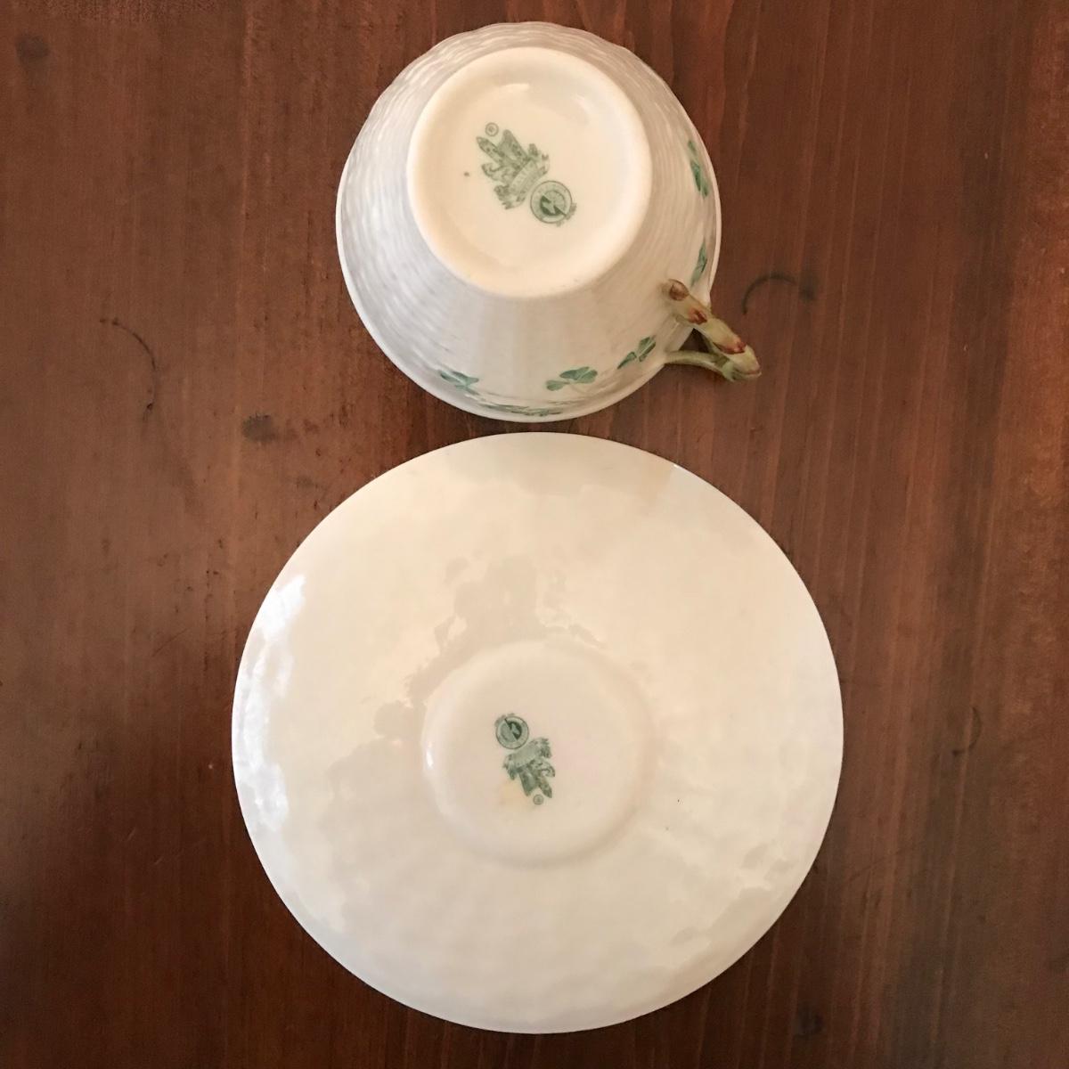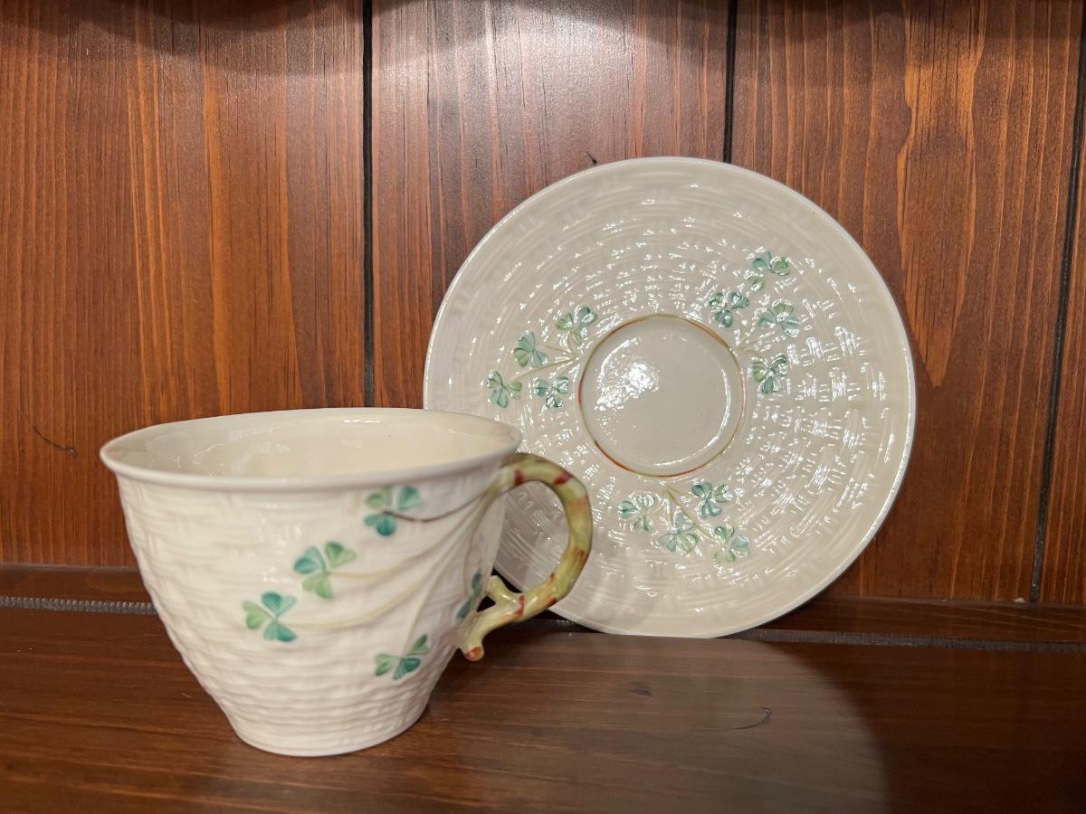 BELLEEK Teacup Saucer Basket Weave Green Shamrocks