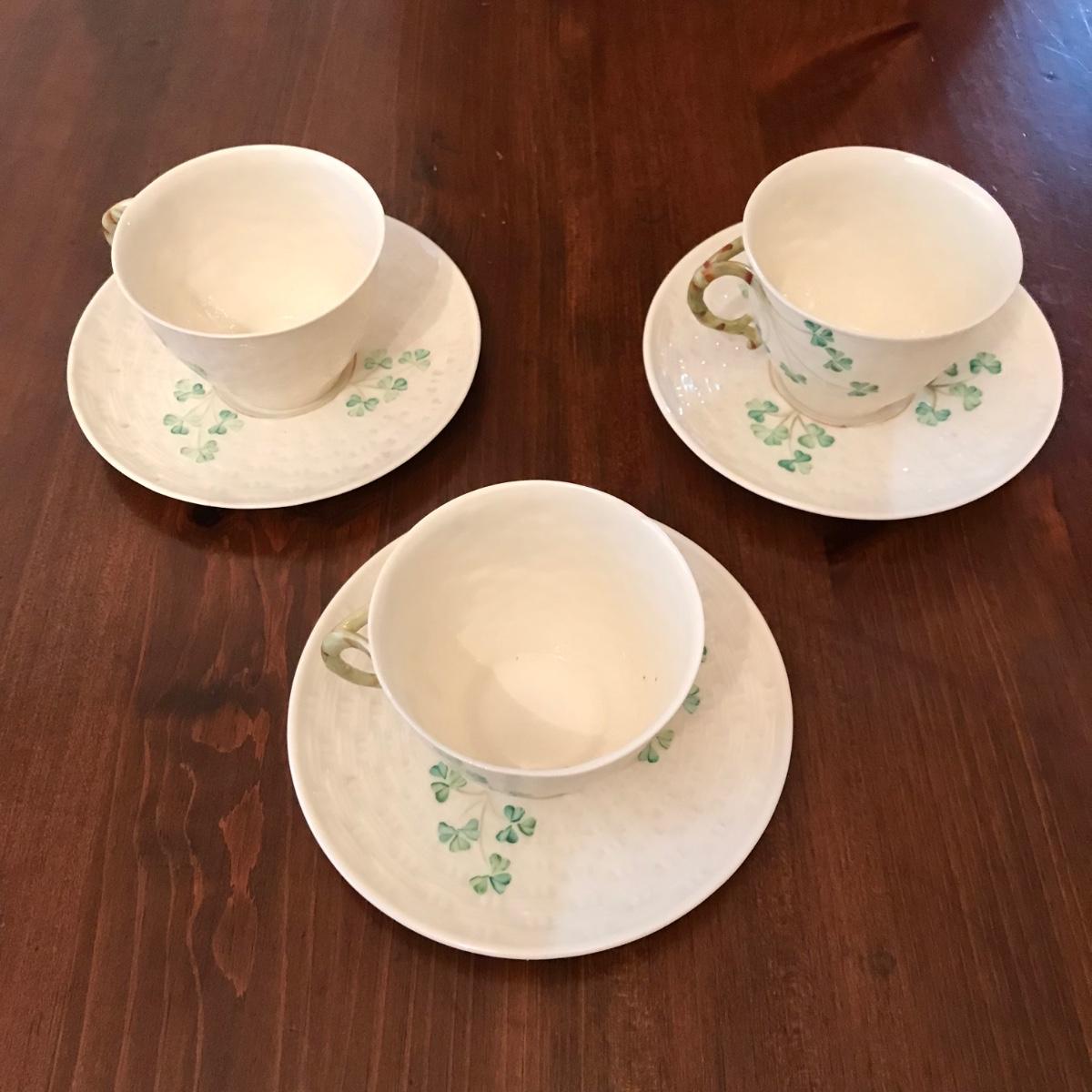 Belleek Teacup Saucer Basket Weave Green Shamrocks set of 3 3 - cup / saucer. Saucer measuring 6”