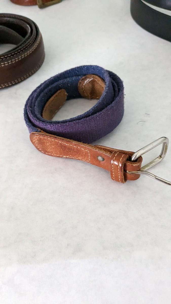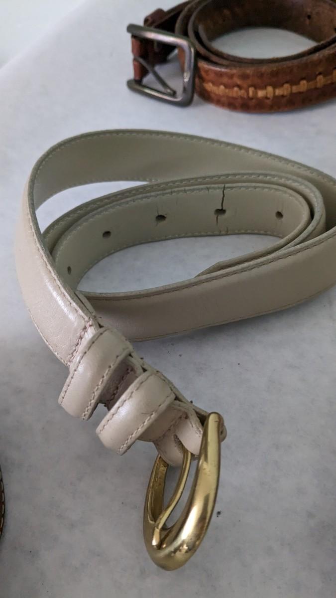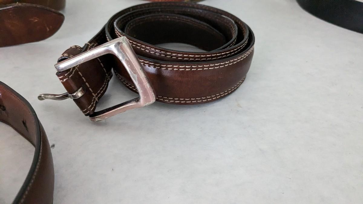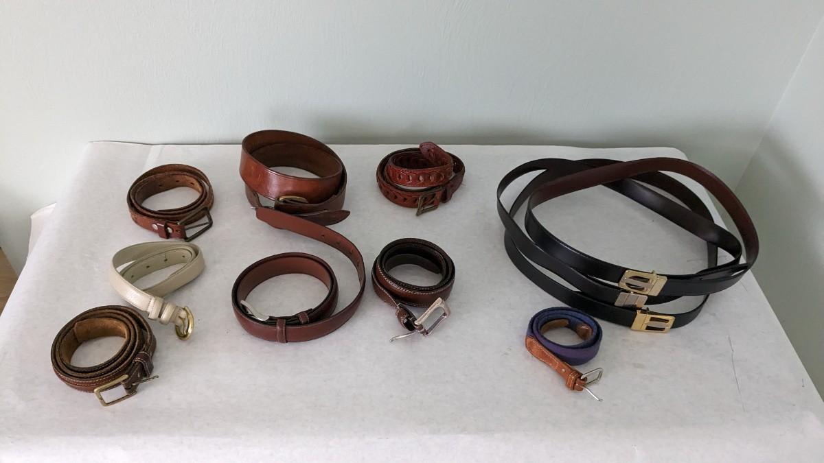 some very nice leather belts, vintage and contemporary. Only one noted with cracking and one with heavy patina on rivets. Some good petential for upcycle or everyday use in this one! livingroom