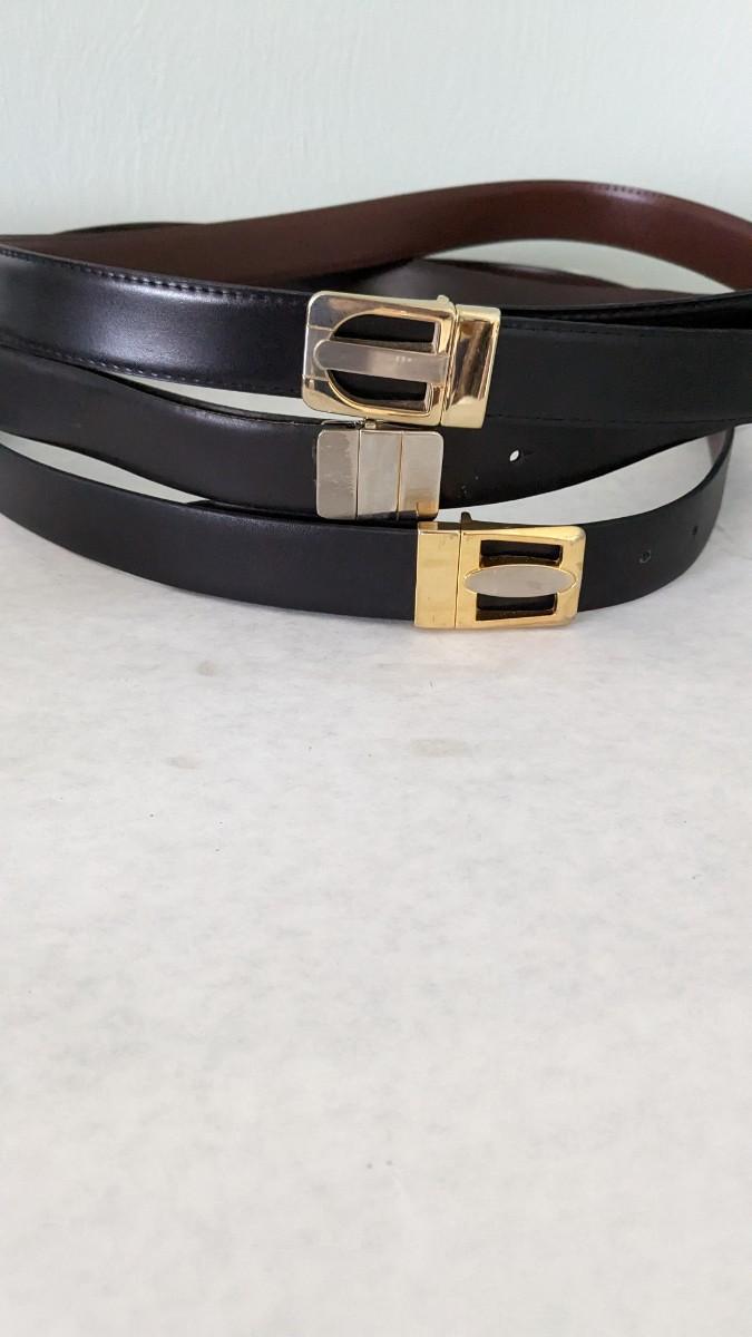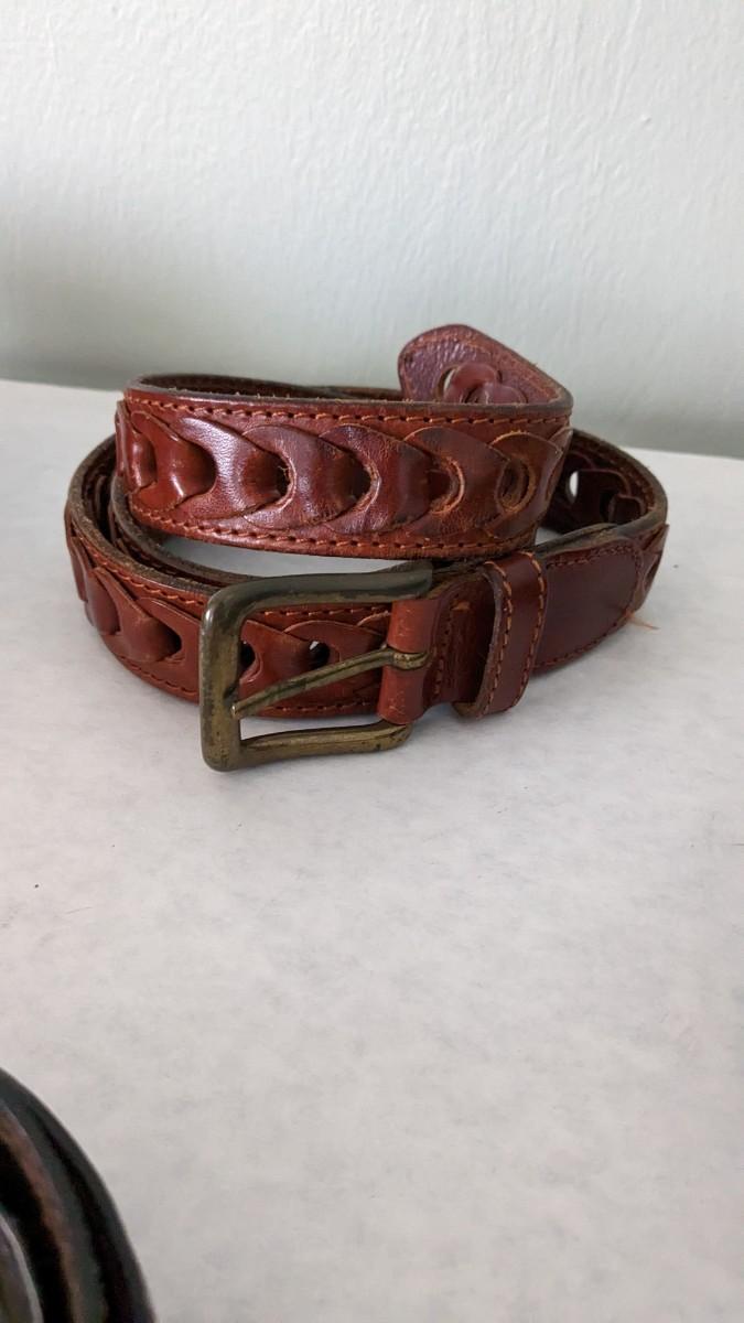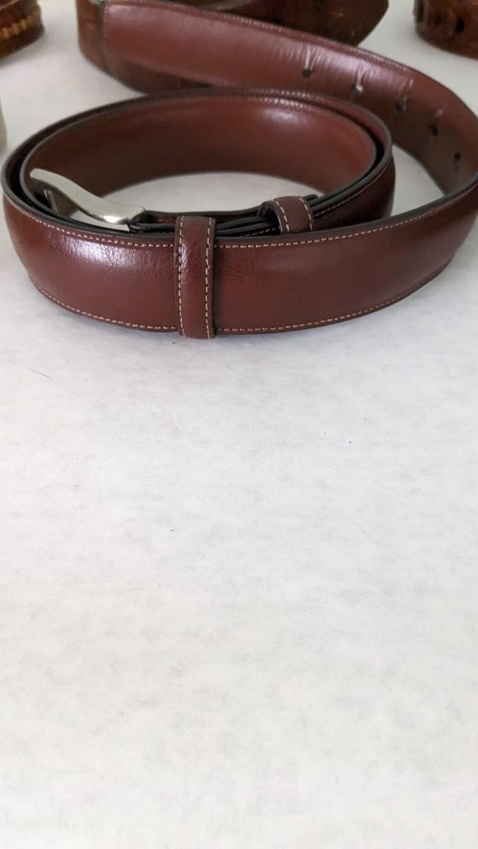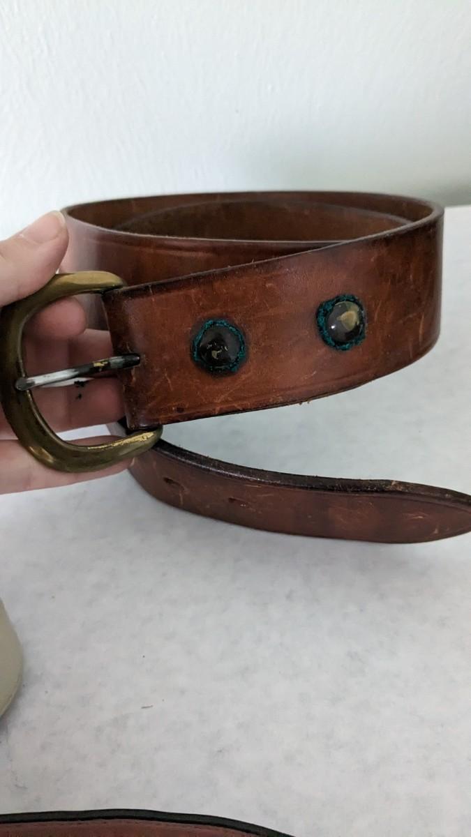 some very nice leather belts, vintage and contemporary. Only one noted with cracking and one with heavy patina on rivets. Some good petential for upcycle or everyday use in this one! livingroom