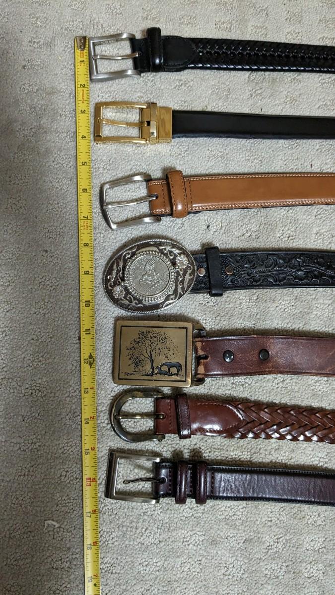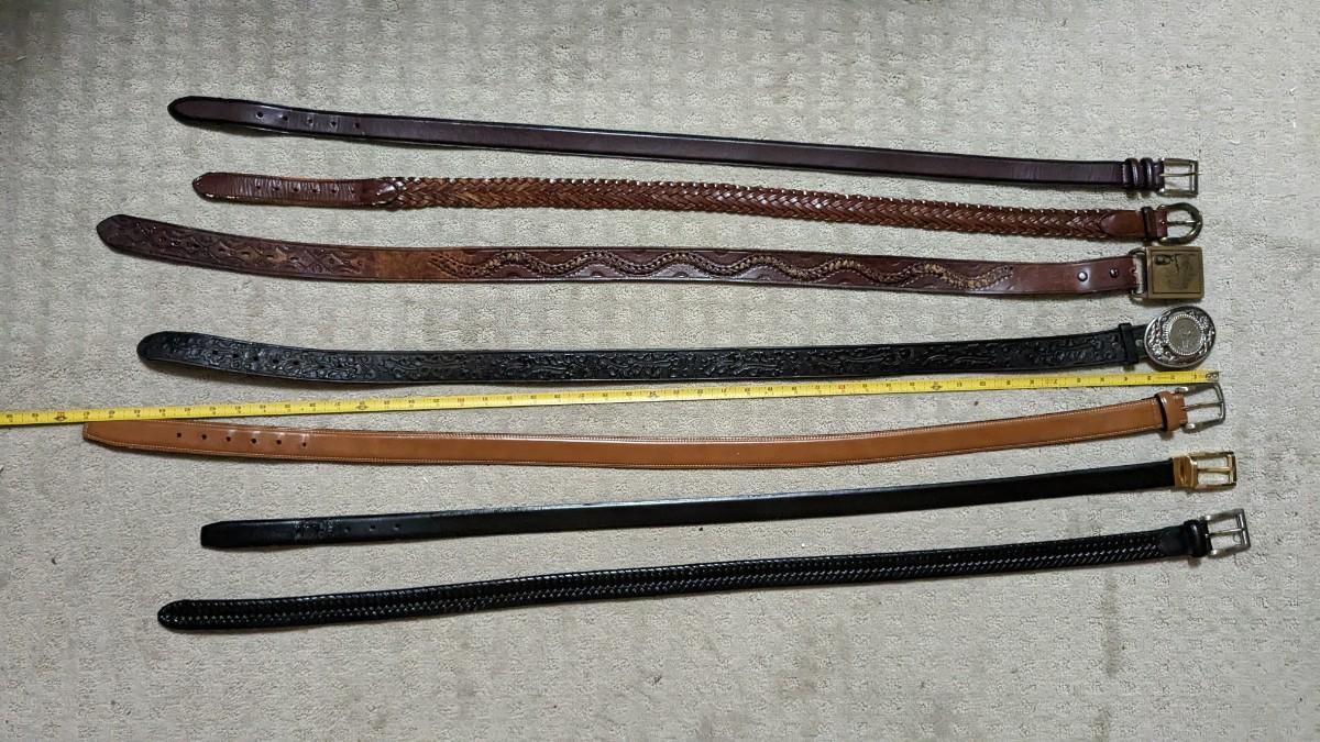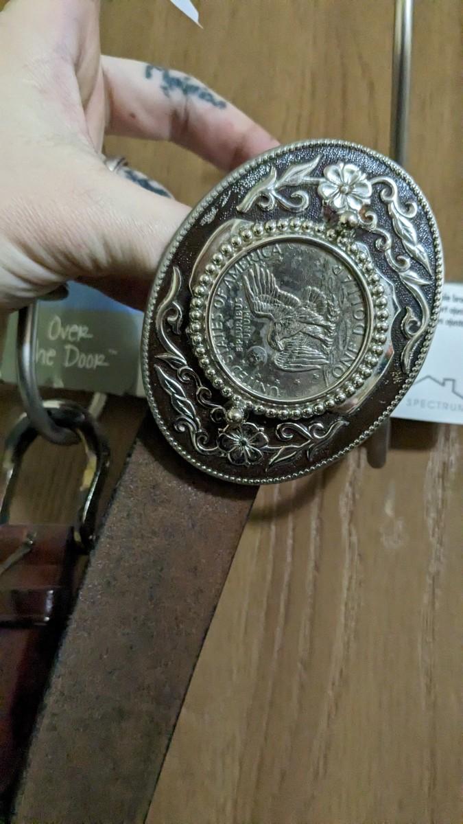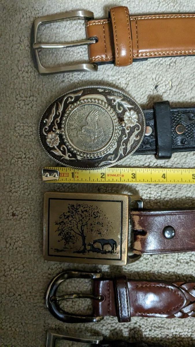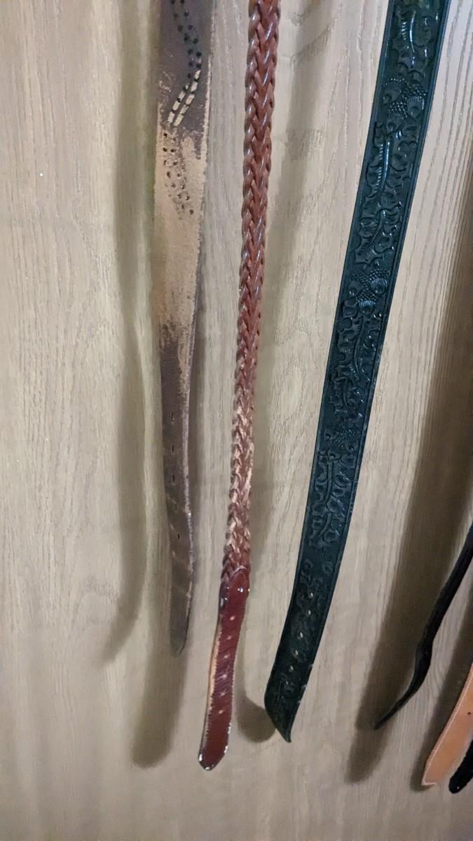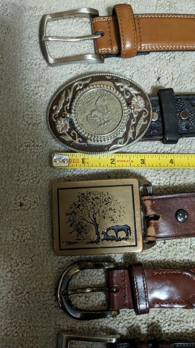 includes some beautiful vintage leather belts, including a stunning hand tooled piece with Eisenhower coin belt buckle as well as spare buckles and rack they're hanging on. Longest belt is 47" including buckle. bdrm1