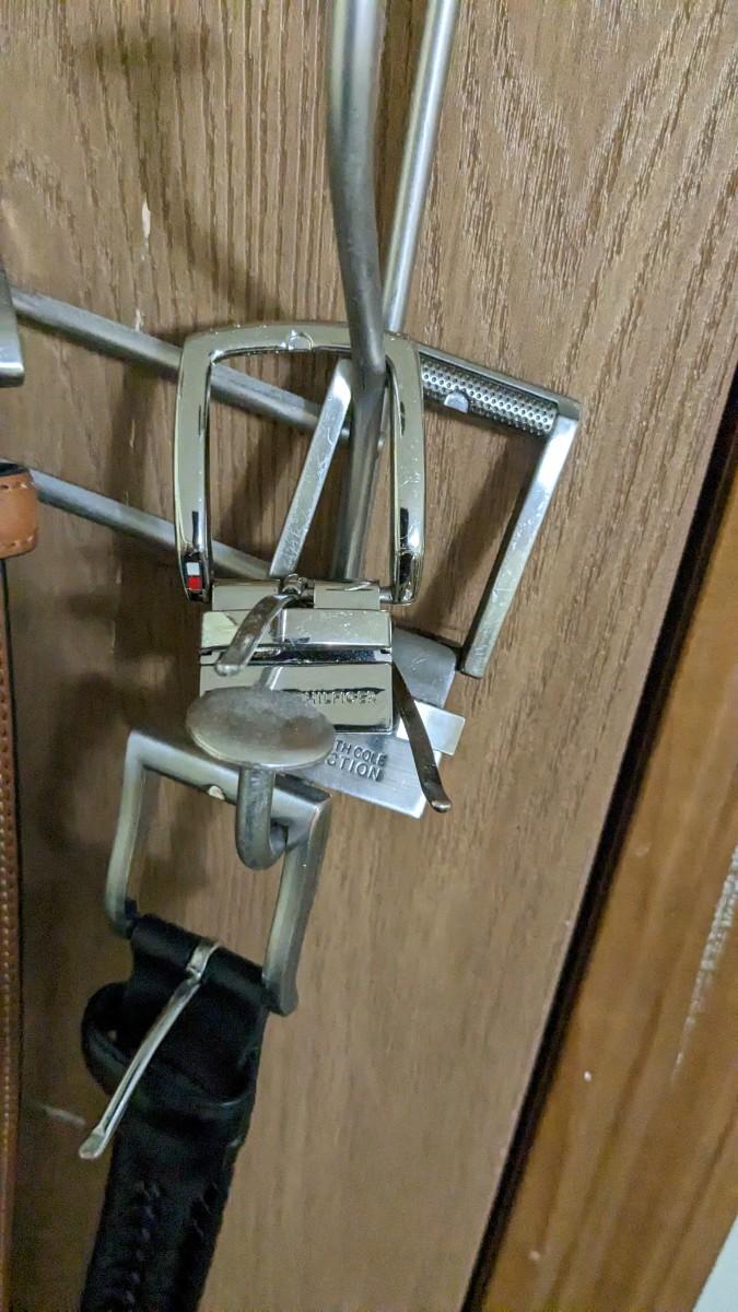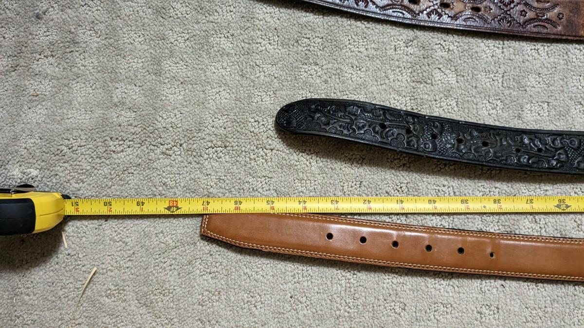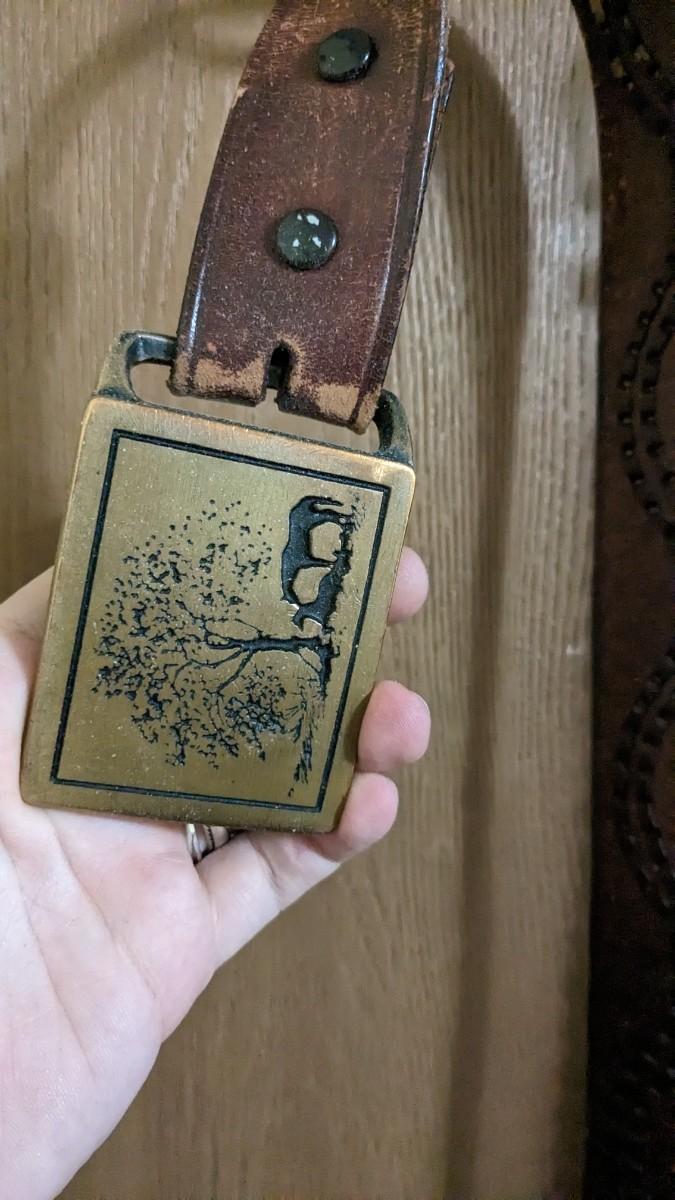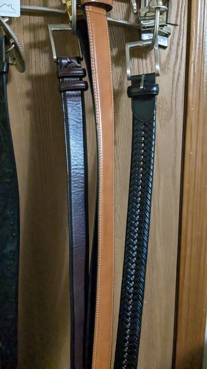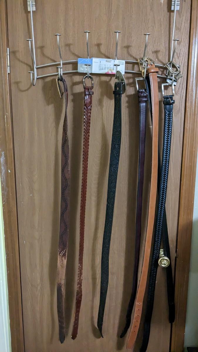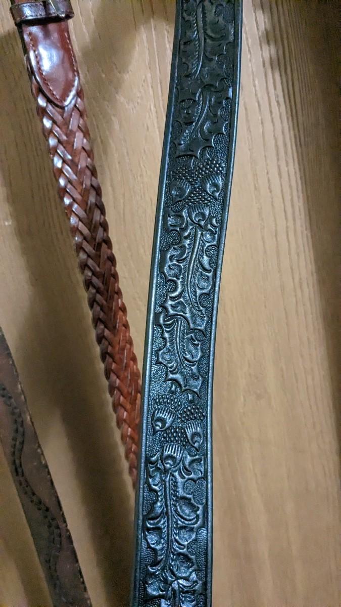includes some beautiful vintage leather belts, including a stunning hand tooled piece with Eisenhower coin belt buckle as well as spare buckles and rack they're hanging on. Longest belt is 47" including buckle. bdrm1