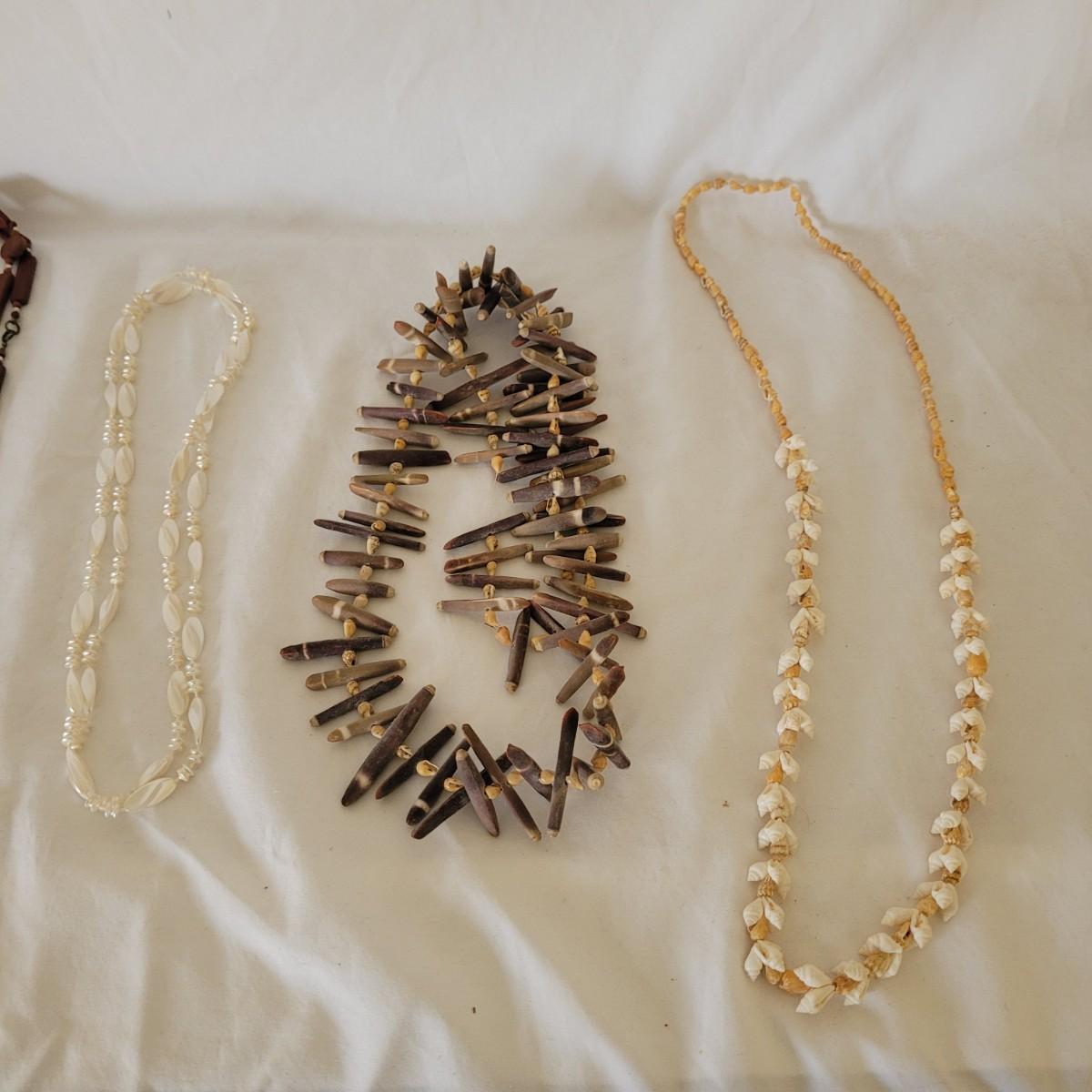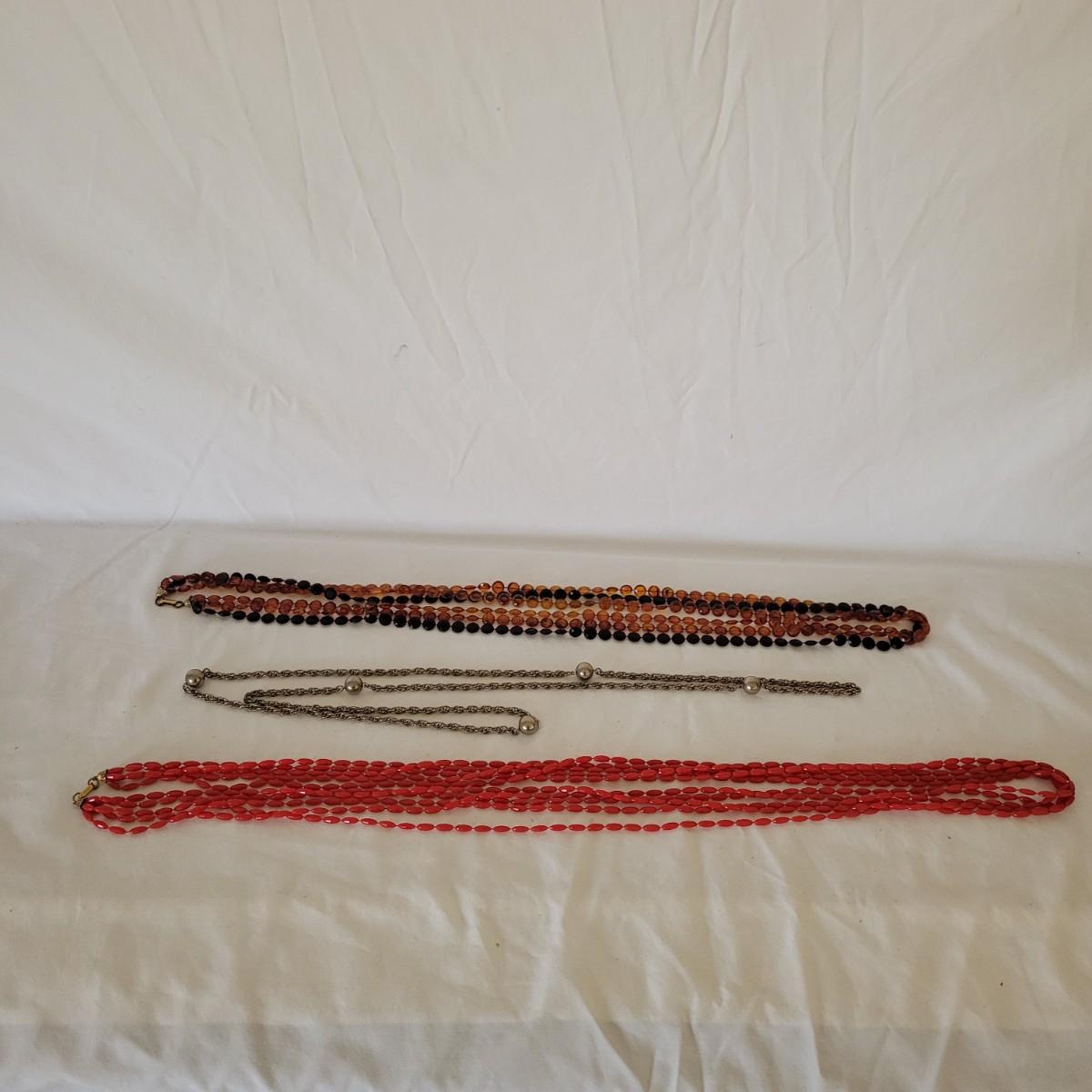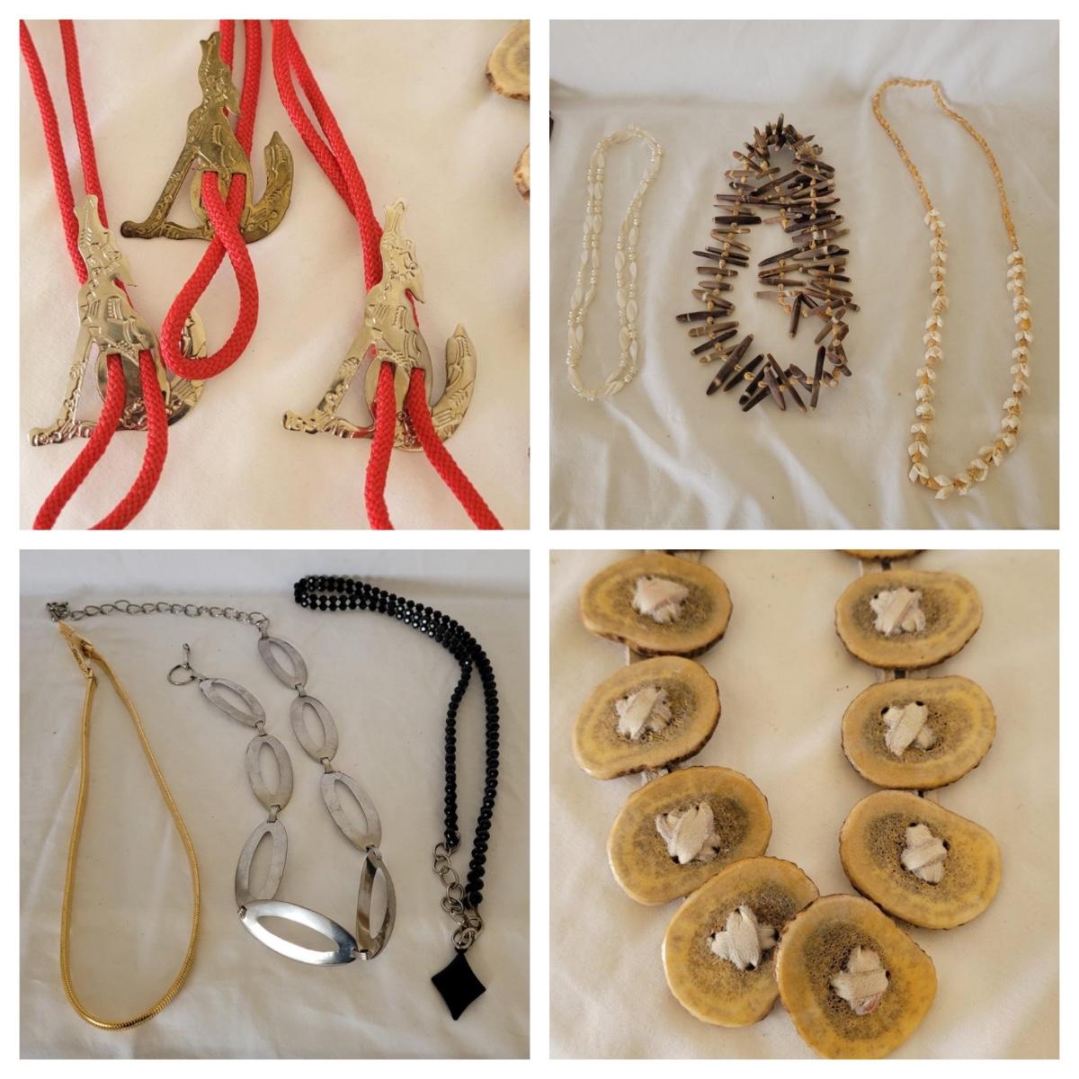 This collection of belts and necklaces includes cowboy style bolo ties, suede belts, shell necklaces, wooden bead necklaces and much more. Note that many necklaces are photographed doubled up, so are much longer. Red beaded necklace measures approximately 27” in total length. Shipping available.
