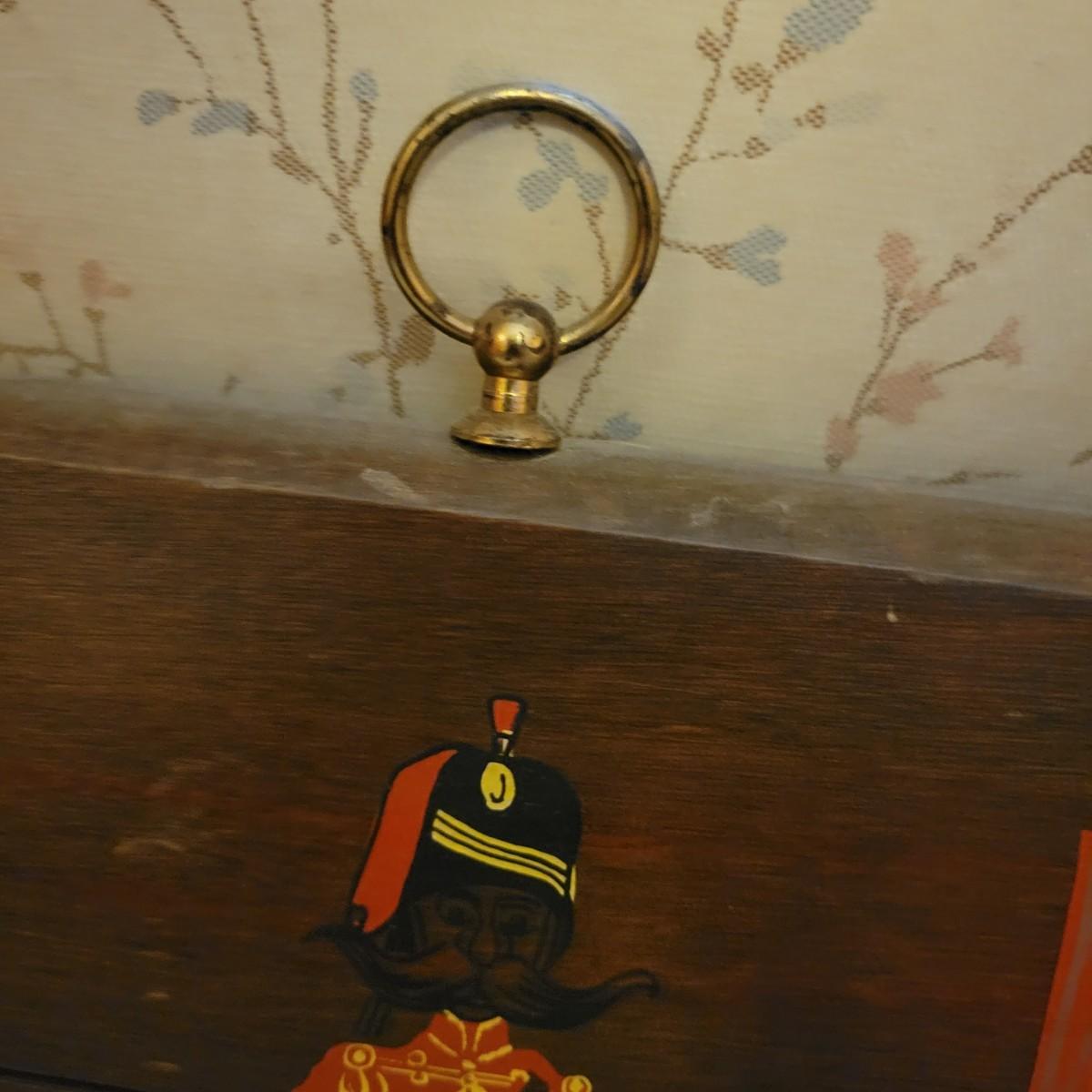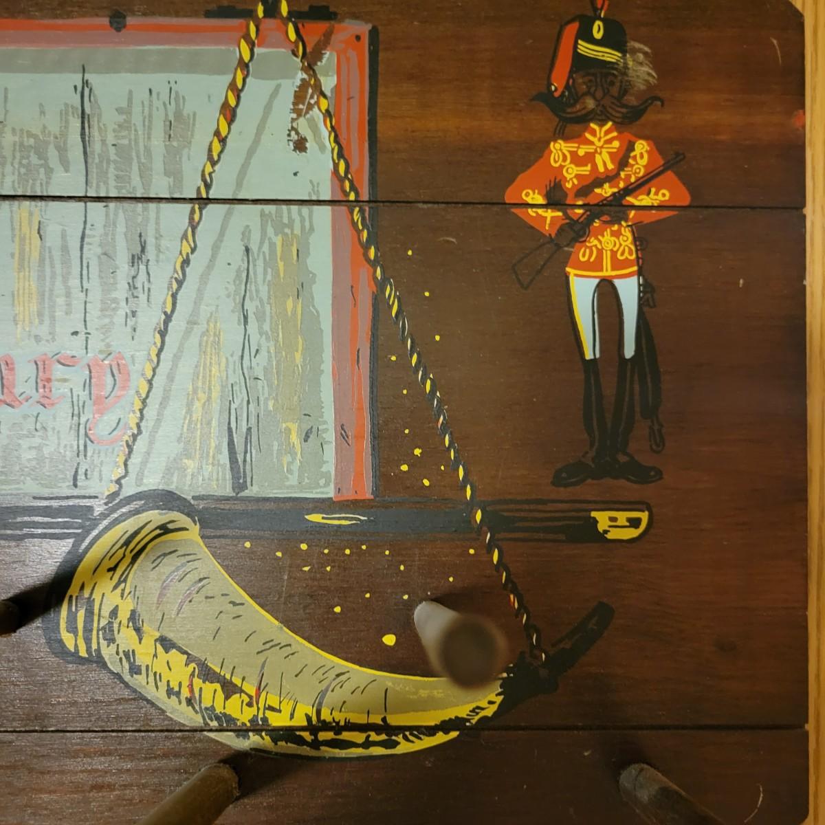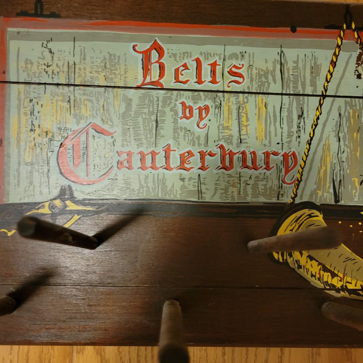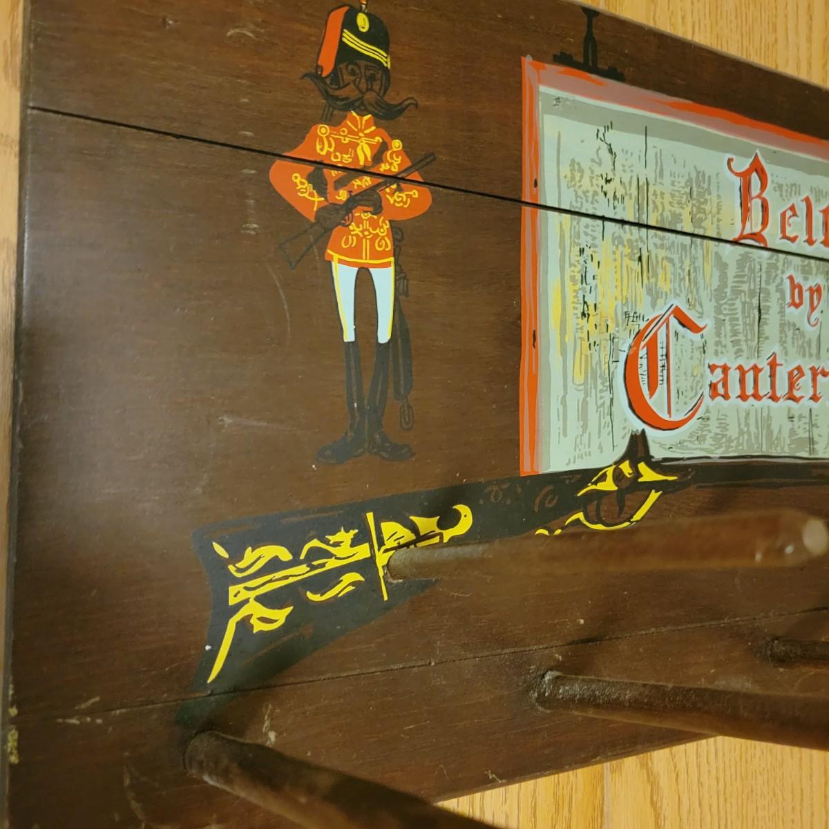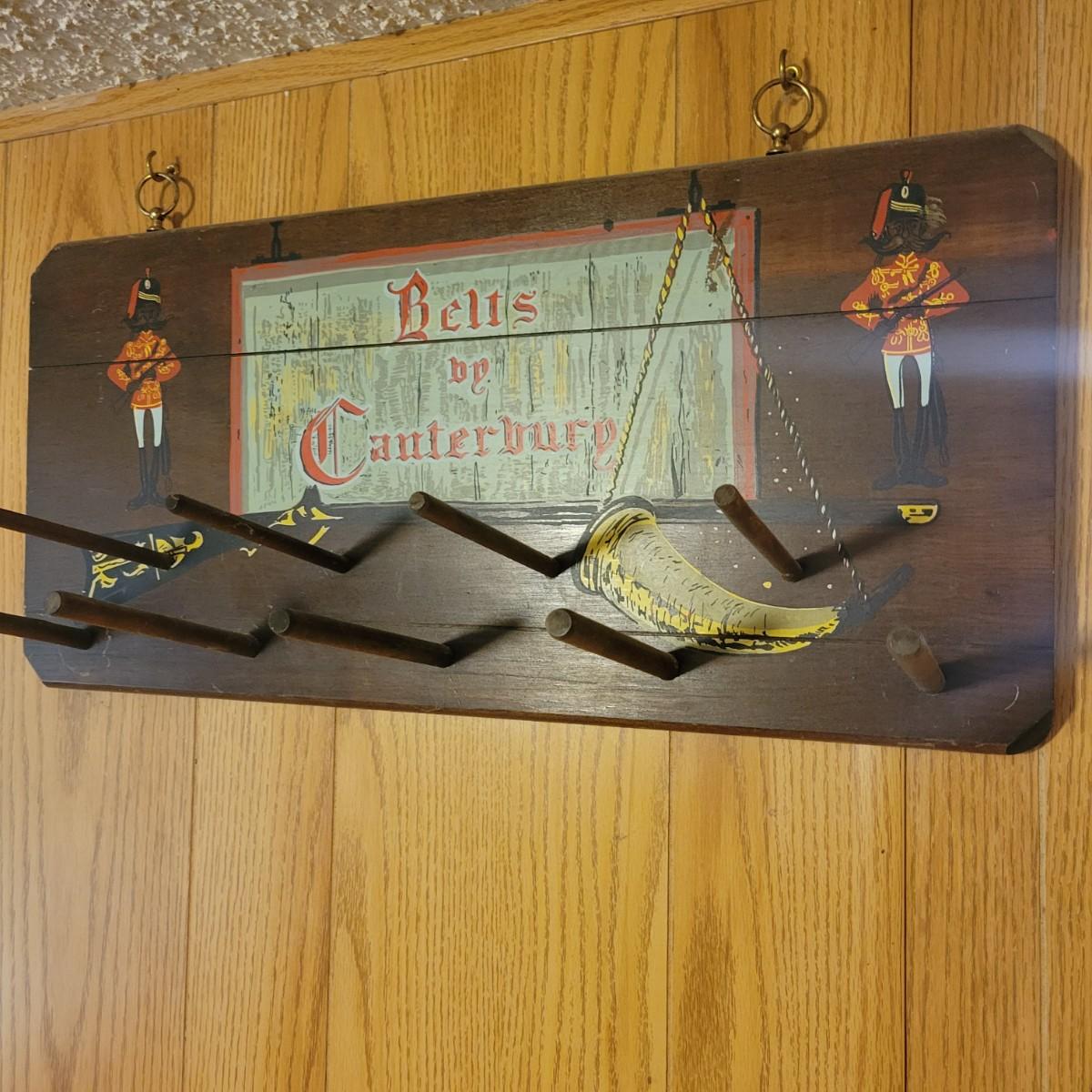 A wooden rack for hanging a variety of items in good condition with no notable damage. Piece is made of wood and appears to be hand painted. Includes brass hangers at its top. Measures approximately 24" x 11" x 1" Shipping available