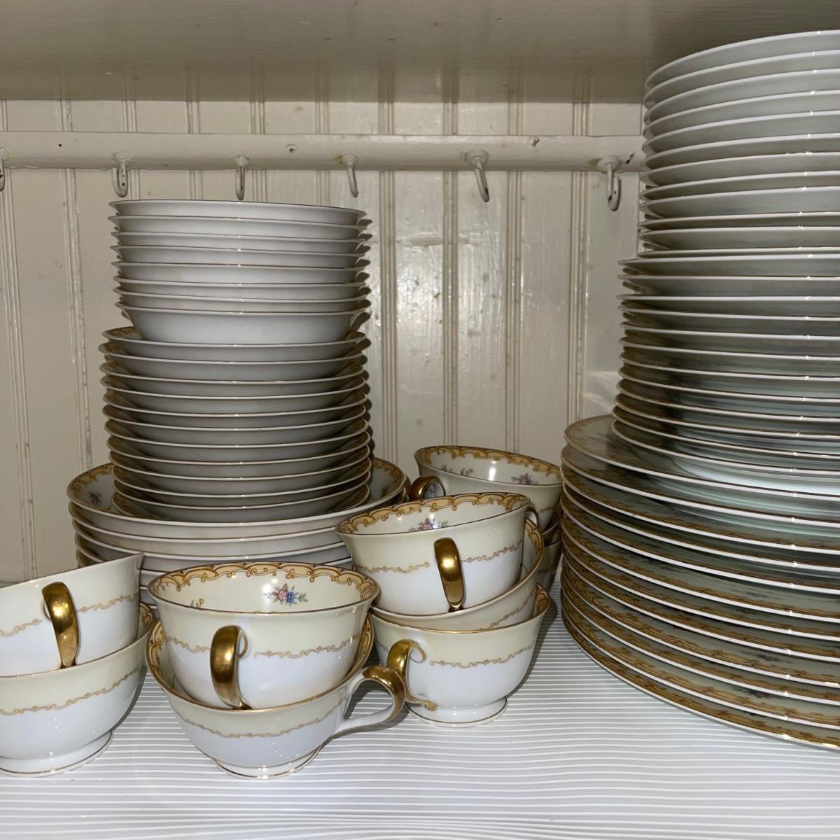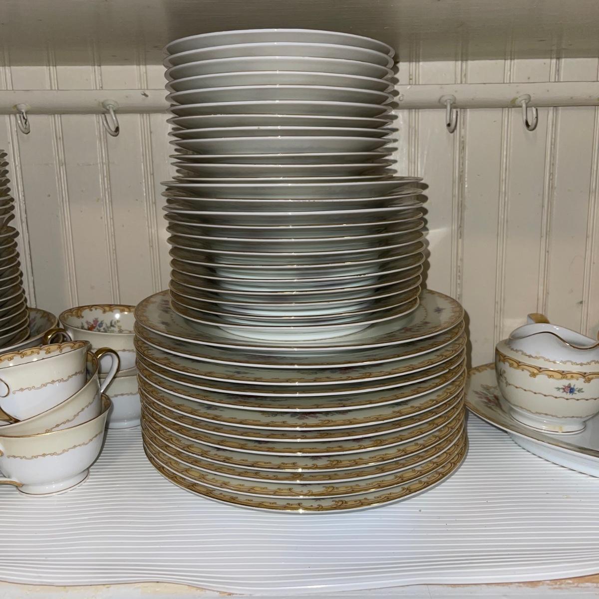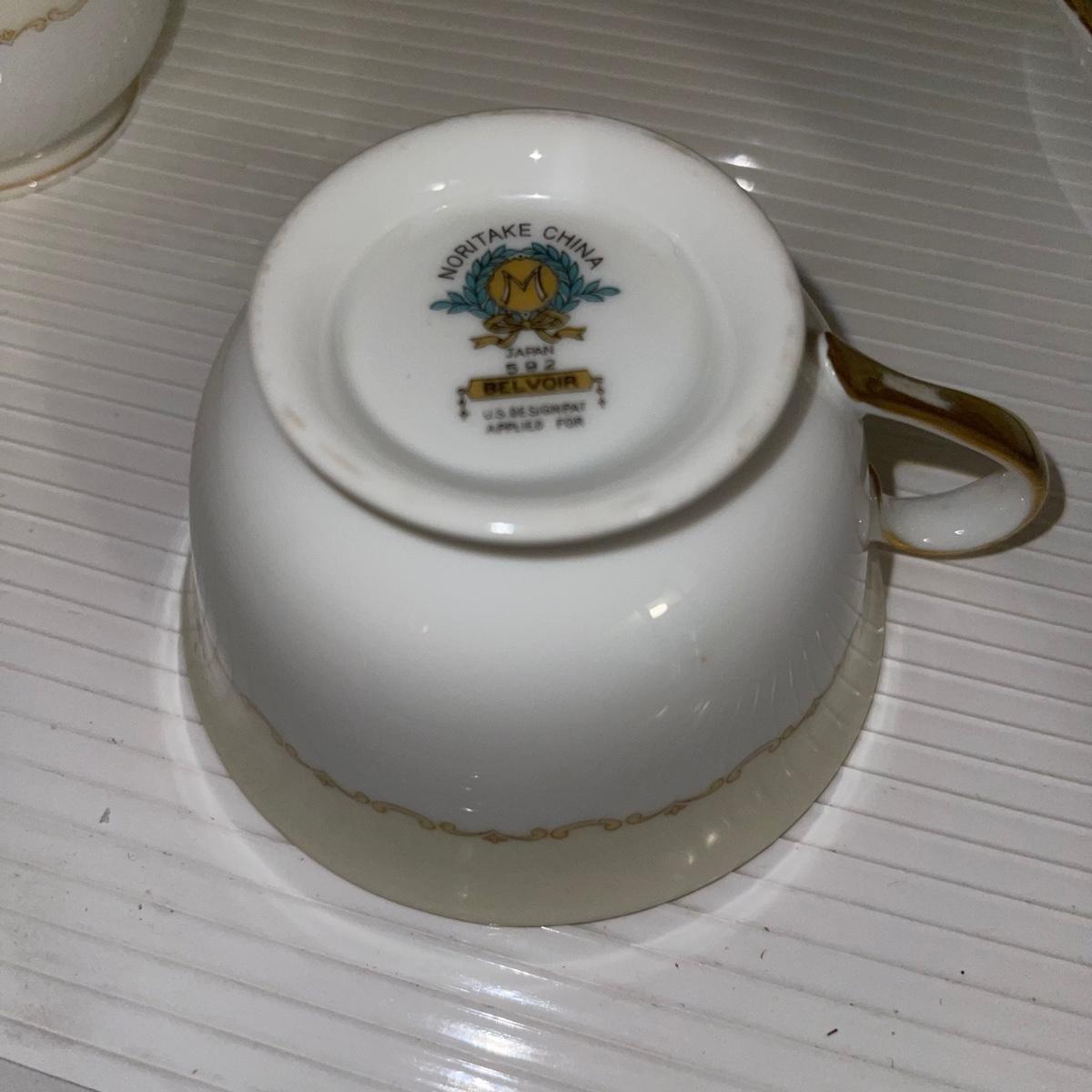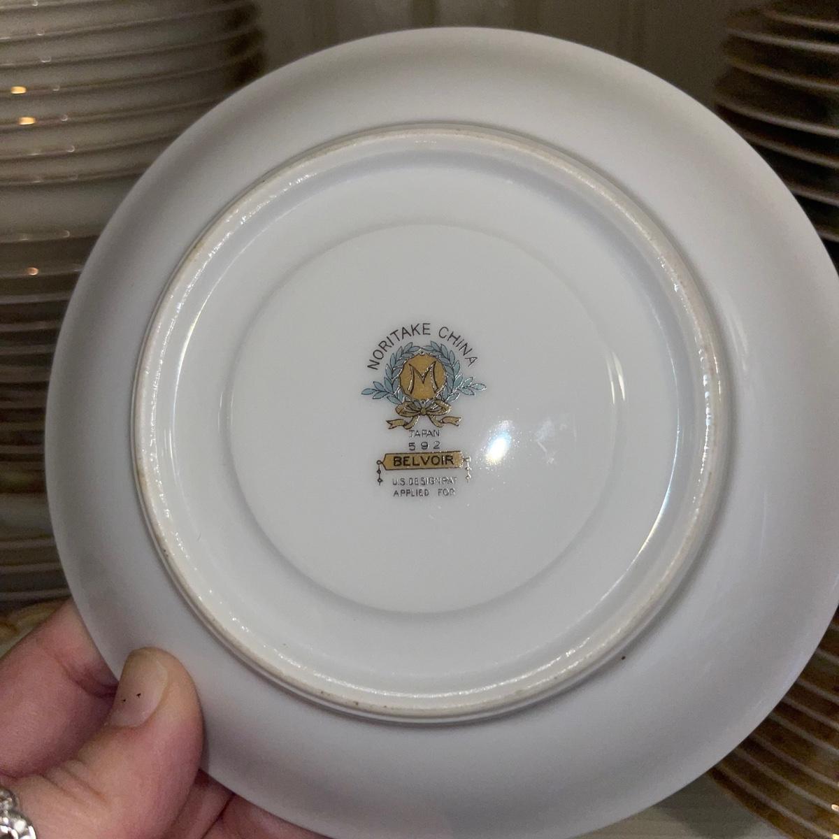 In this large lot, there are 10 teacups, 8 bowls, 12 saucers, 8 small dishes, 12 dinner plates, 12 salad plates, 12 small plates, a serving tray, a cream pitcher, a sugar bowl, and two nesting serving dishes. The set is Belvoir Noritake China and it was made in Japan.