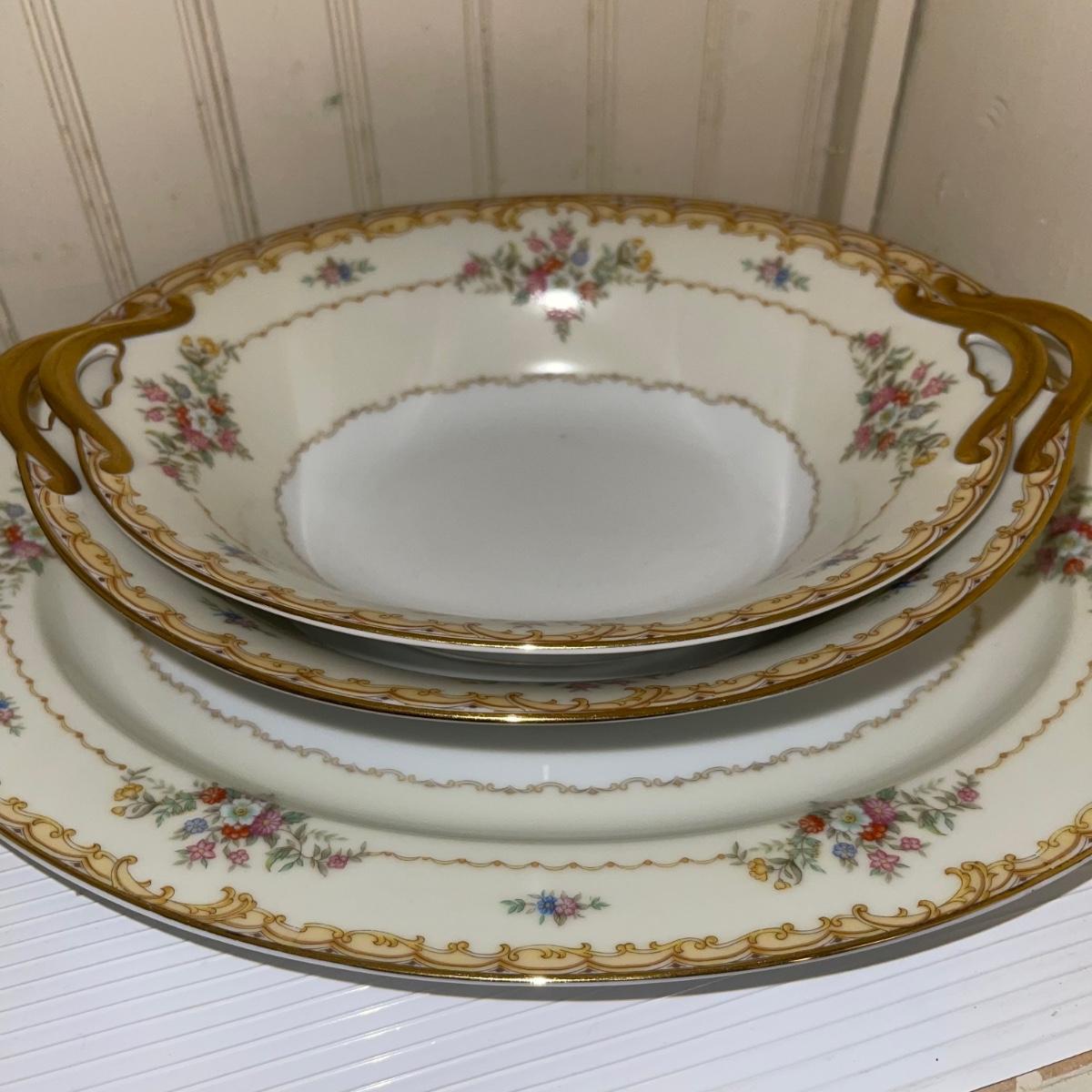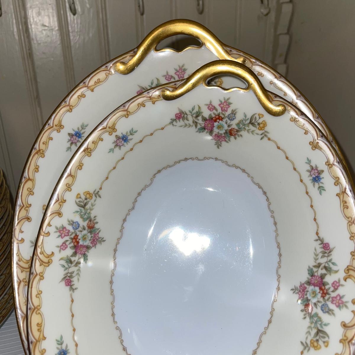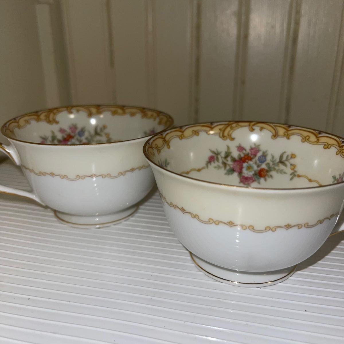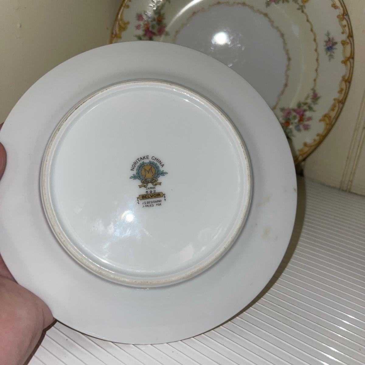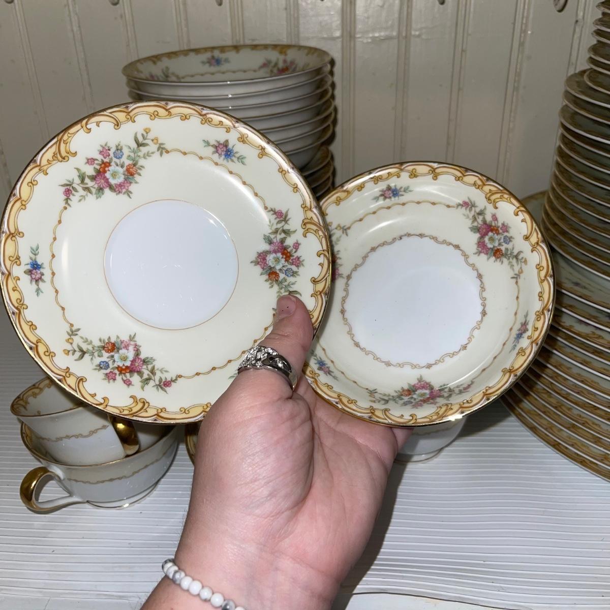 In this large lot, there are 10 teacups, 8 bowls, 12 saucers, 8 small dishes, 12 dinner plates, 12 salad plates, 12 small plates, a serving tray, a cream pitcher, a sugar bowl, and two nesting serving dishes. The set is Belvoir Noritake China and it was made in Japan.