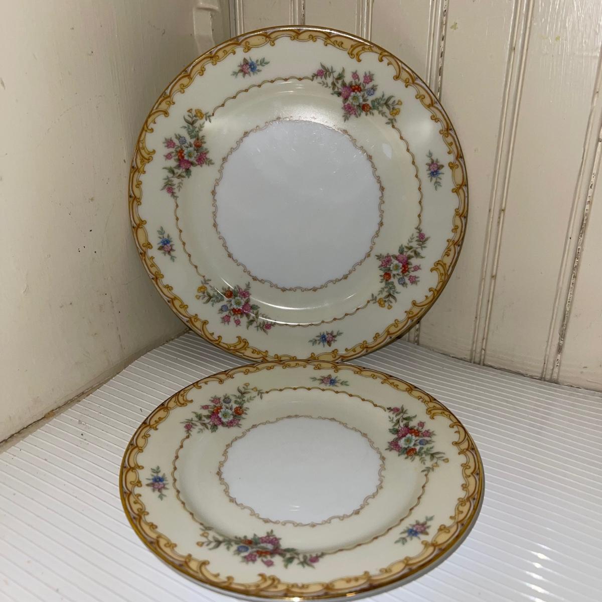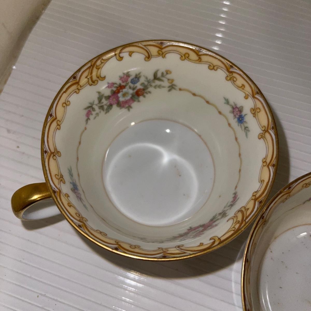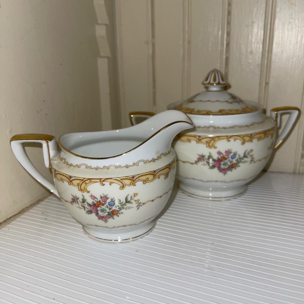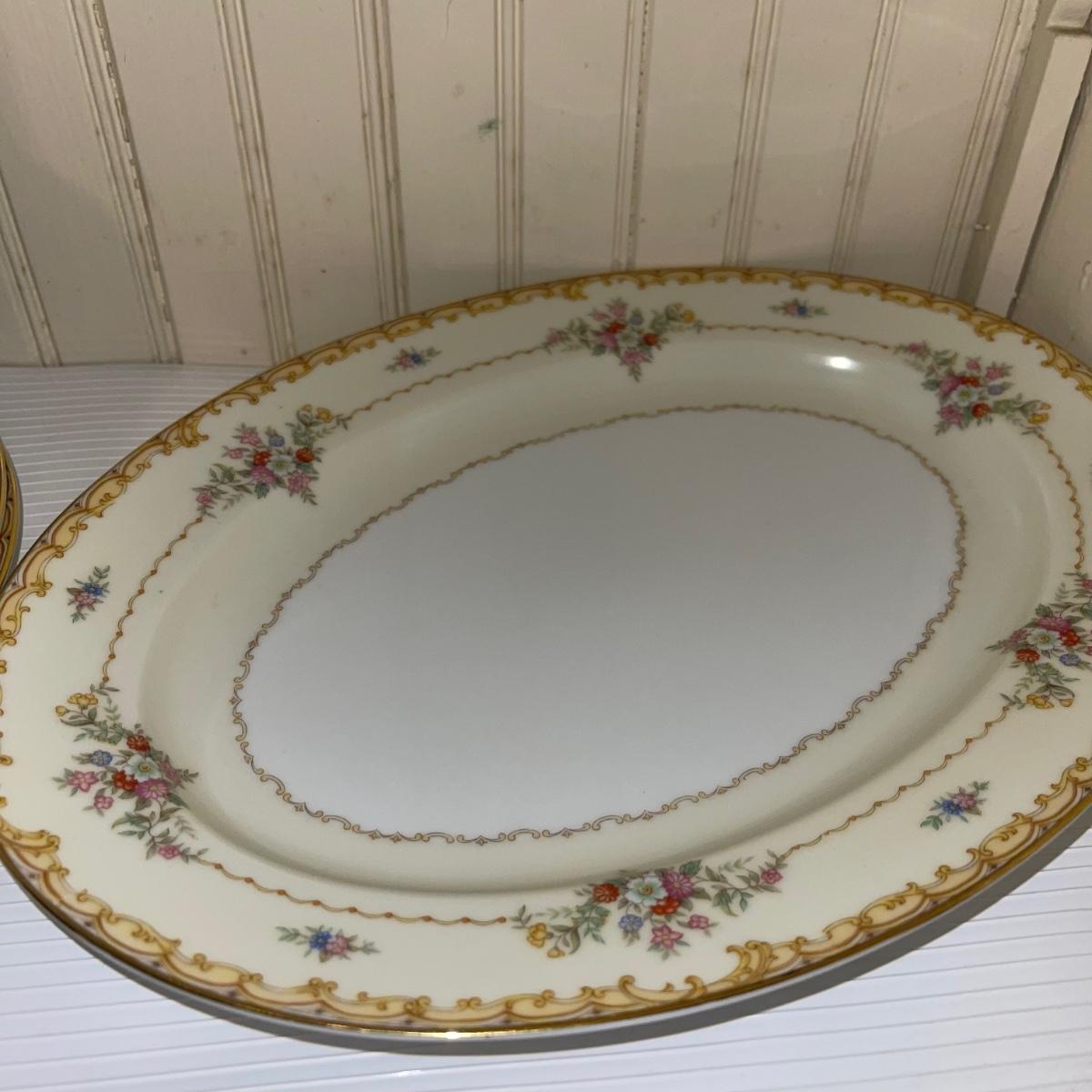 In this large lot, there are 10 teacups, 8 bowls, 12 saucers, 8 small dishes, 12 dinner plates, 12 salad plates, 12 small plates, a serving tray, a cream pitcher, a sugar bowl, and two nesting serving dishes. The set is Belvoir Noritake China and it was made in Japan.