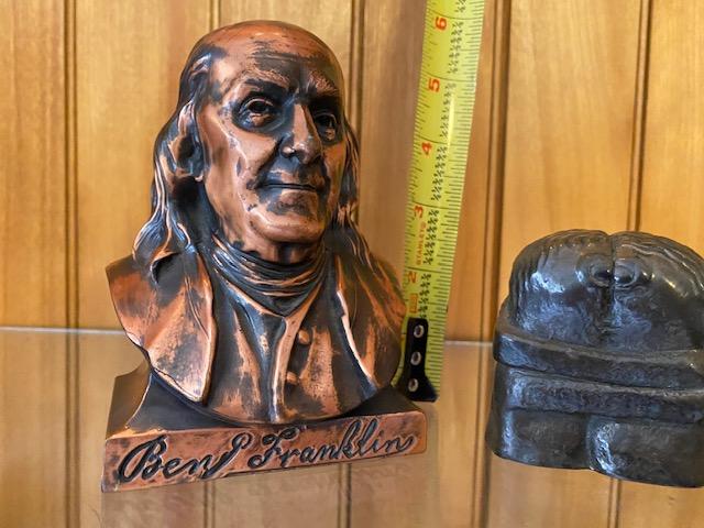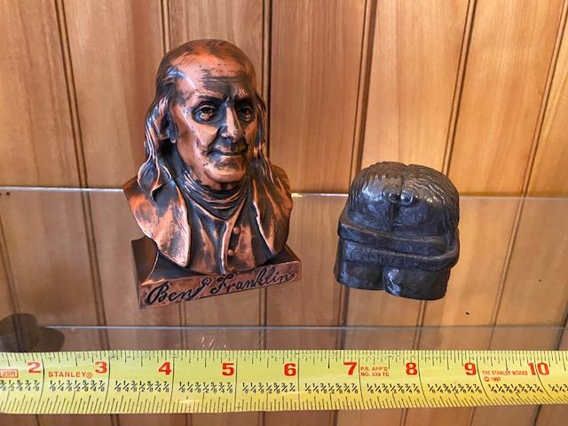 Benjamin Franklin Bust metal bank and a strange statue called "Love" from Wild Goose Studios.