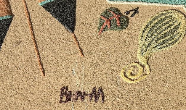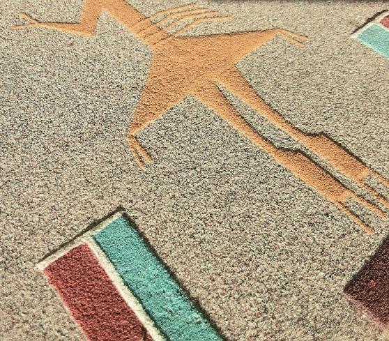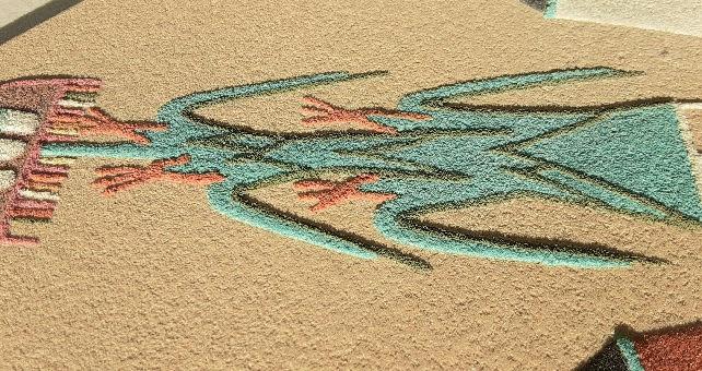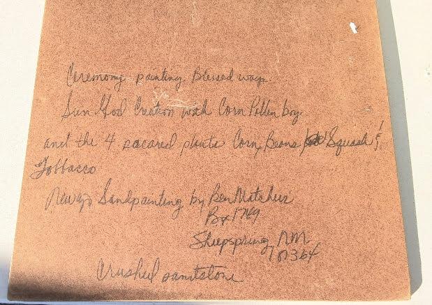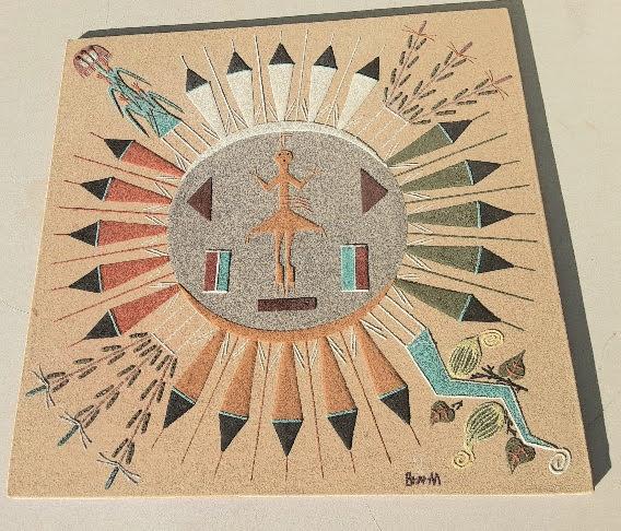 A "Blessing" crushed sandstone painting on wood. Shiprock New Mexico. Slight scuff on signature. Measures 16 by 16in.