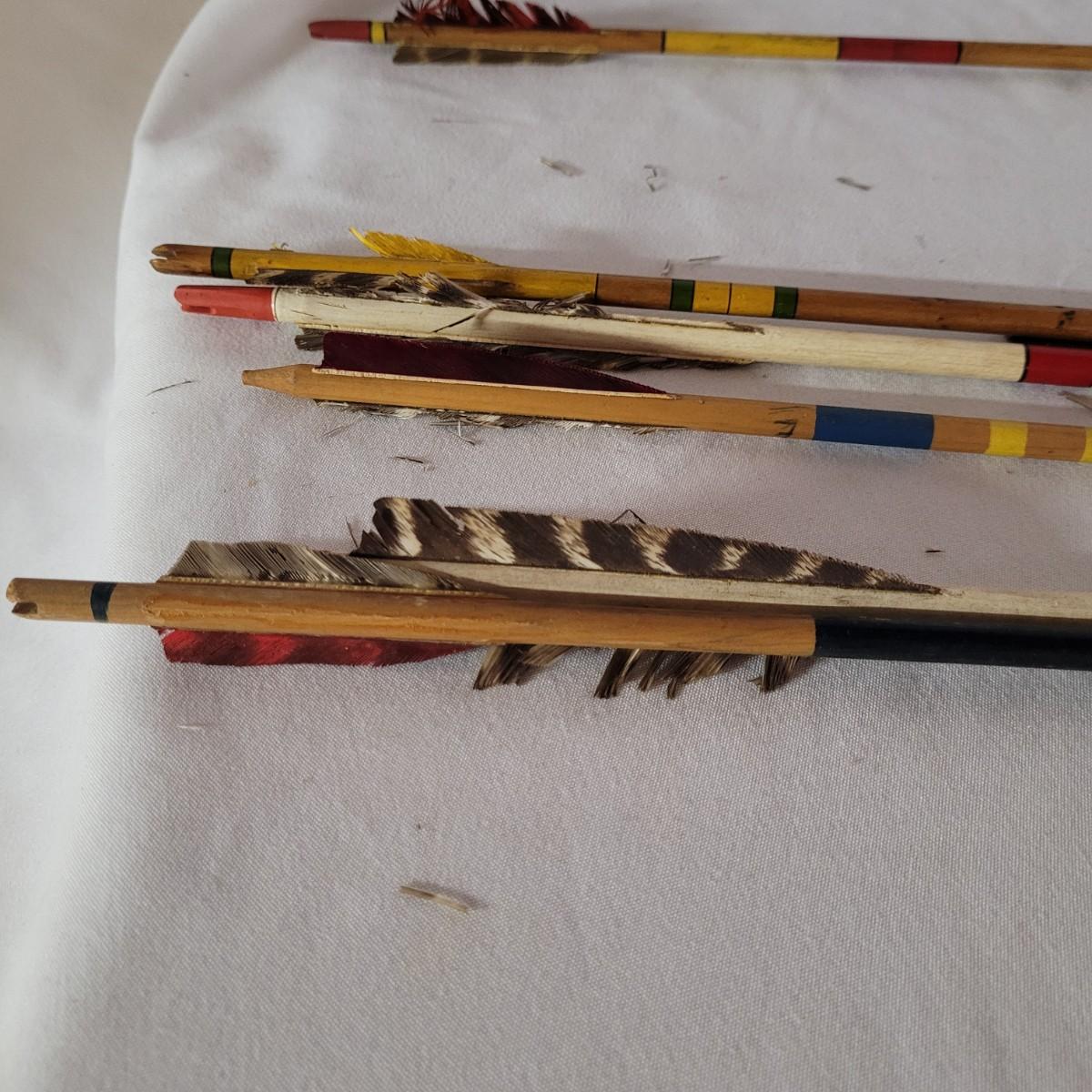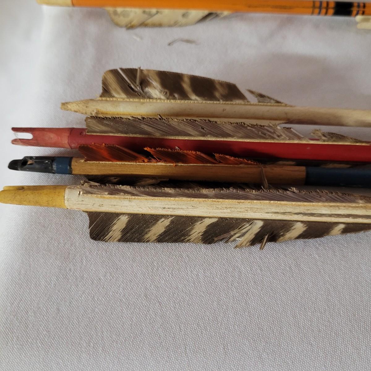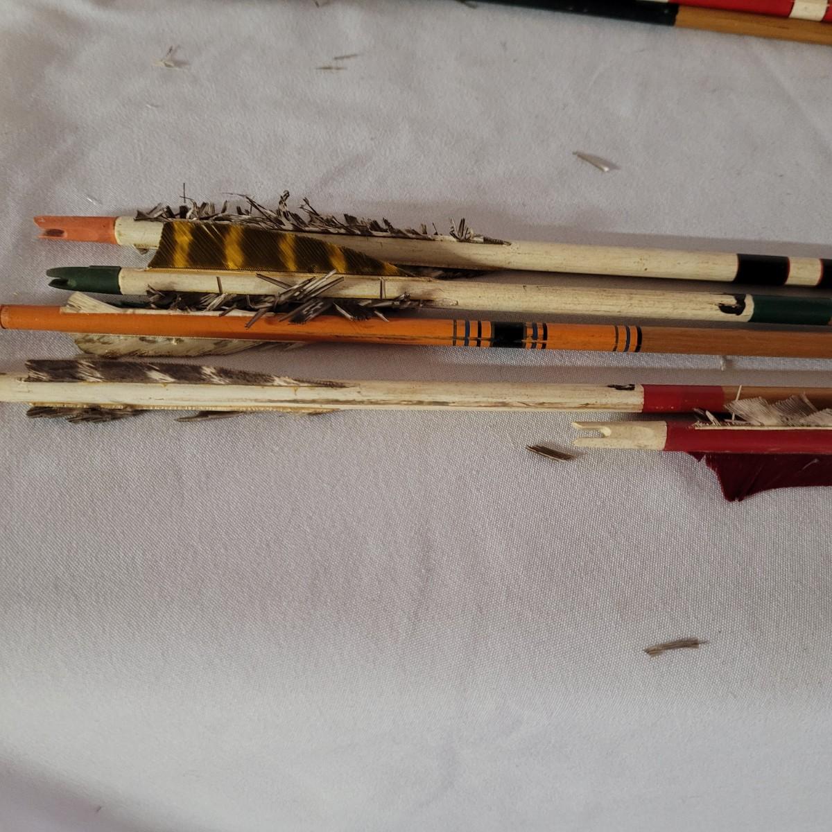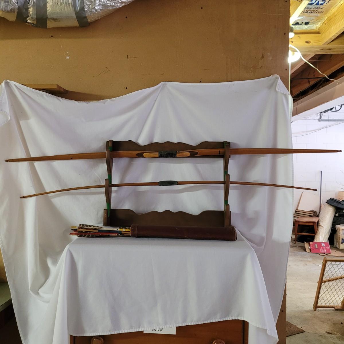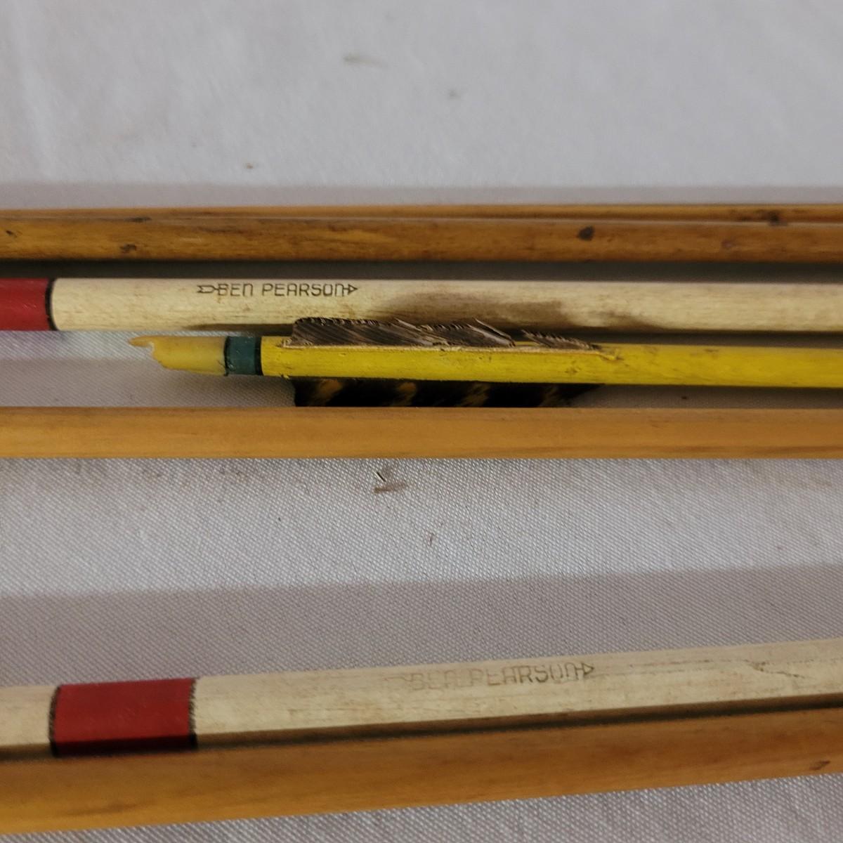 Two wooden long bows, longer one confirmed Ben Pearson with logo measures approximately 67", shorter one with no logo but engraved "30" measures approximately 60". Arrows very used, many with broken tips (see photos). Rack in good condition, quiver in poor condition with large tear at bottom and broken loop. Shipping available.