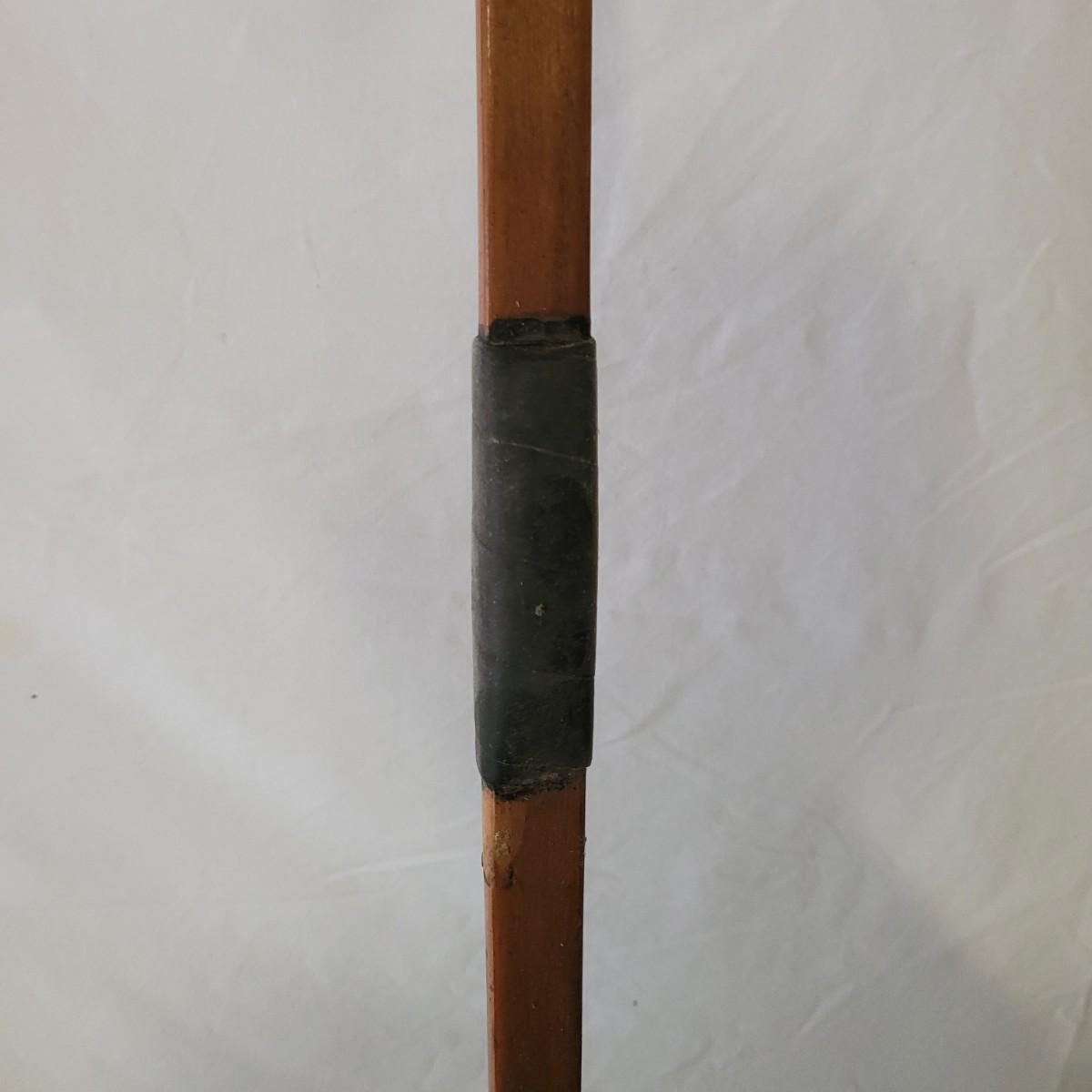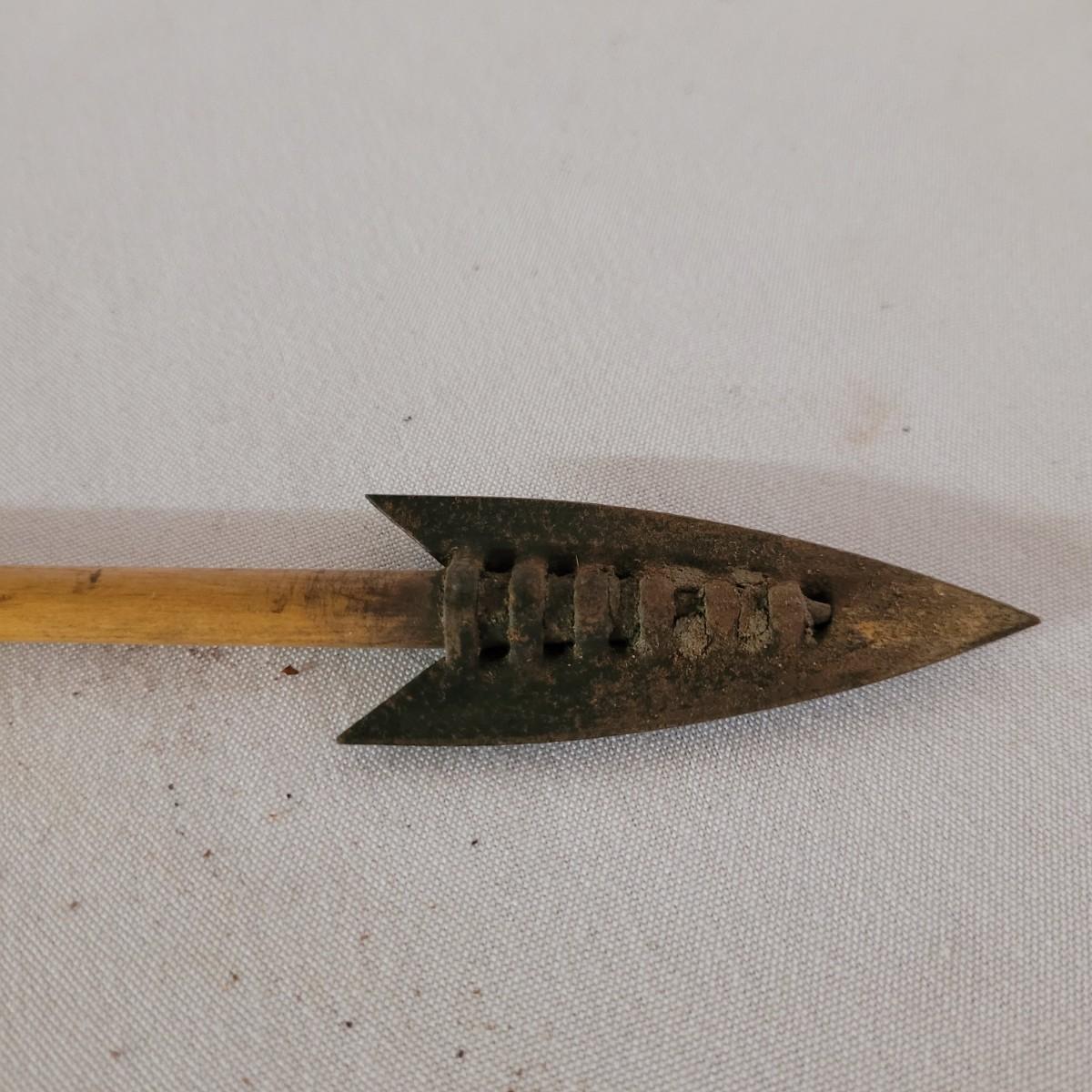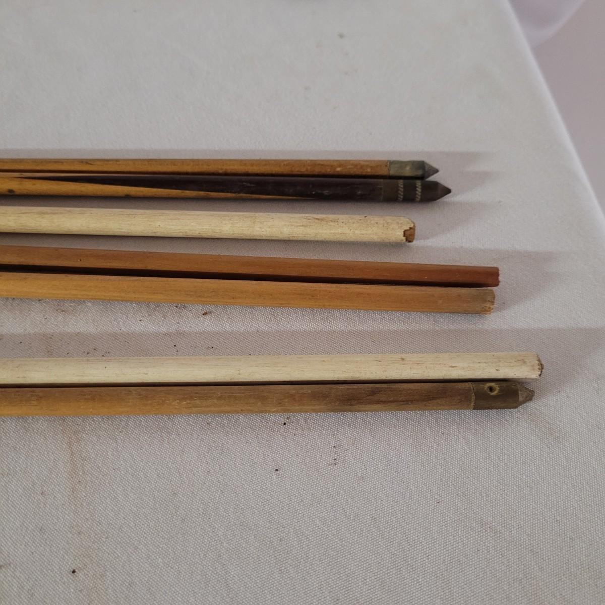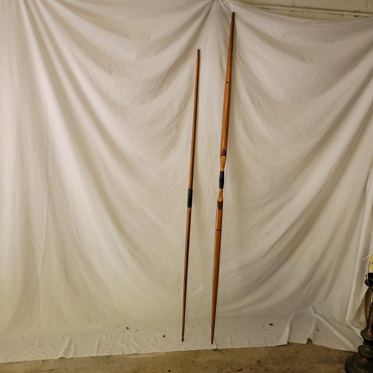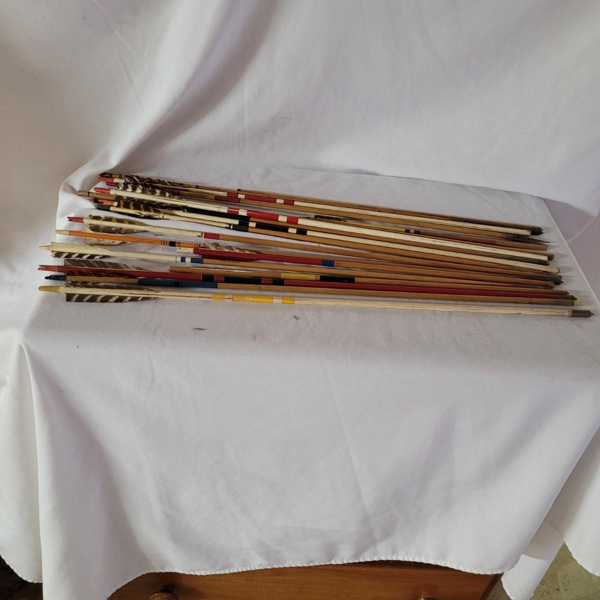 Two wooden long bows, longer one confirmed Ben Pearson with logo measures approximately 67", shorter one with no logo but engraved "30" measures approximately 60". Arrows very used, many with broken tips (see photos). Rack in good condition, quiver in poor condition with large tear at bottom and broken loop. Shipping available.