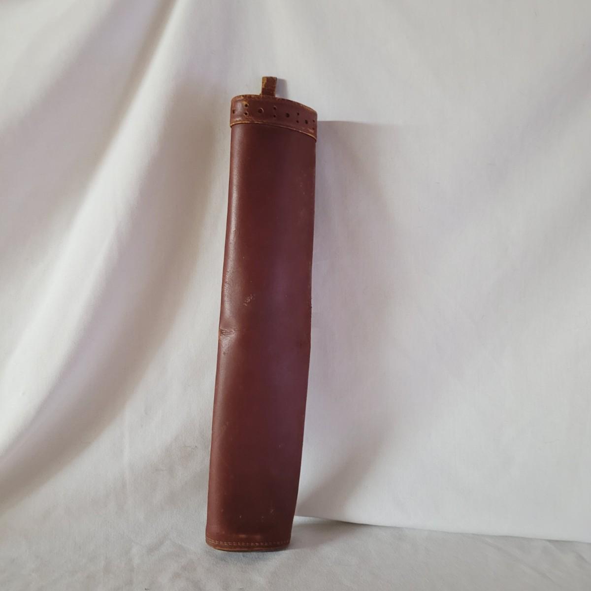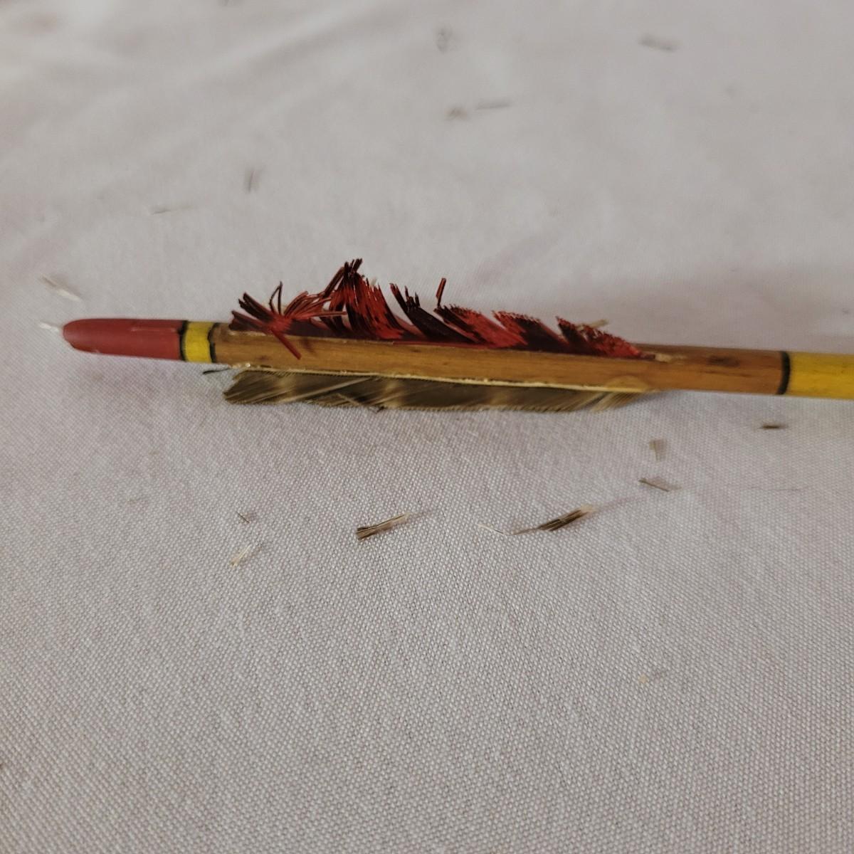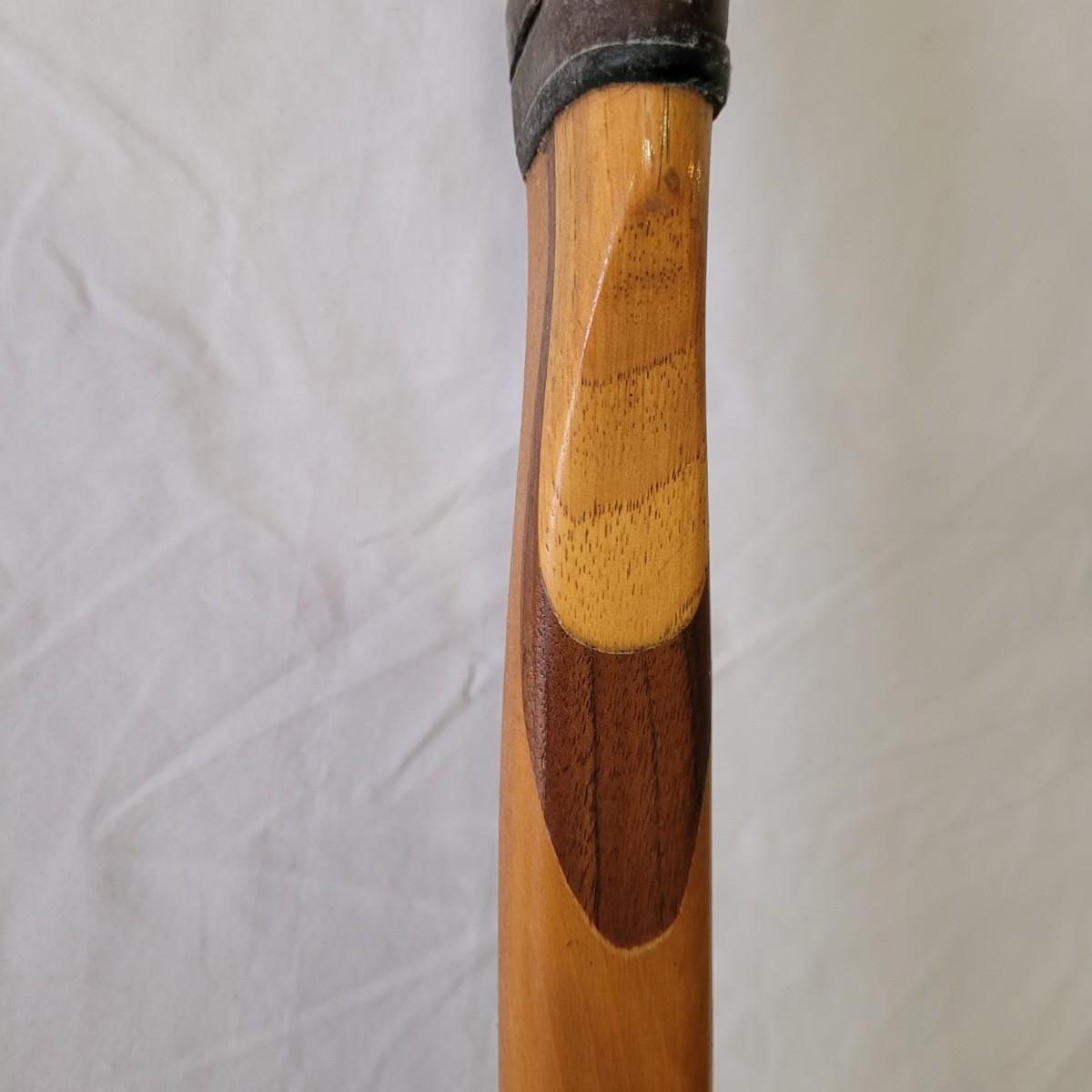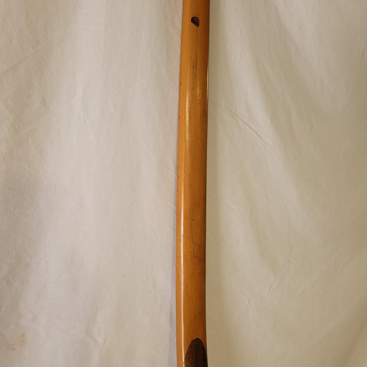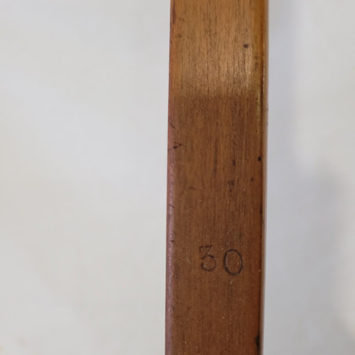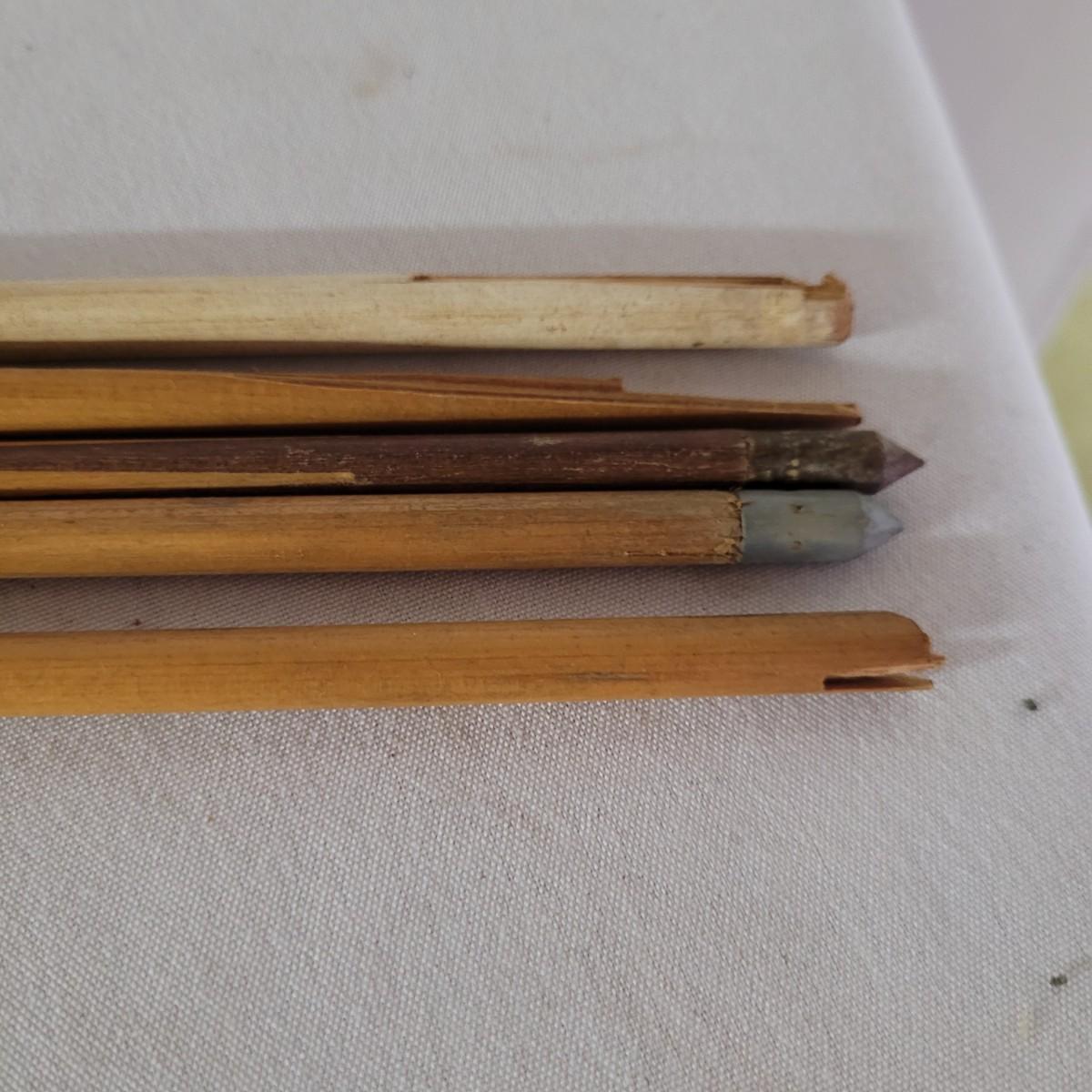 Two wooden long bows, longer one confirmed Ben Pearson with logo measures approximately 67", shorter one with no logo but engraved "30" measures approximately 60". Arrows very used, many with broken tips (see photos). Rack in good condition, quiver in poor condition with large tear at bottom and broken loop. Shipping available.