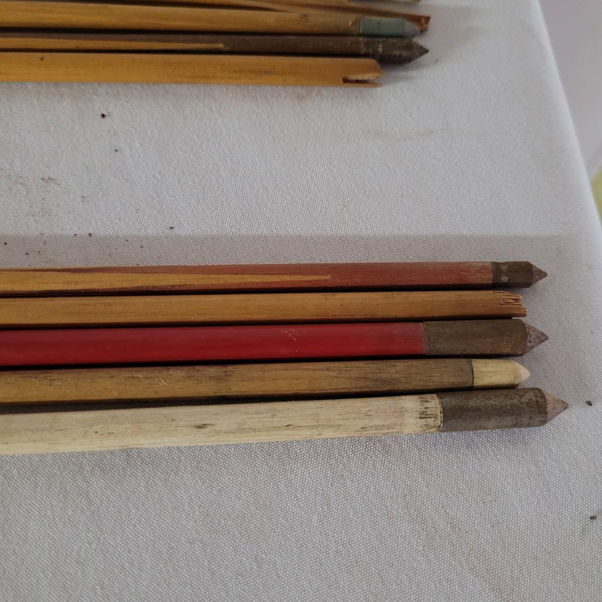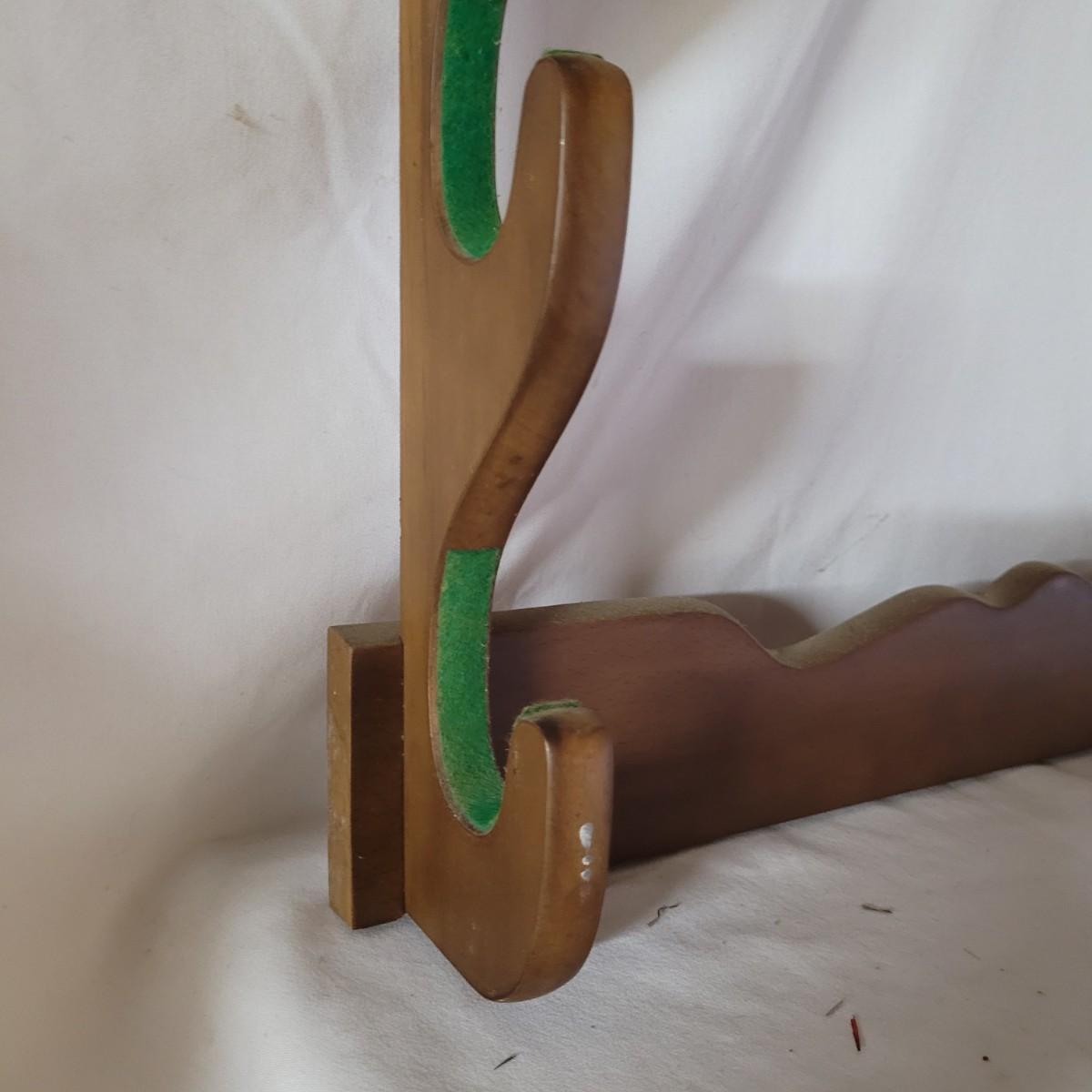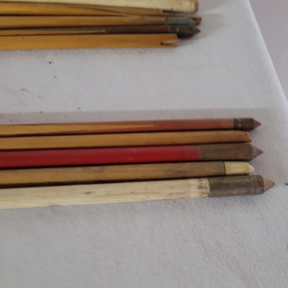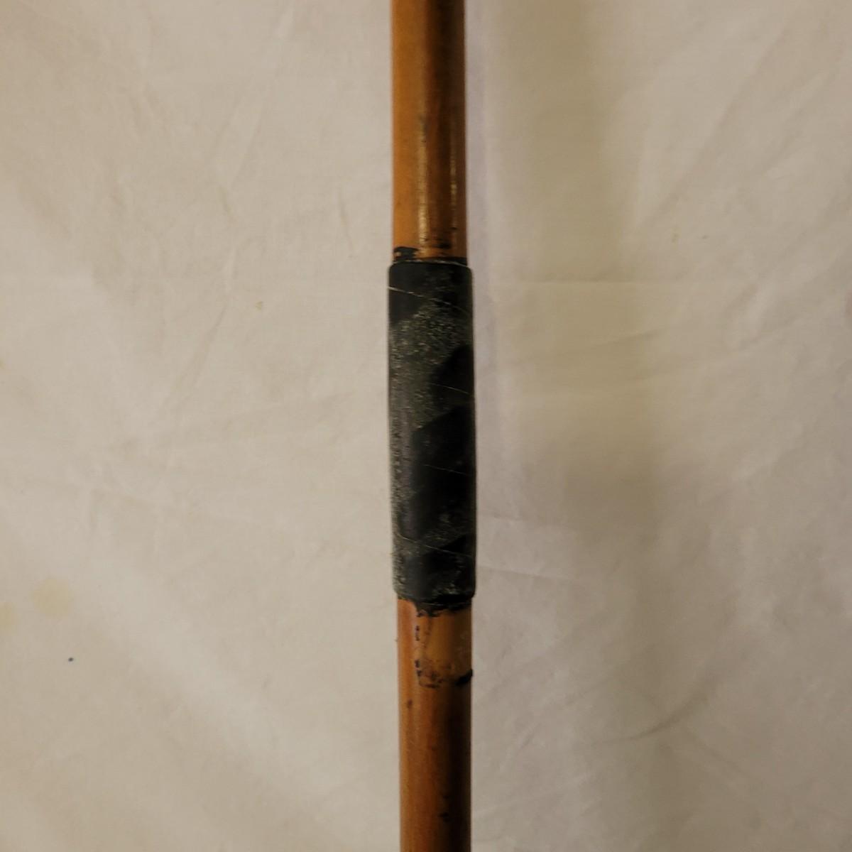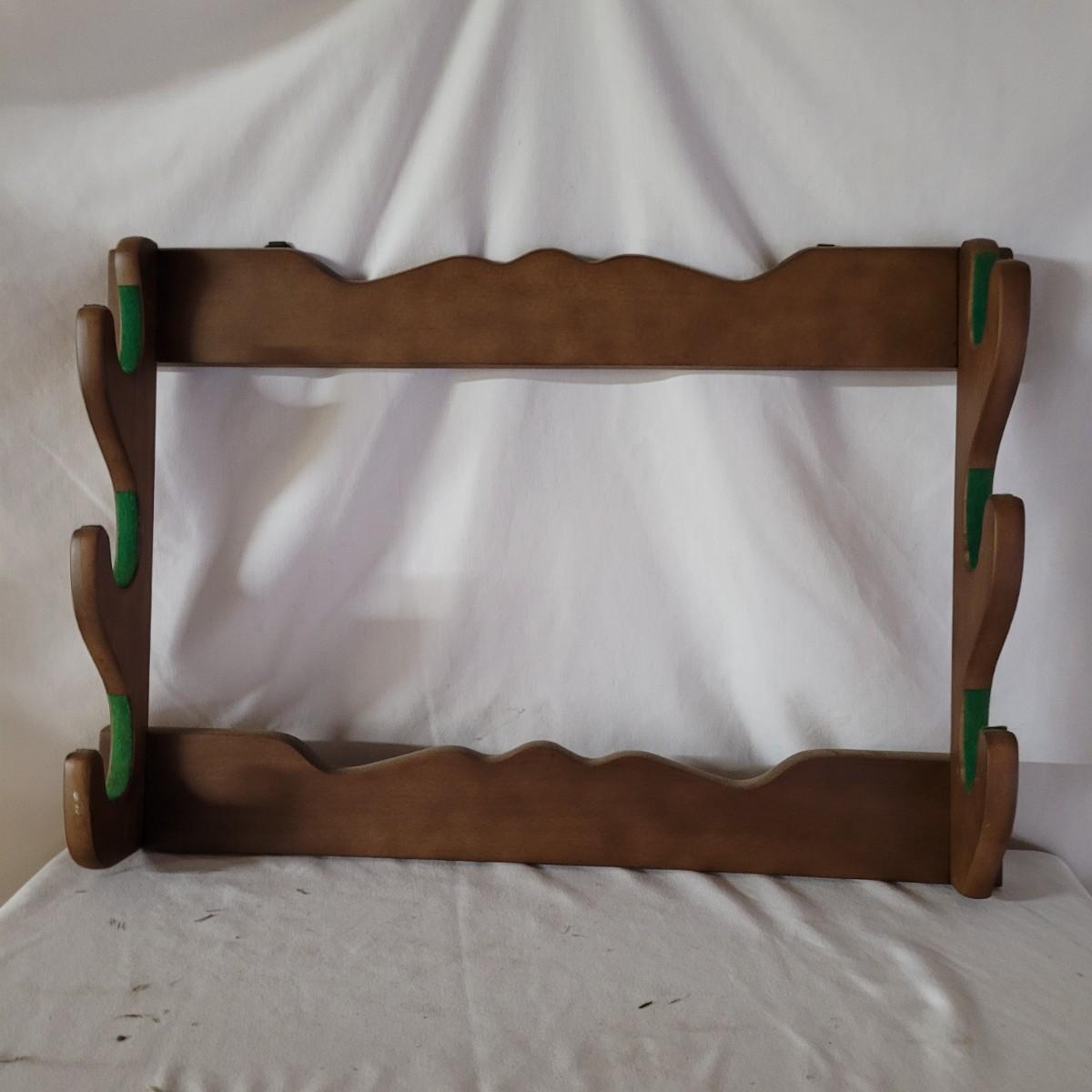 Two wooden long bows, longer one confirmed Ben Pearson with logo measures approximately 67", shorter one with no logo but engraved "30" measures approximately 60". Arrows very used, many with broken tips (see photos). Rack in good condition, quiver in poor condition with large tear at bottom and broken loop. Shipping available.