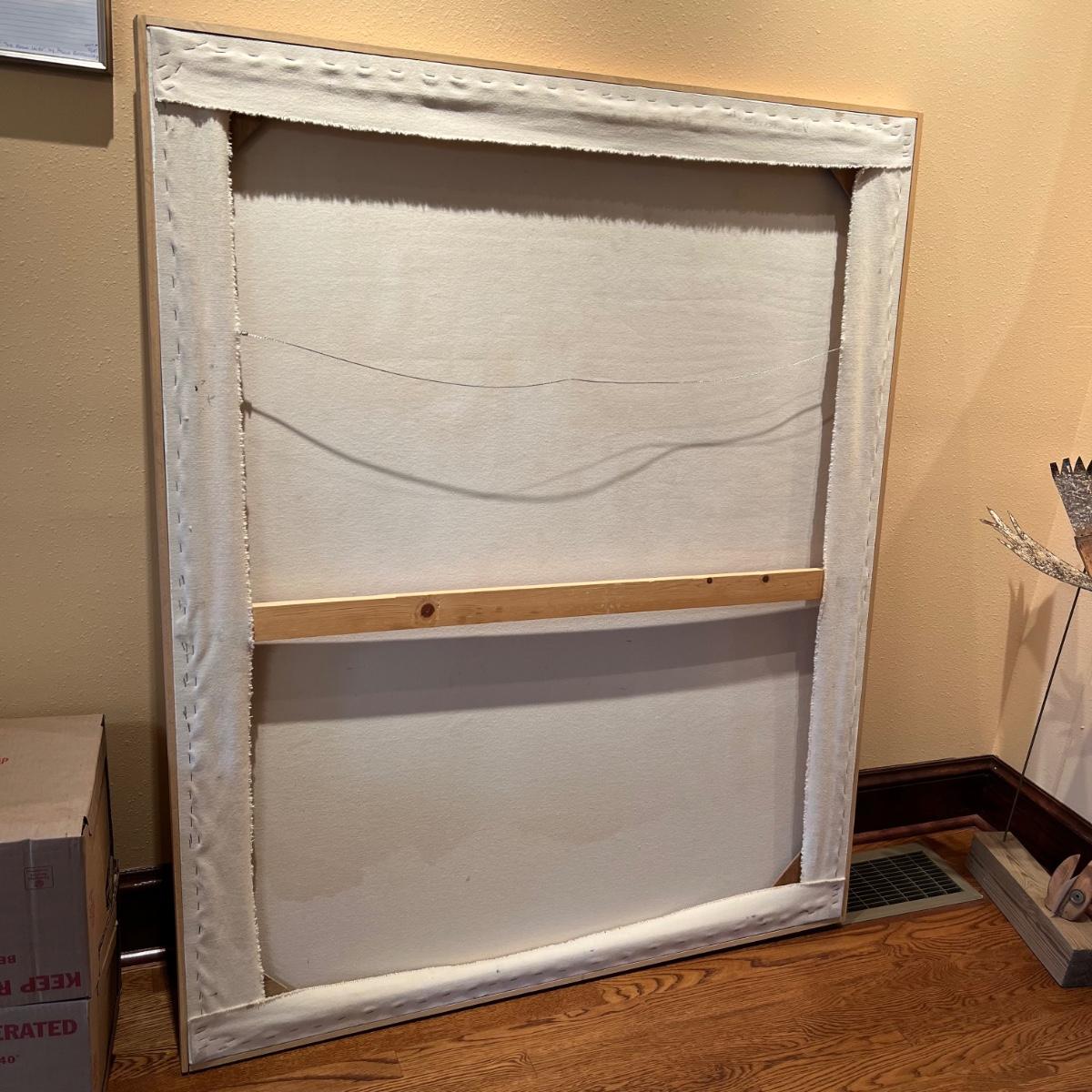 A striking acrylic painting on canvas which appears to be an original and is mounted in a wooden frame (no glass) which measures 40” x 2” x 59”H. Pen signed and dated in the bottom right corner. Price tag details artist and other information, see image.