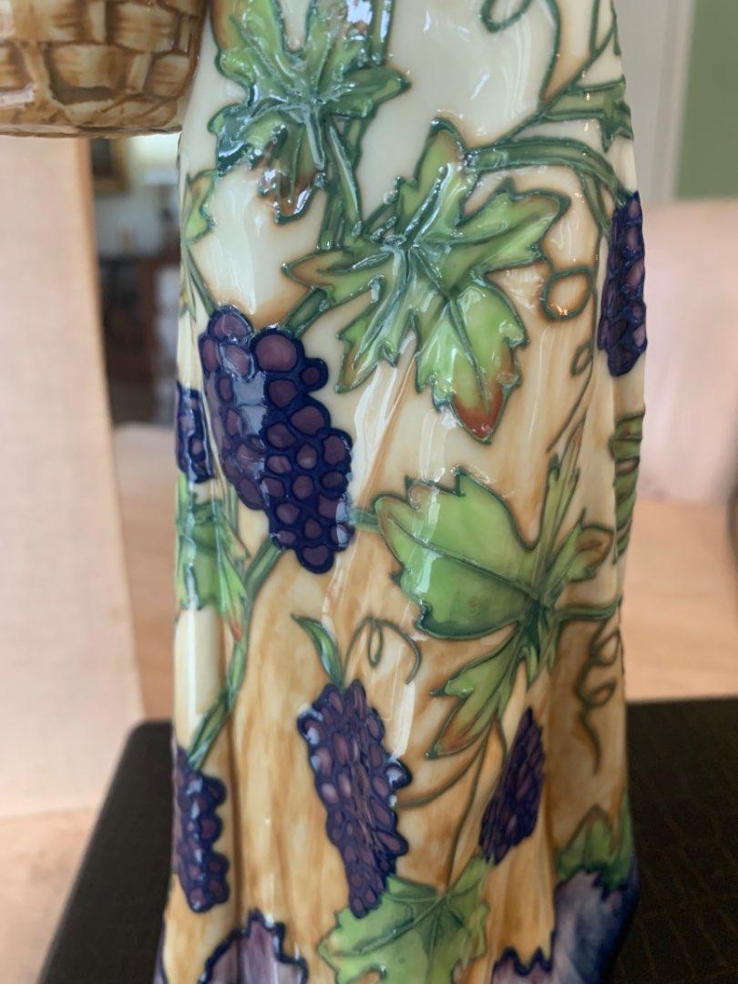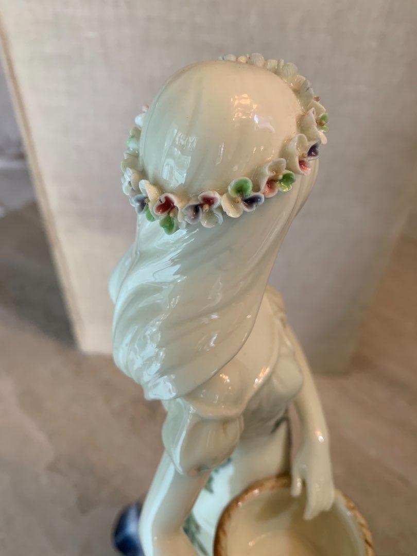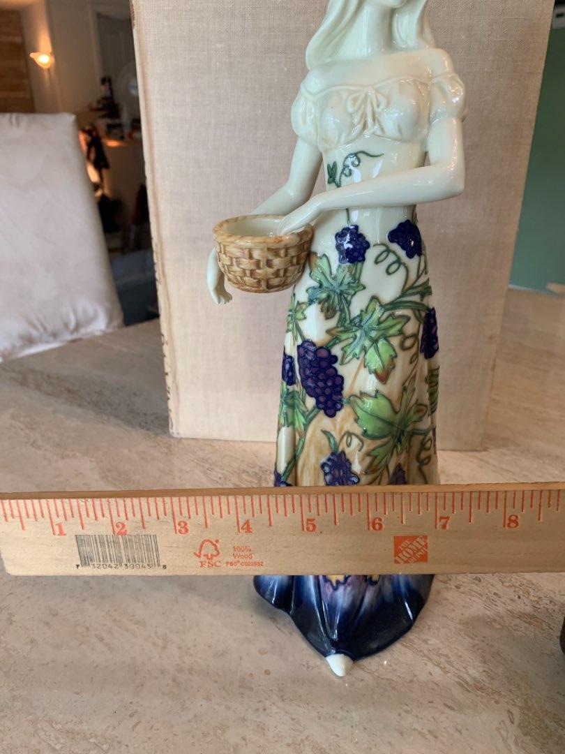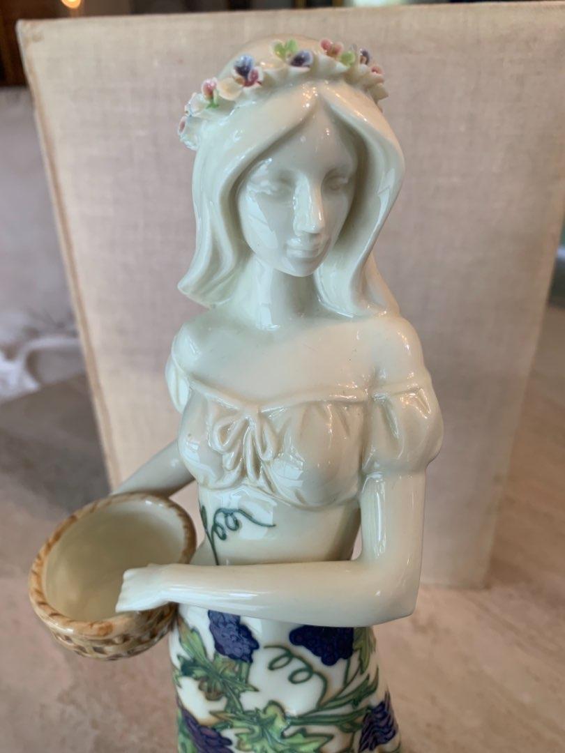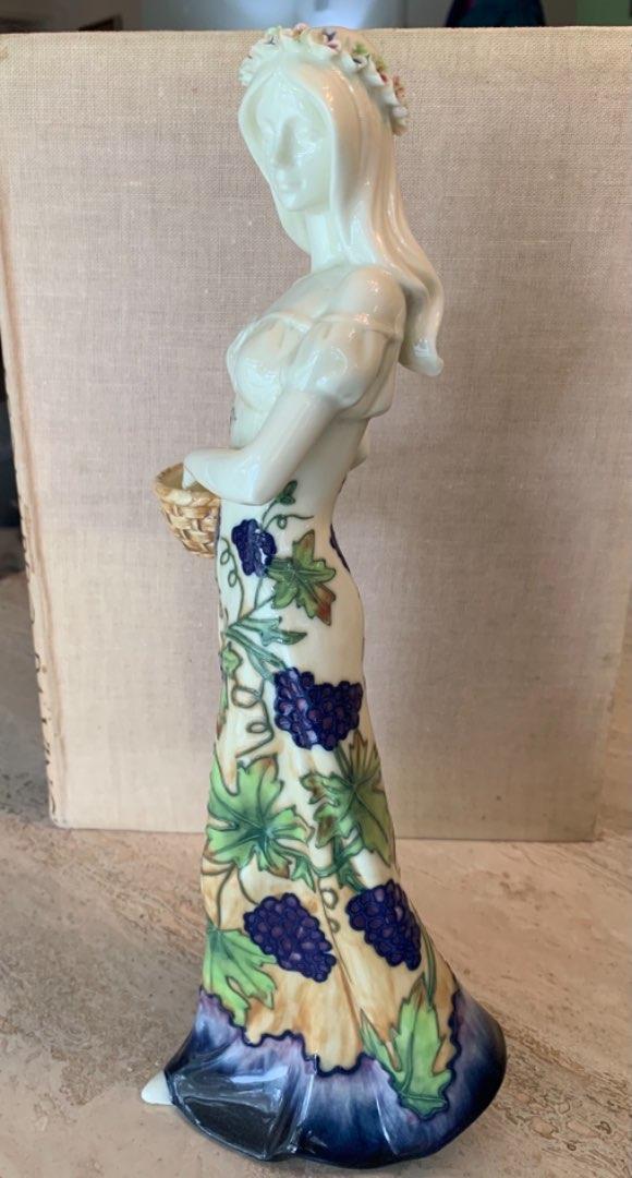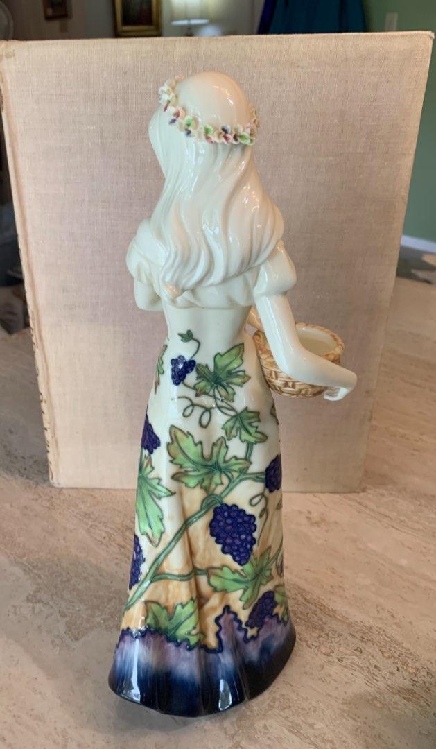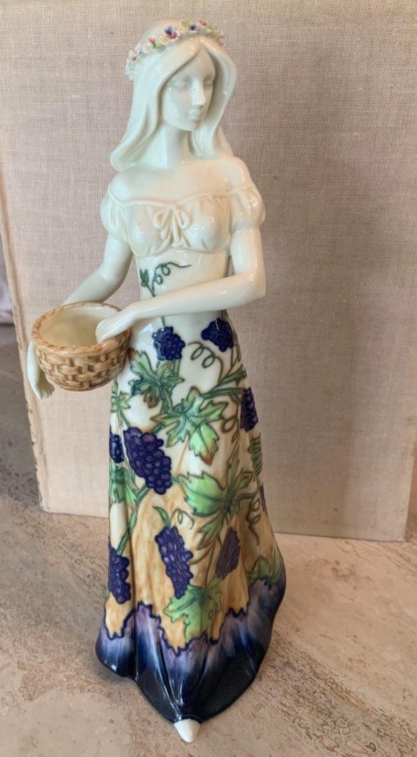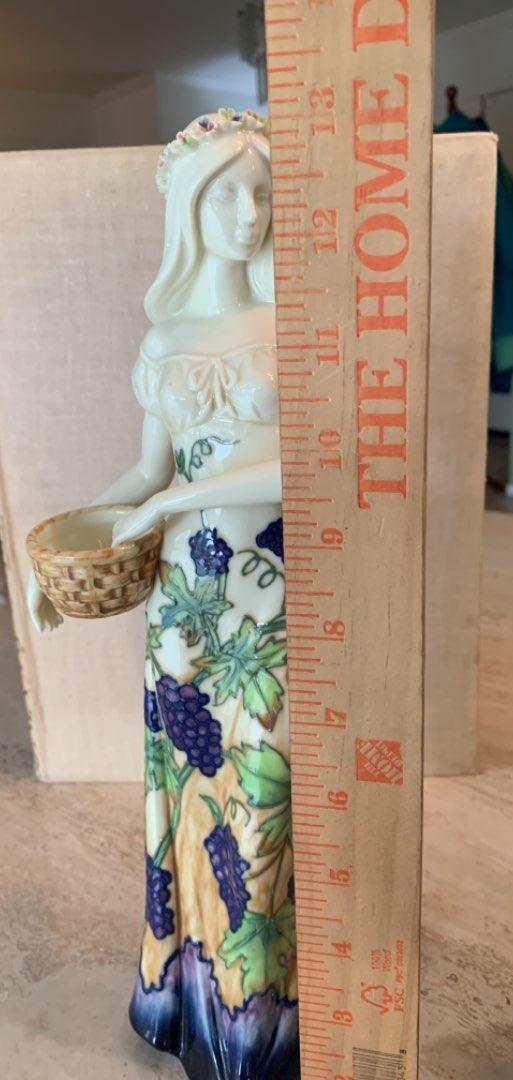 13" High Hand Painted Porcelain Figurine by Benaya, holding a basket, and her dress is adorned with grapes and vines.