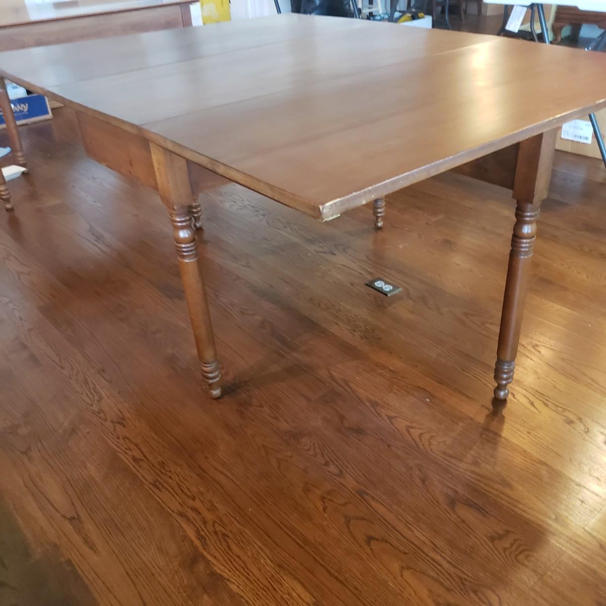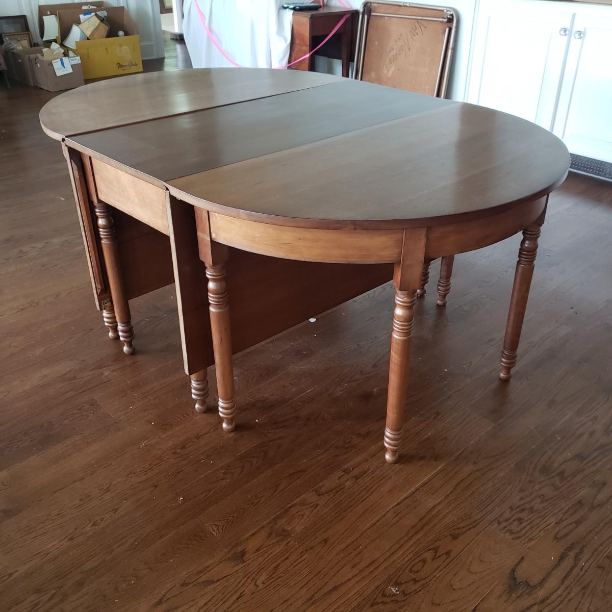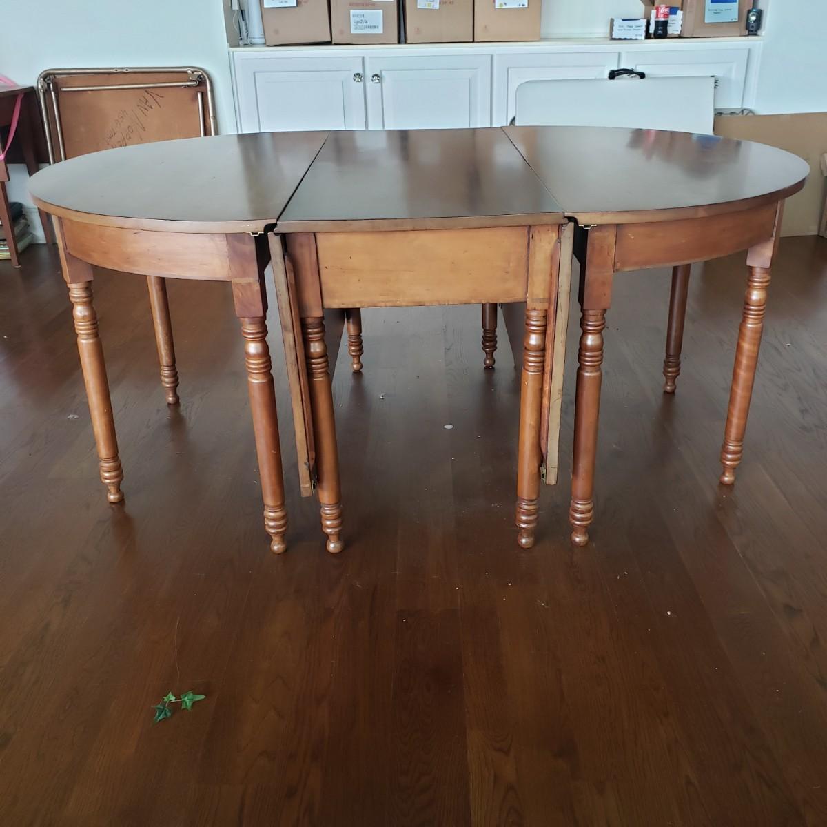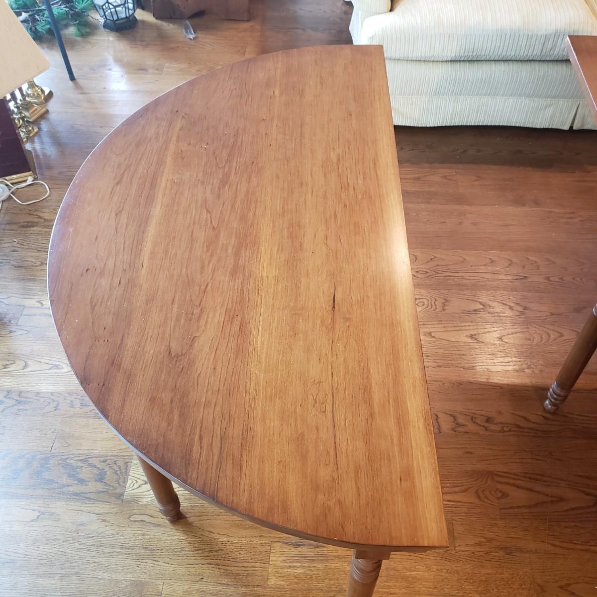 This Benbows wooden gate leg drop leaf table by itself with the sides open measures 63" x 47" x 30" H. In its closed position the table measures 21" x 47" x 30" H. The table comes with two demilune tables (25" x 47" x 30" H) that can be added to the main table either in its closed position or with the sides extended out. The entire table measures 113" extended out with the demilune tables on each end.. See pictures for details. According to the seller, this is a Benbow's table, but it has no markings so we cannot verify the brand.