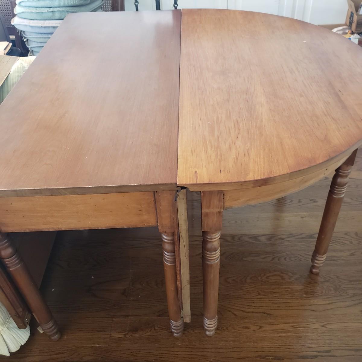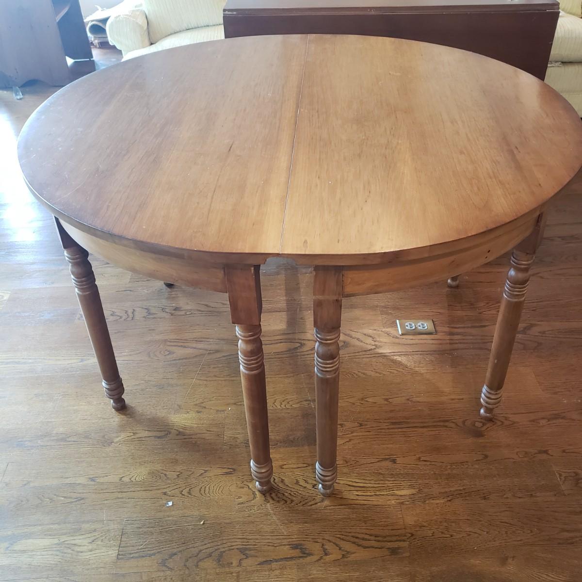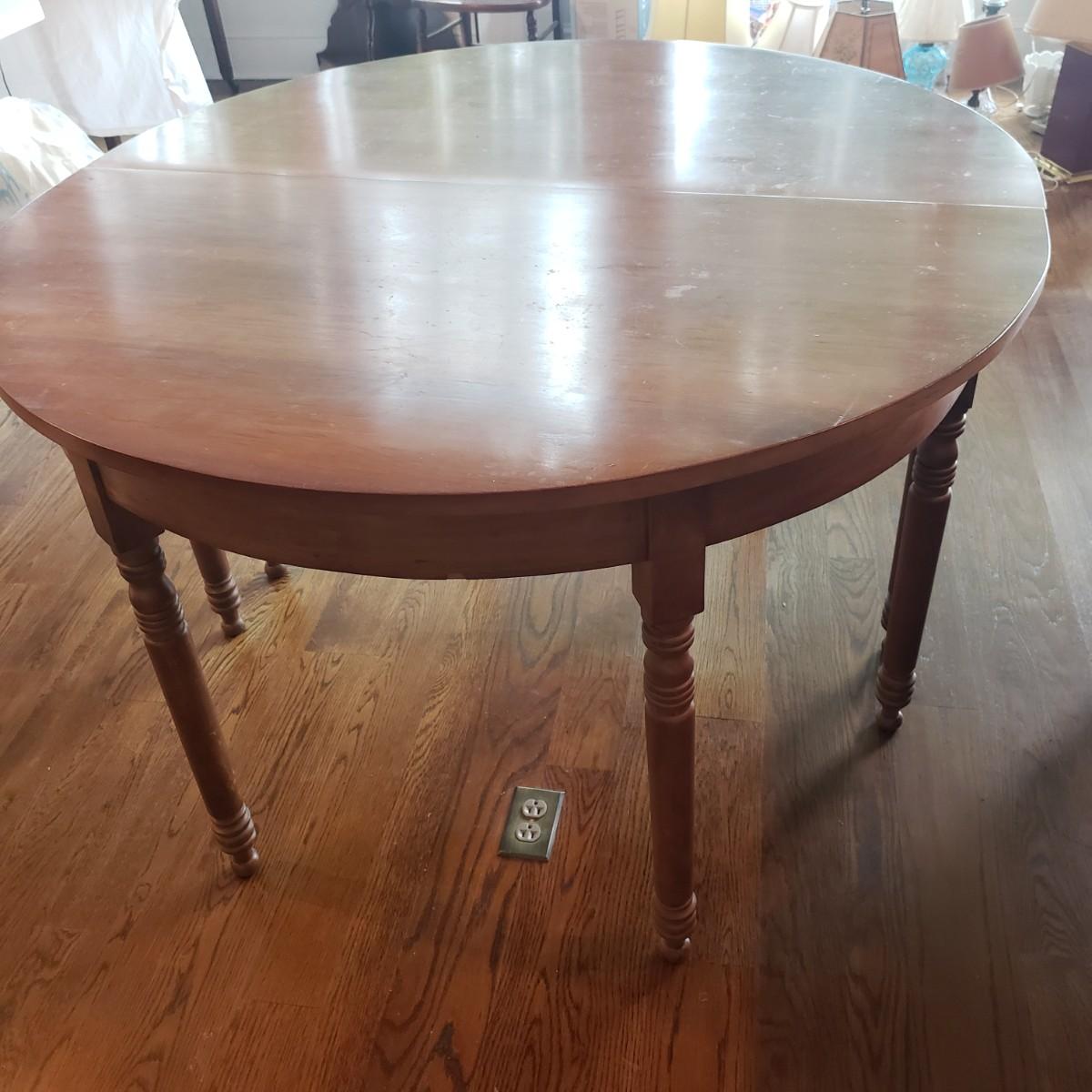 This Benbows wooden gate leg drop leaf table by itself with the sides open measures 63" x 47" x 30" H. In its closed position the table measures 21" x 47" x 30" H. The table comes with two demilune tables (25" x 47" x 30" H) that can be added to the main table either in its closed position or with the sides extended out. The entire table measures 113" extended out with the demilune tables on each end.. See pictures for details. According to the seller, this is a Benbow's table, but it has no markings so we cannot verify the brand.