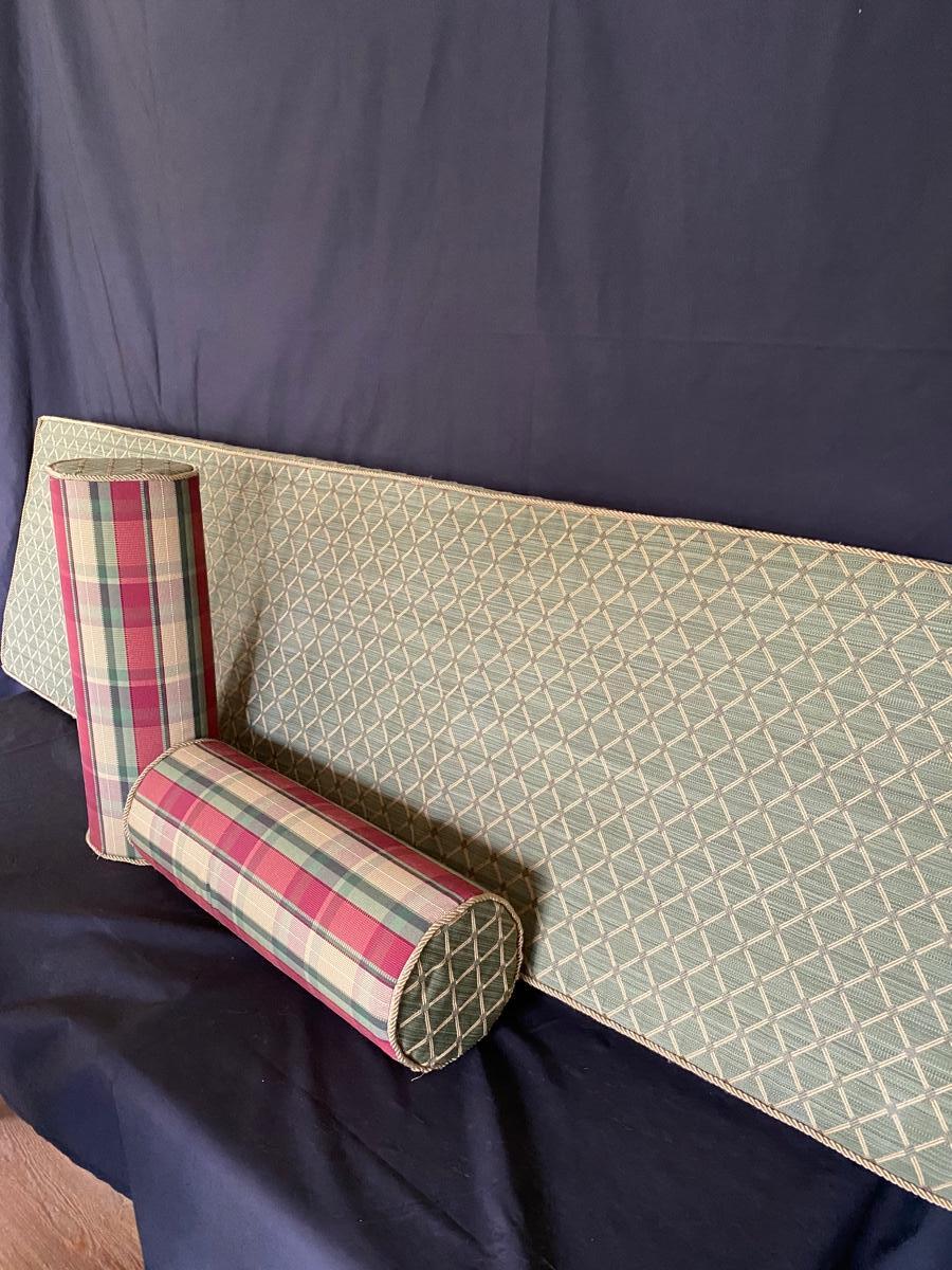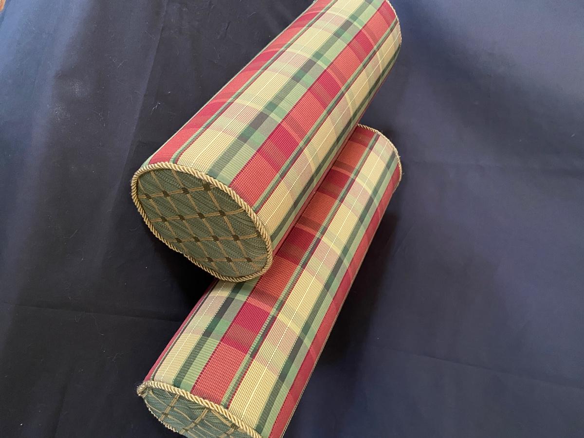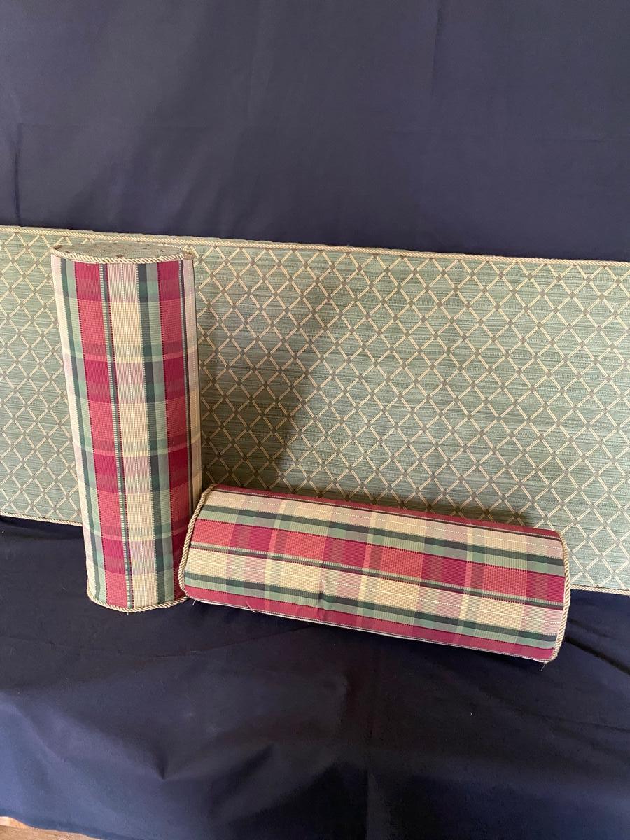 1 green bench cushion - 62” x 17.5”. 2 green/gold bolsters 17.5” x 6”