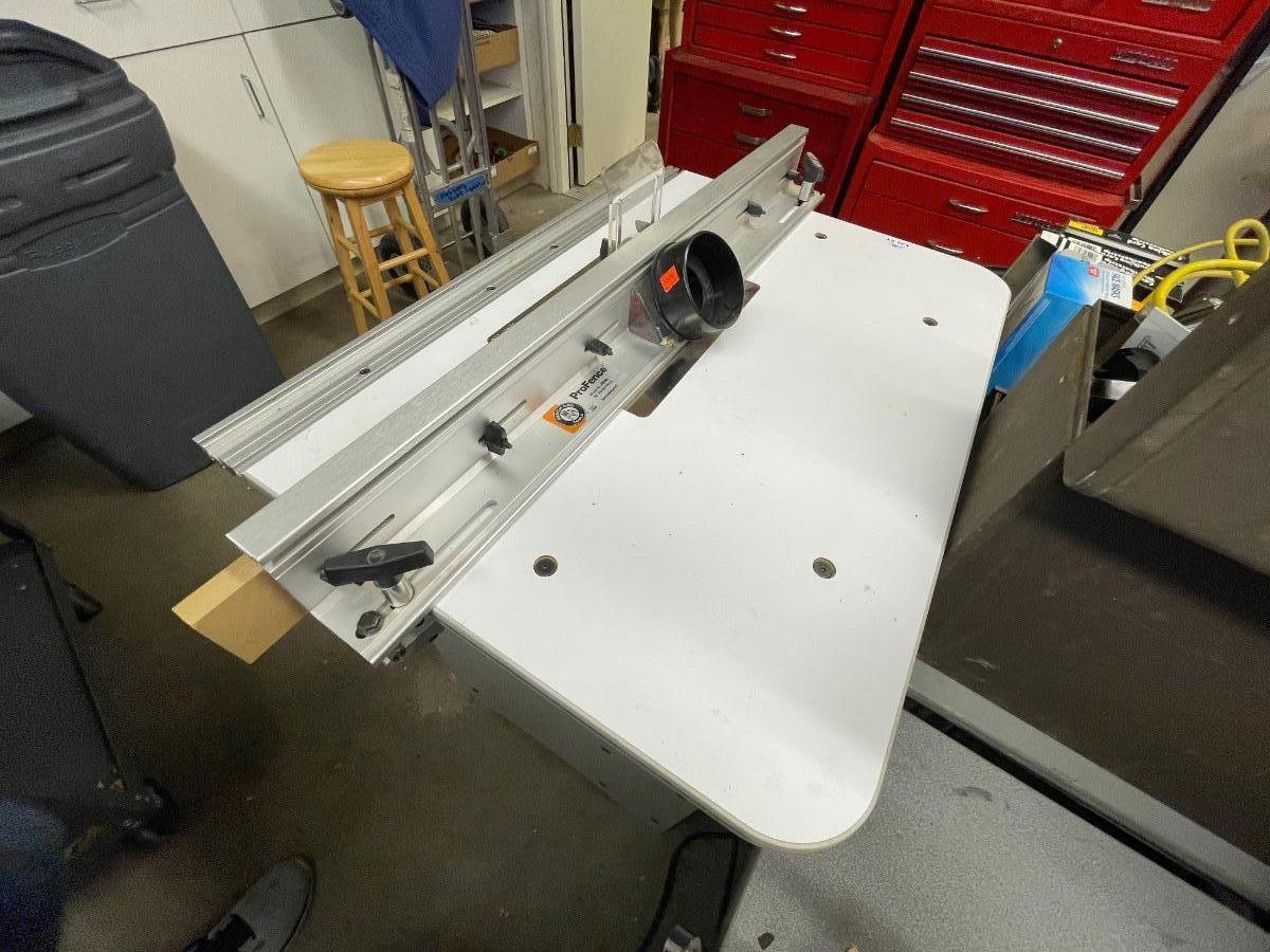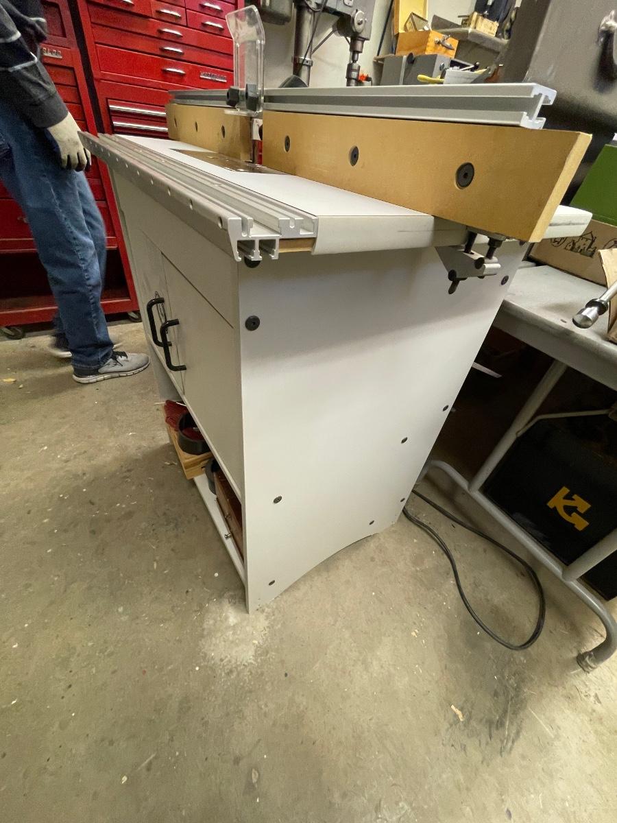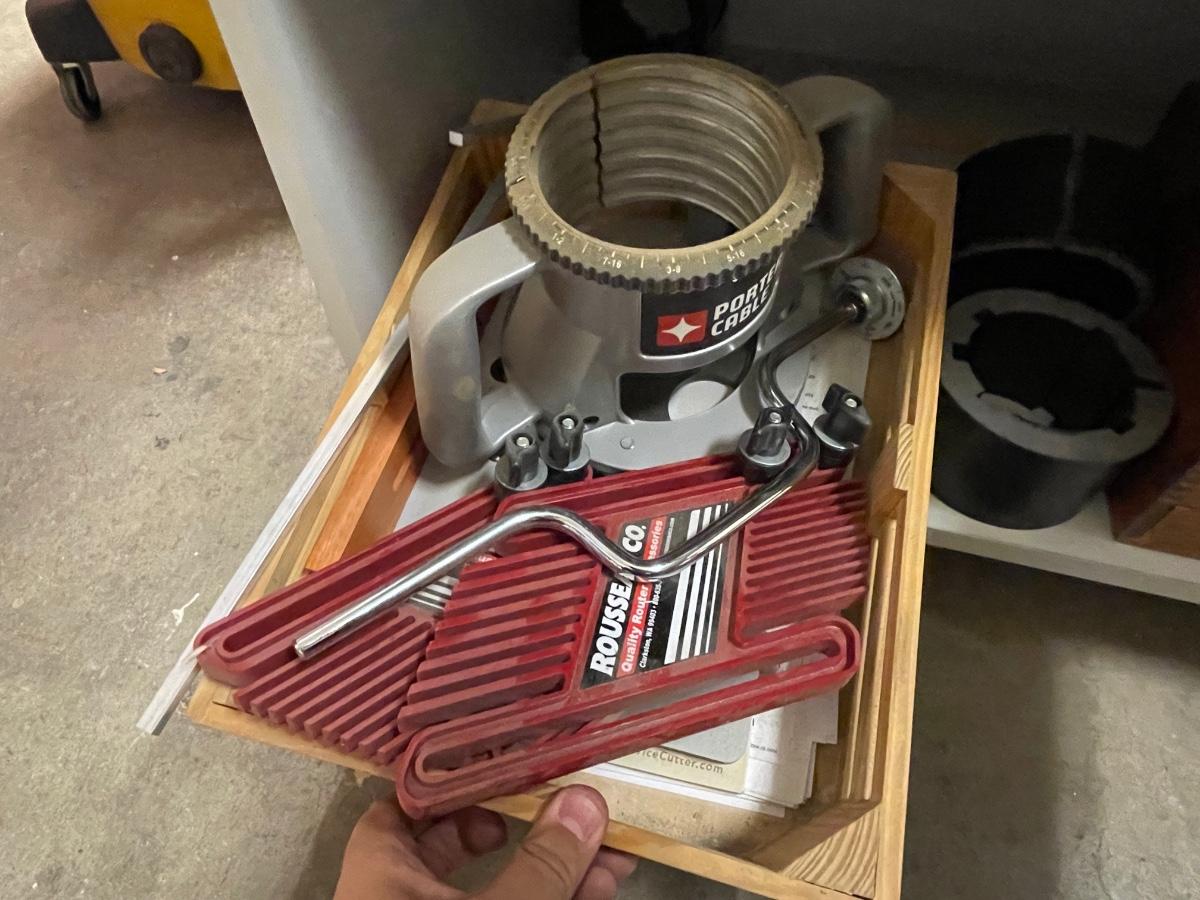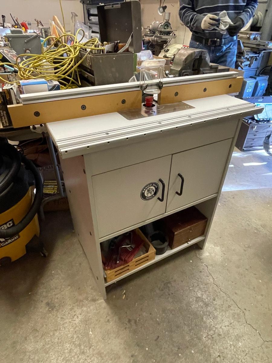 includes the bench w/double cabinet and all accessories on bottom shelf & wood box of various router pieces