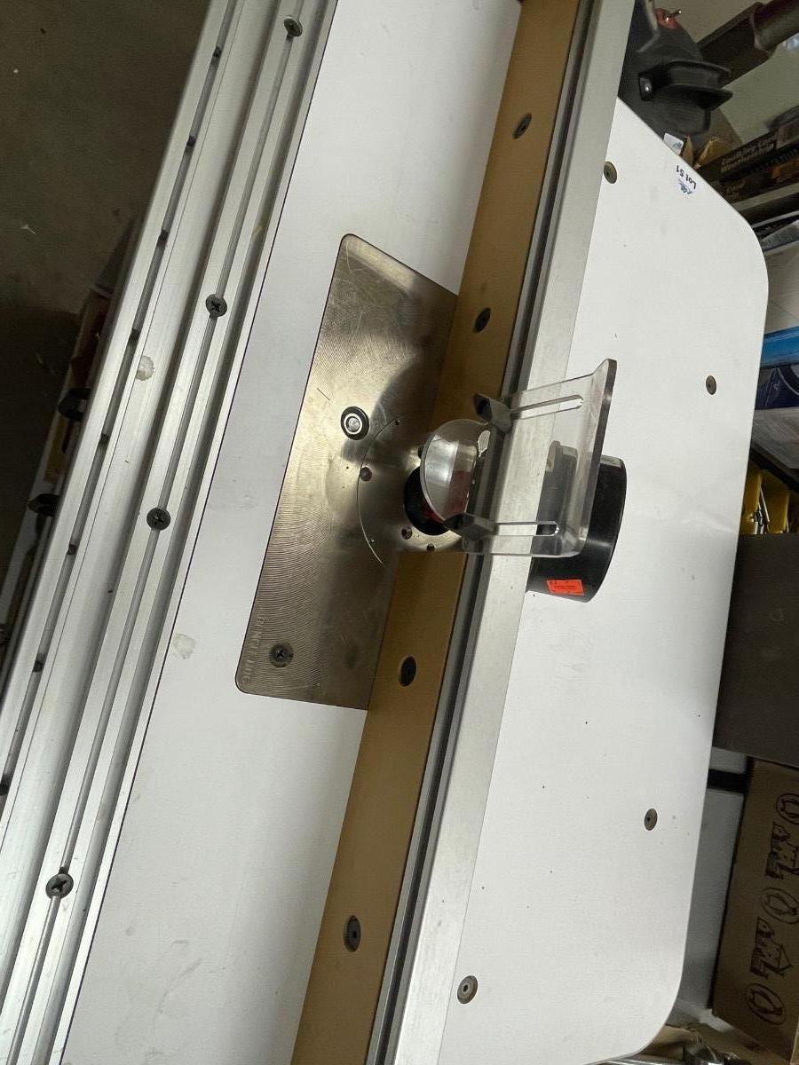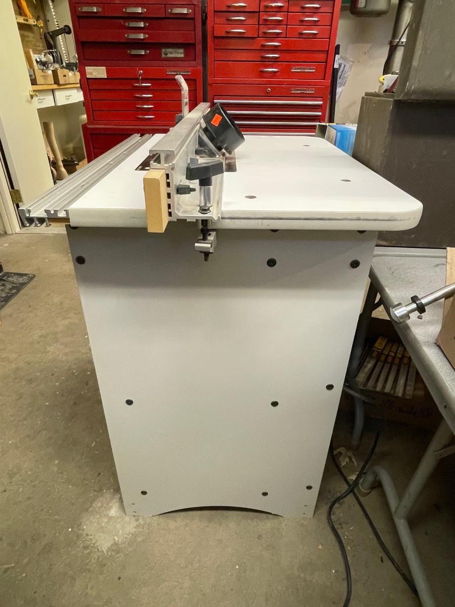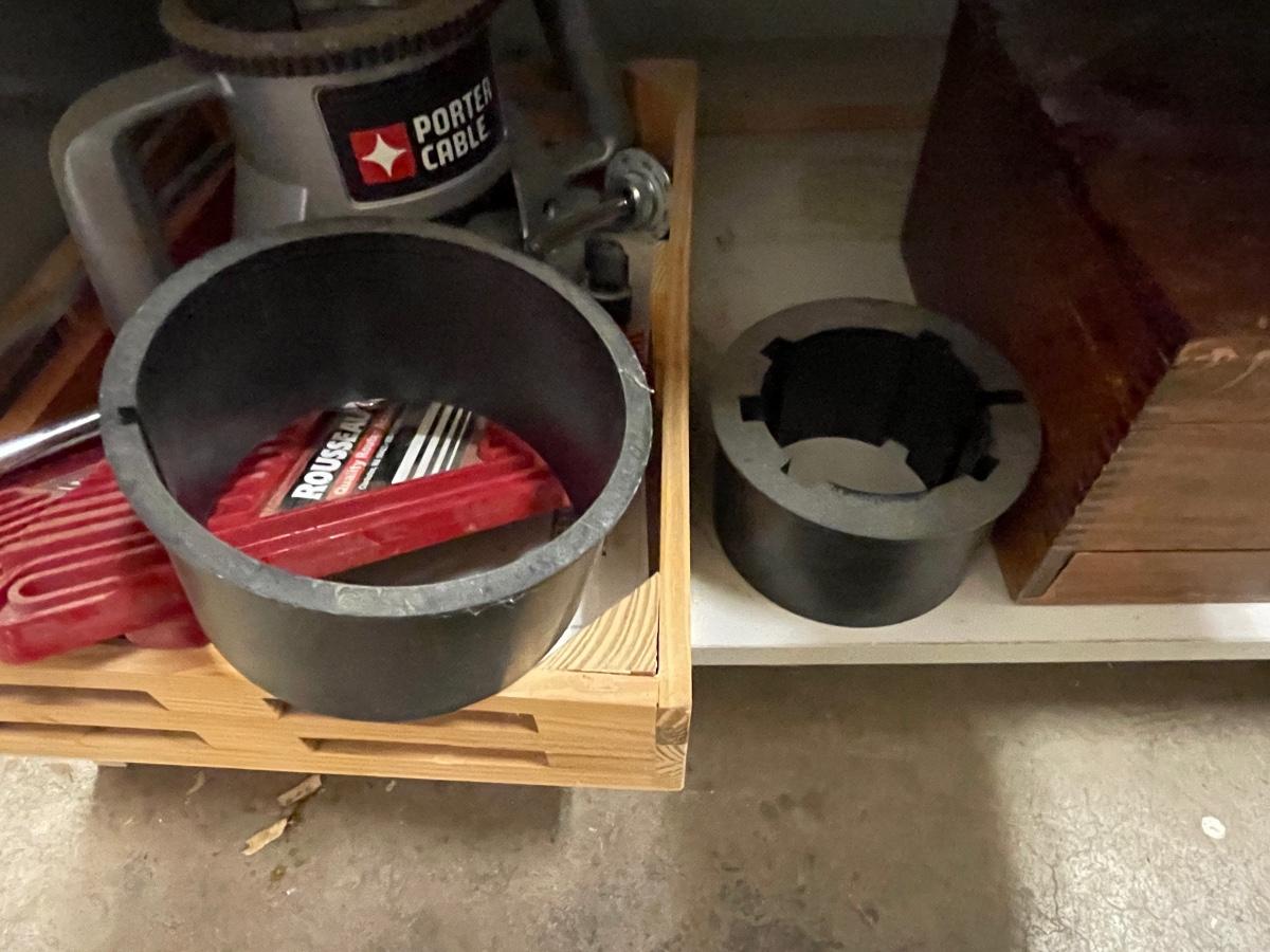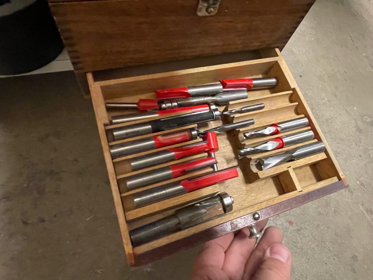 includes the bench w/double cabinet and all accessories on bottom shelf & wood box of various router pieces