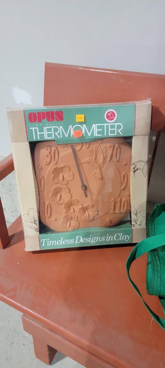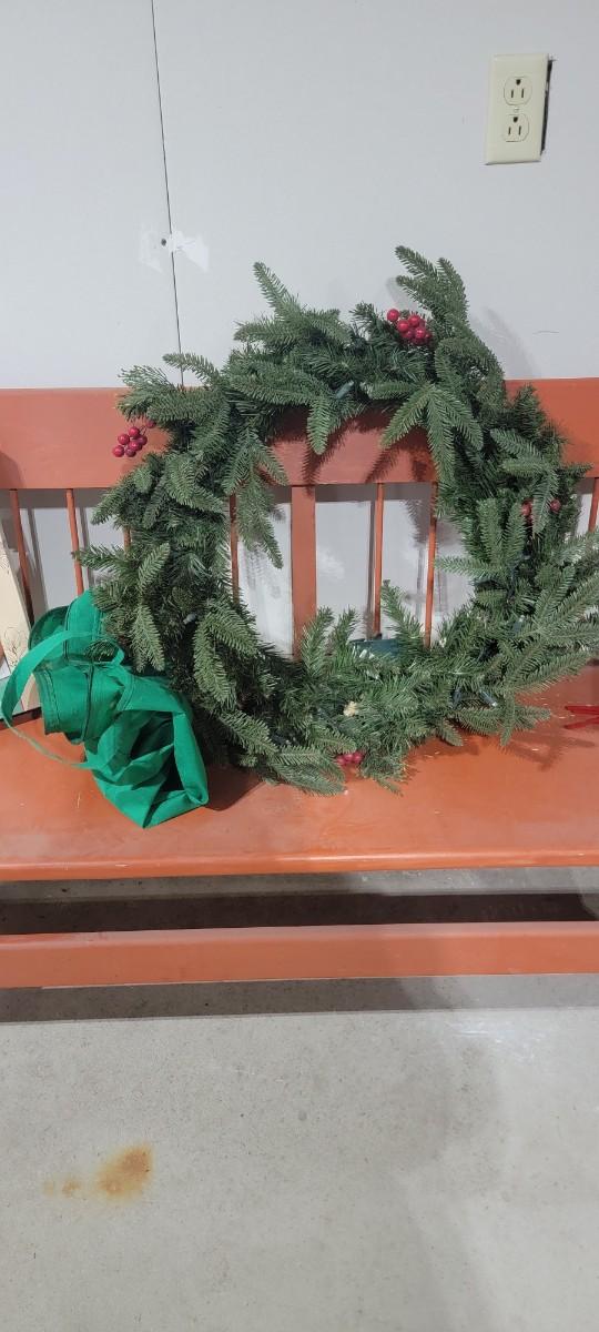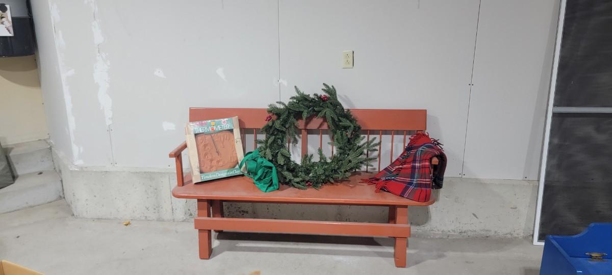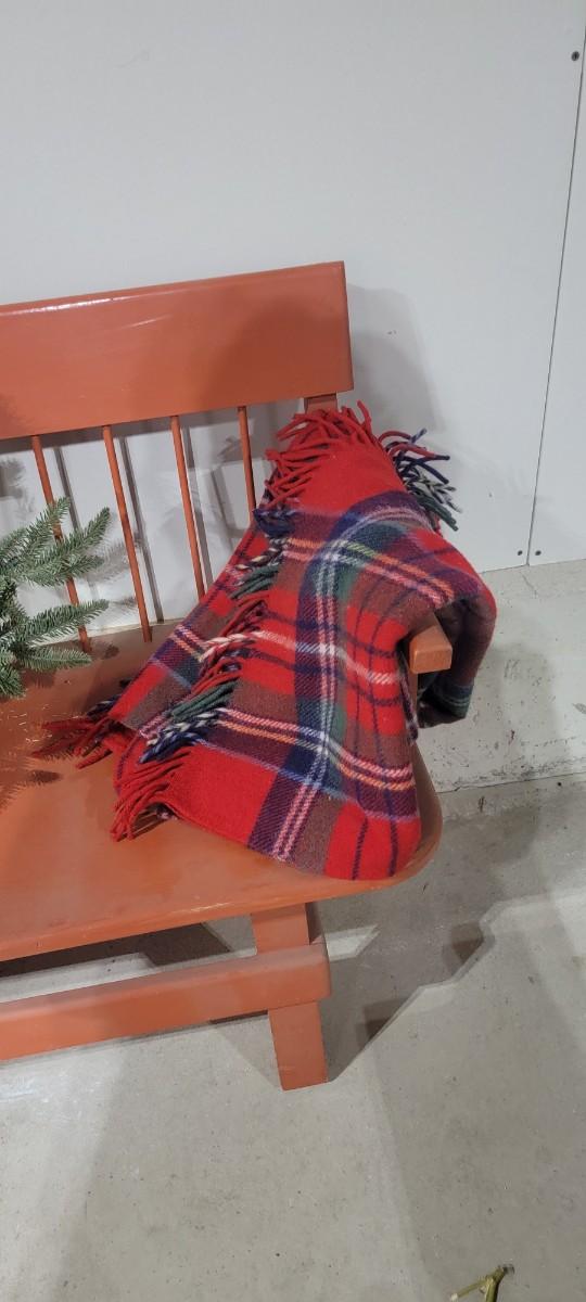 Orange bench 60" W 18" H 35H back 20" seat, wreath, throw, garden thermometer
