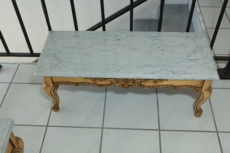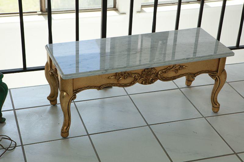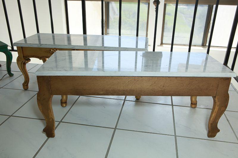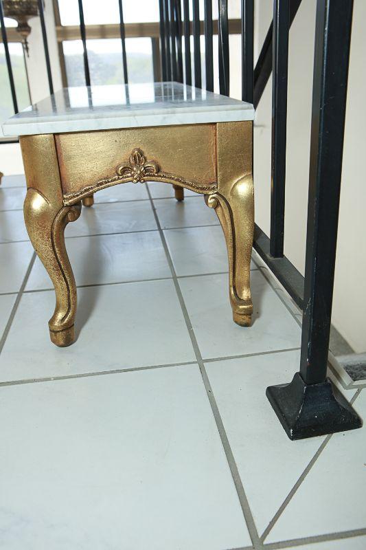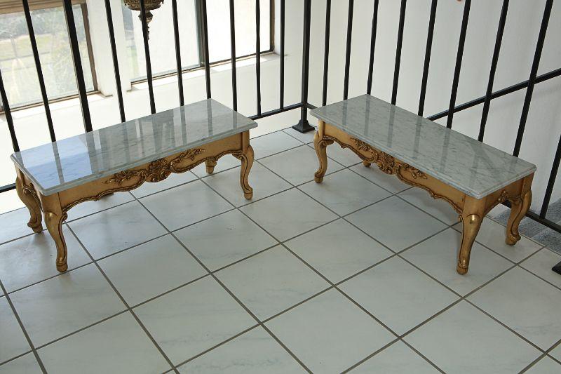 Pair of marble top benches. Gold gilt finish to the base. Marble lifts off. Measures about 34"x13"x14". Both in good condition.
