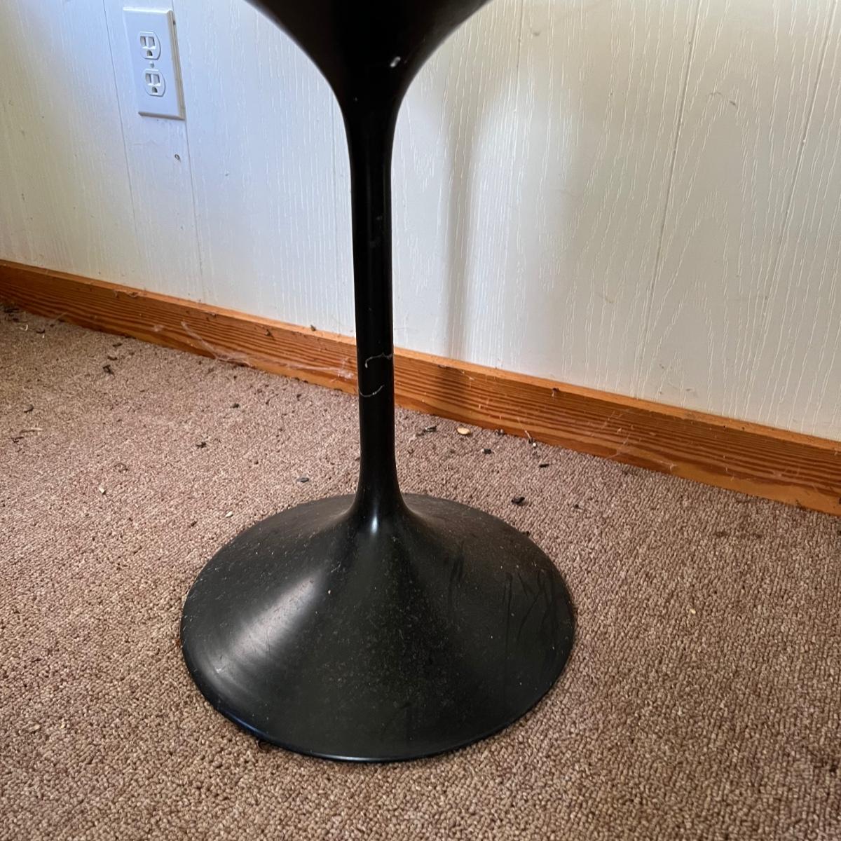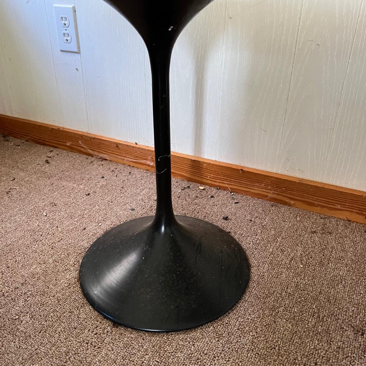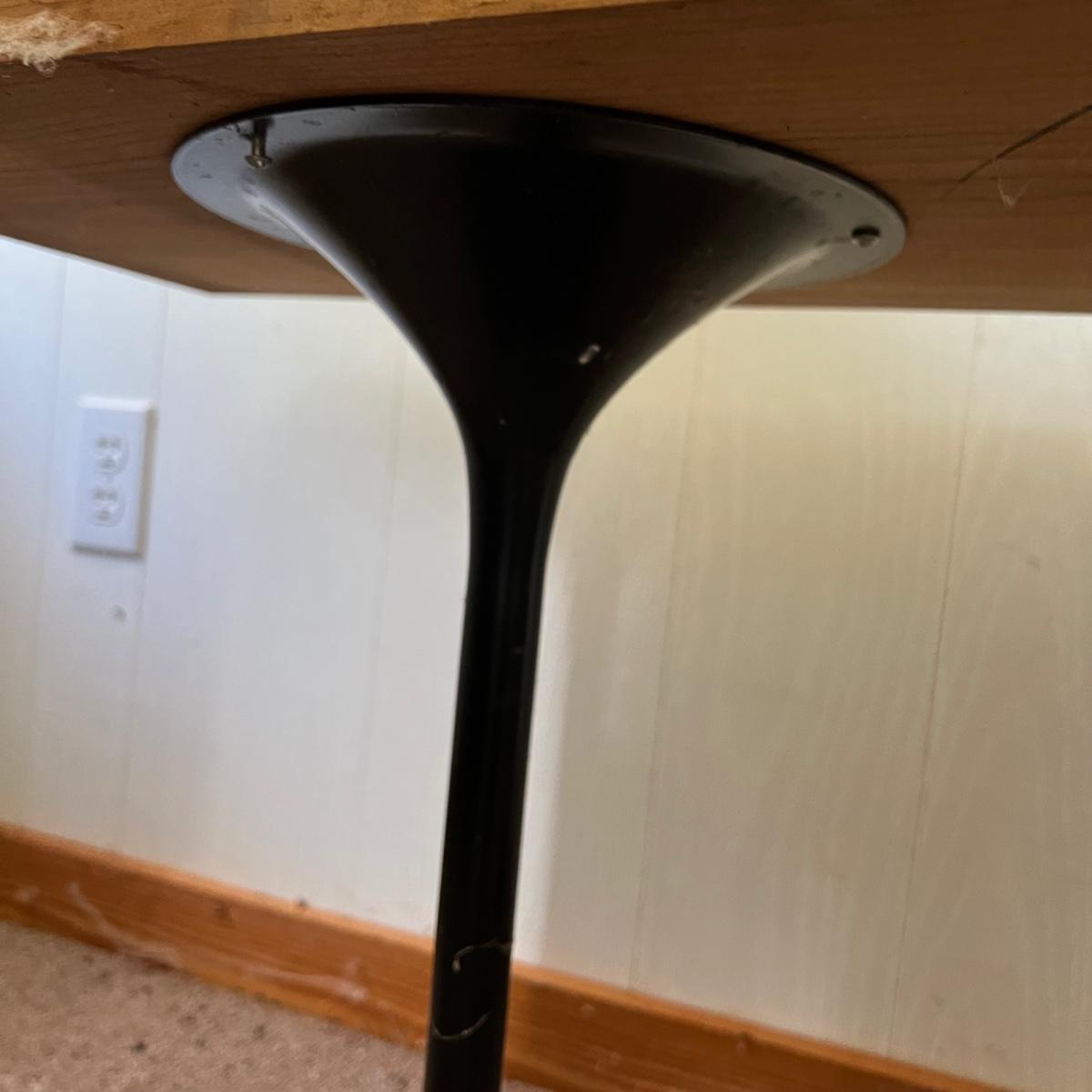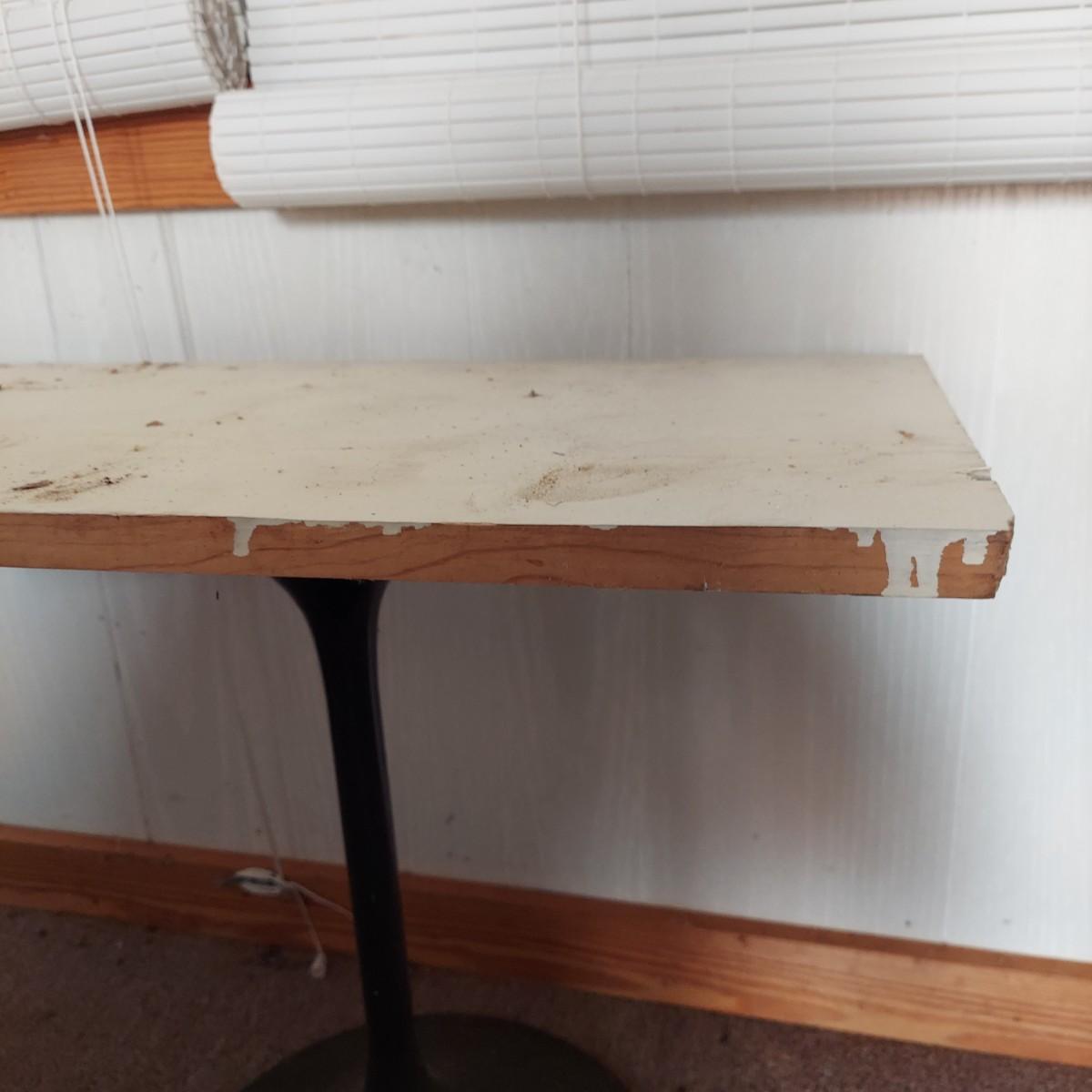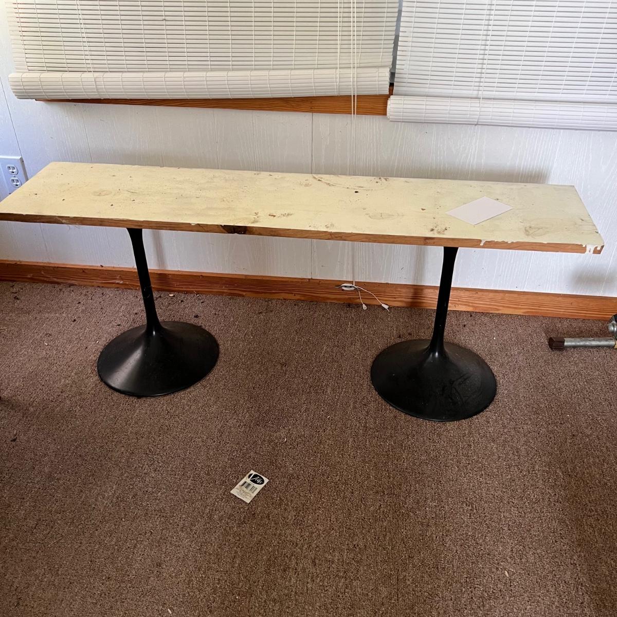 Wooden bench with two great metal tulip bases that appear to be vintage. The total bench measures 48” x 11.75” x 19”H. The legs are mounted with screws. The wood top has been roughly painted.