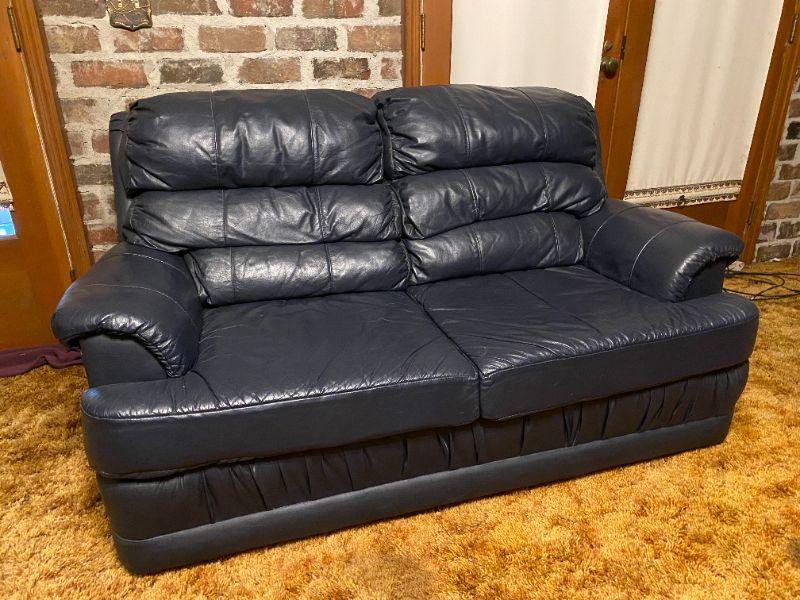 Benchcraft Navy Leather Loveseat good used condition 52x33x30