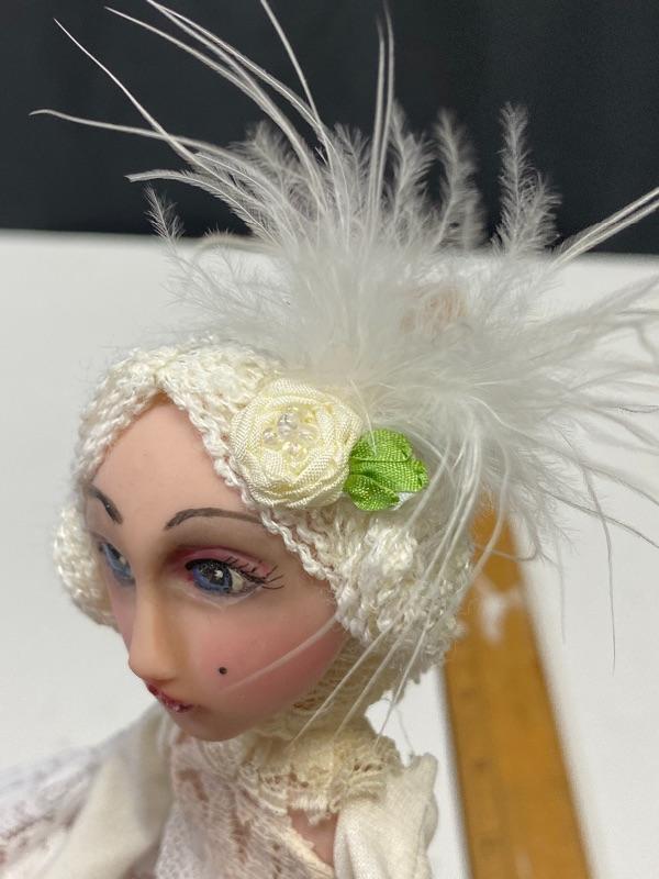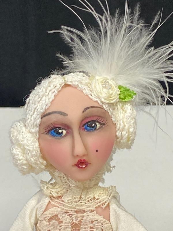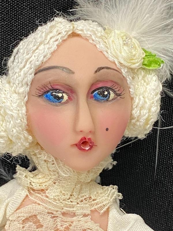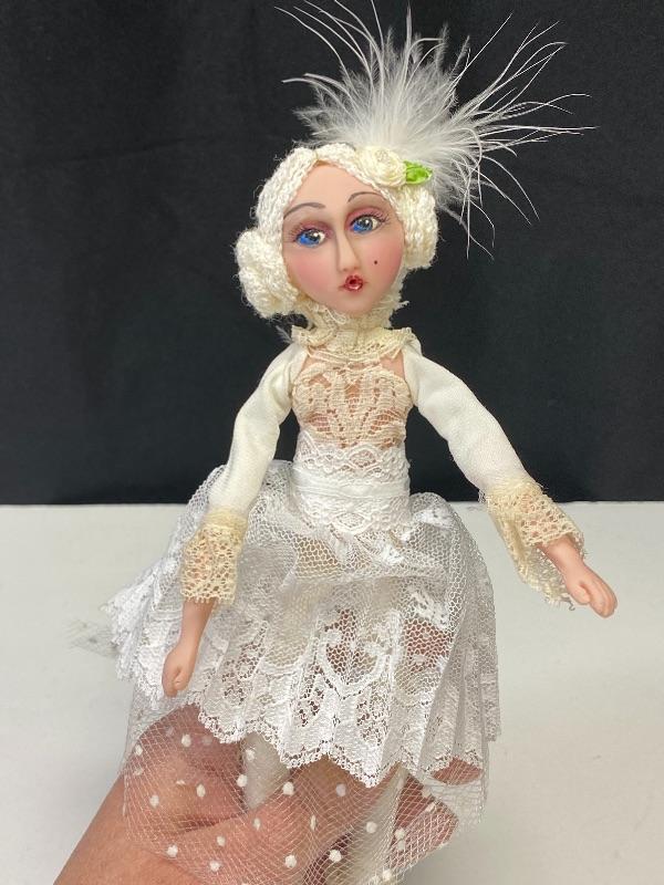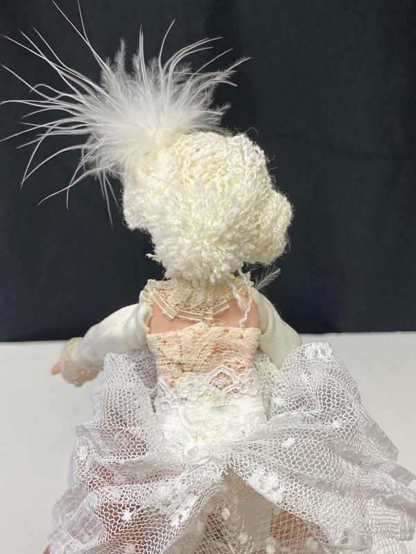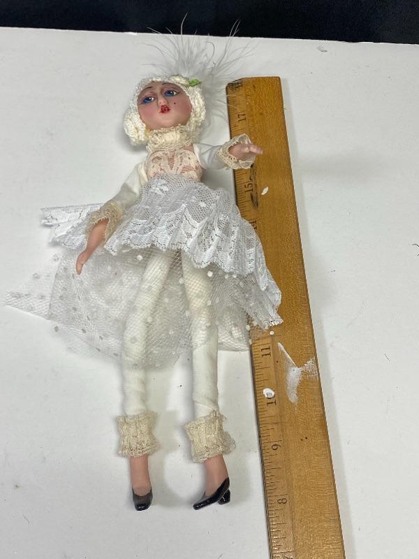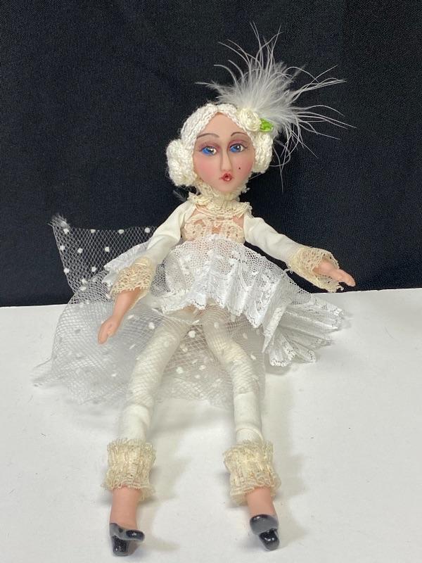 OOAK Ballerina art doll. Long exaggerated limbs have wire inside to make them bendable. Painted face. Lace and feathers outfit. Unmarked. About 10" size.