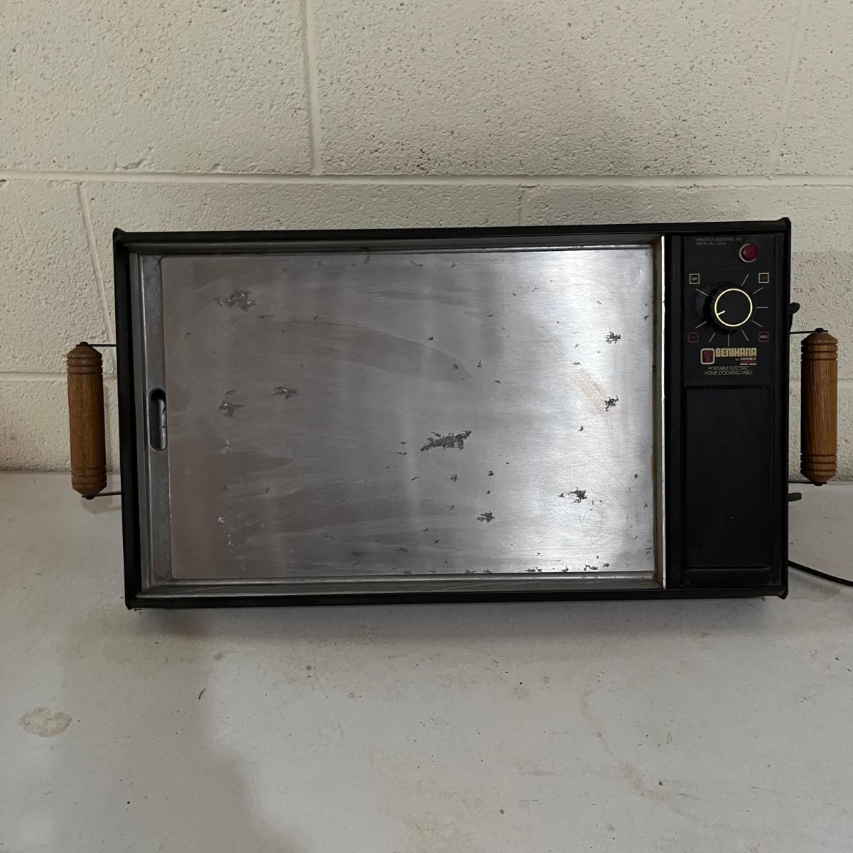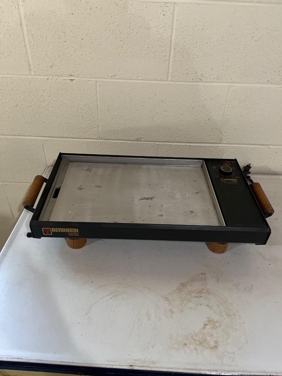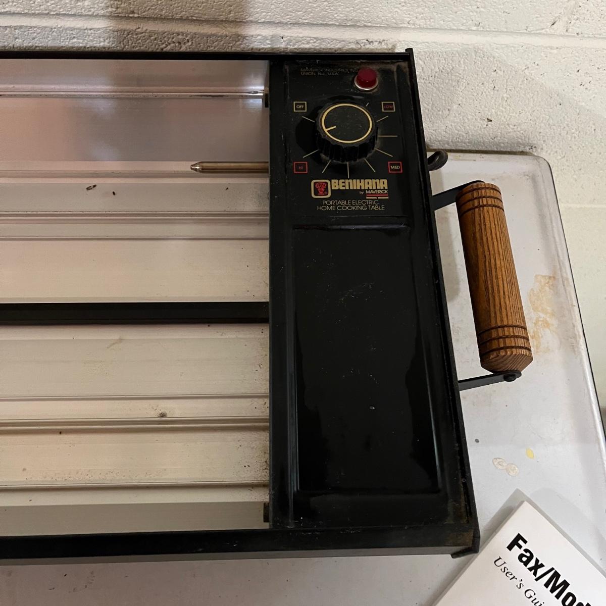Lot includes a Benihana portable electric home cooking table by Maverick model # MBH 700. Unit powered on when tested. Unit measures 12” x 26” x 5”.