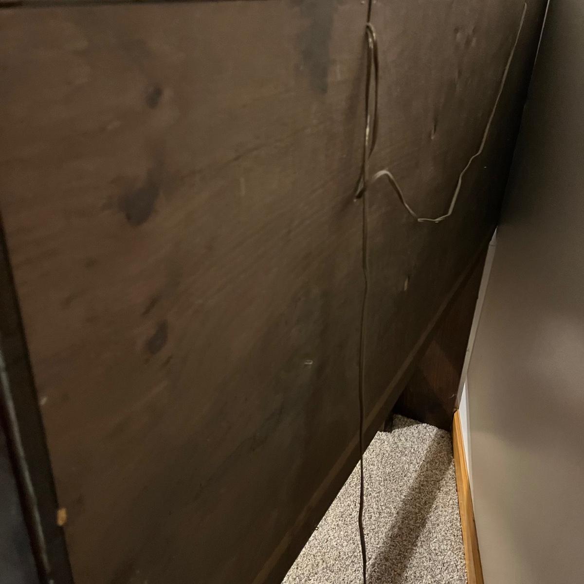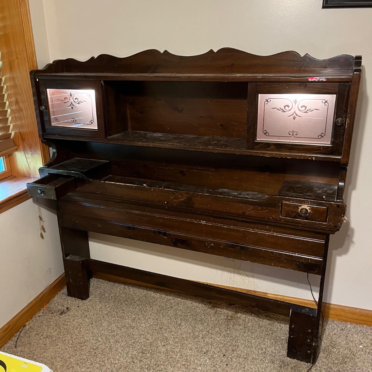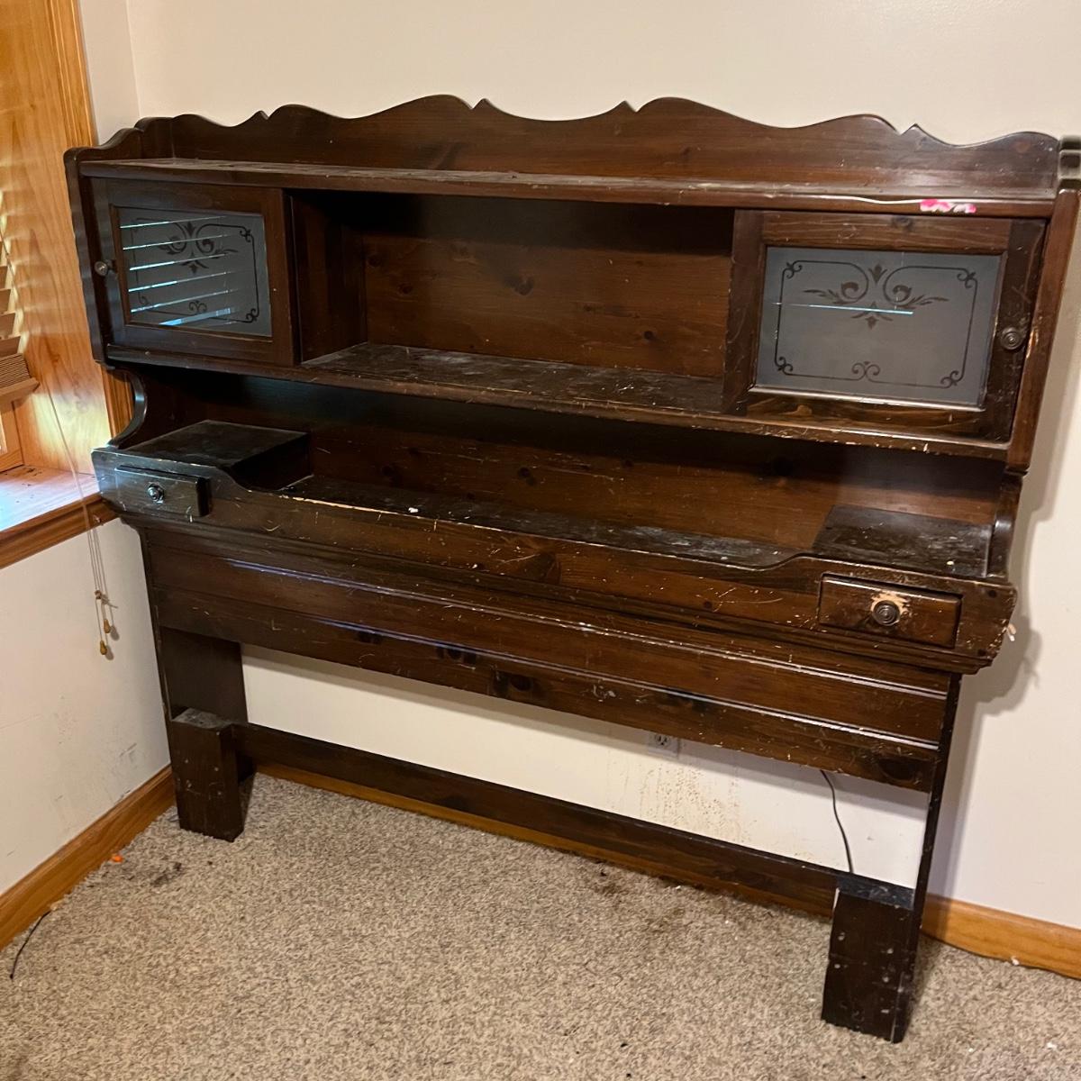 Lot includes a lighted Bennington wooden King headboard. Headboard has two dovetailed drawers, and two lighted cabinets with sliding glass doors. Both lights worked when tested. Headboard measures 13” x 78.5” x 61”. Headboard is a bit scratched and nicked, see pictures.