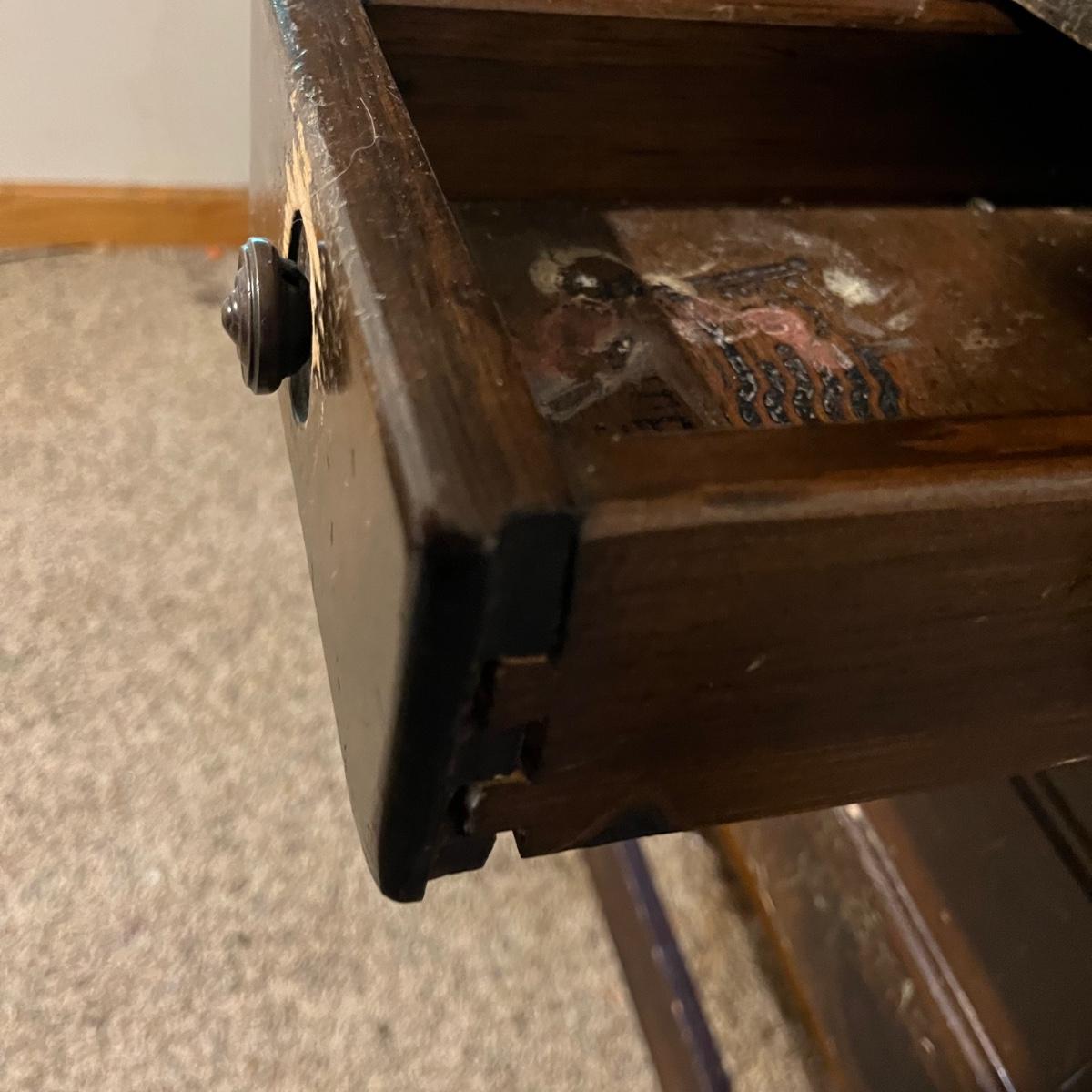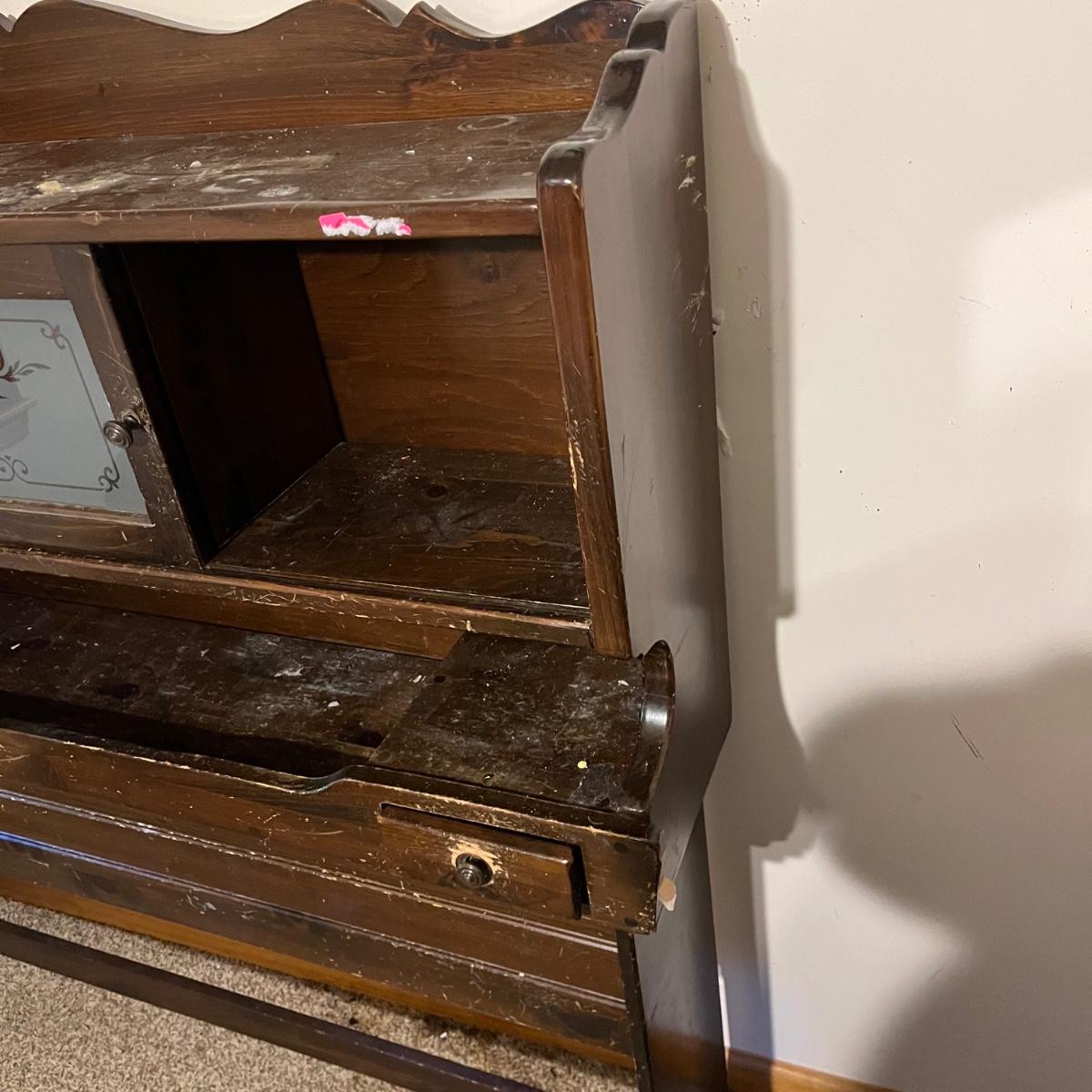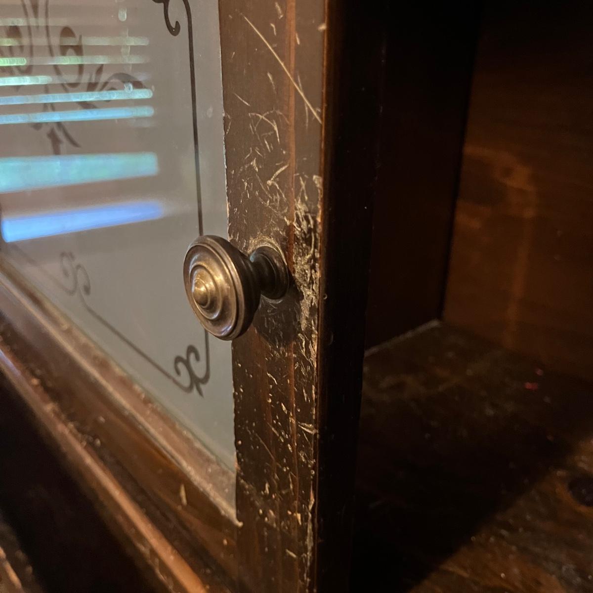 Lot includes a lighted Bennington wooden King headboard. Headboard has two dovetailed drawers, and two lighted cabinets with sliding glass doors. Both lights worked when tested. Headboard measures 13” x 78.5” x 61”. Headboard is a bit scratched and nicked, see pictures.
