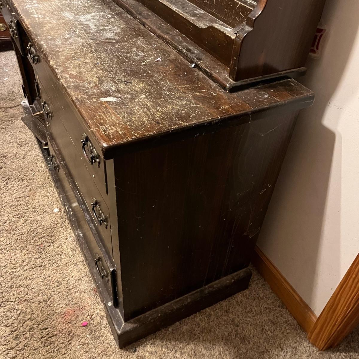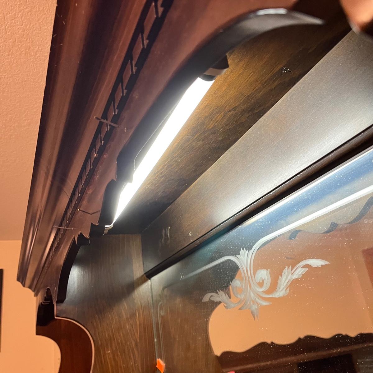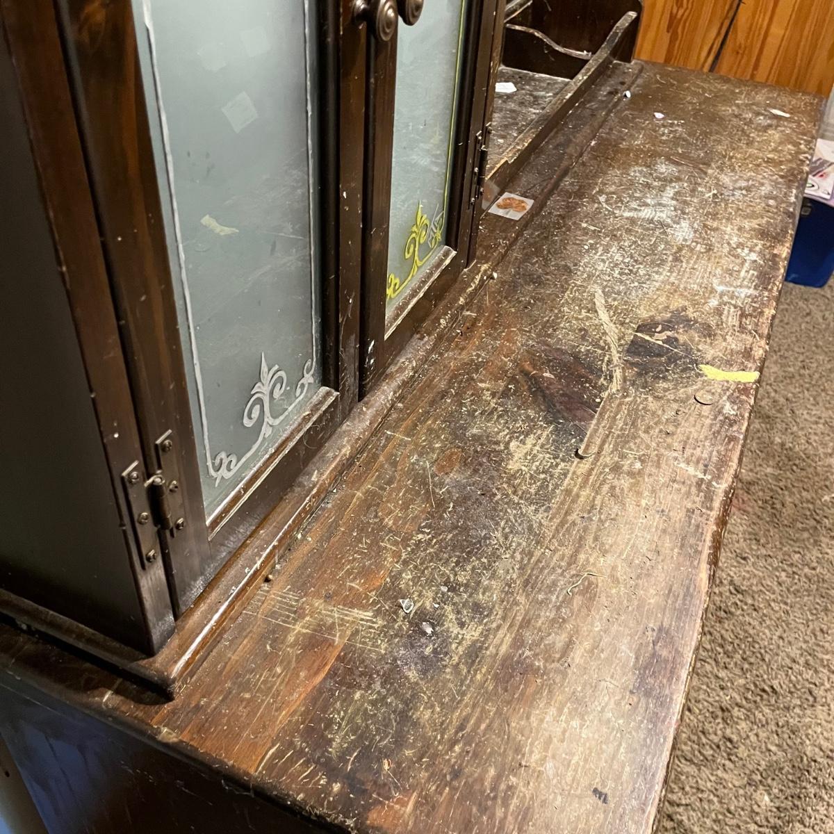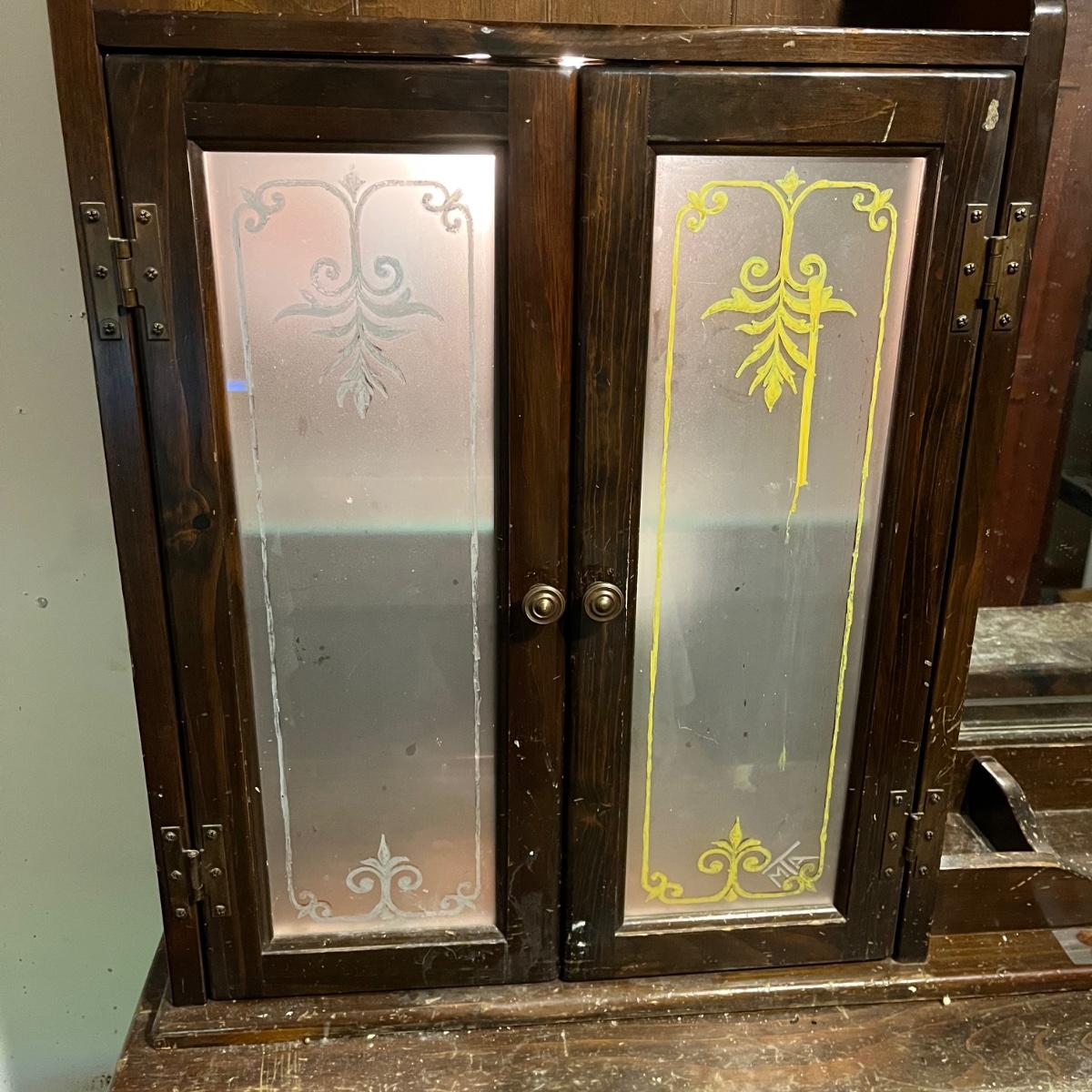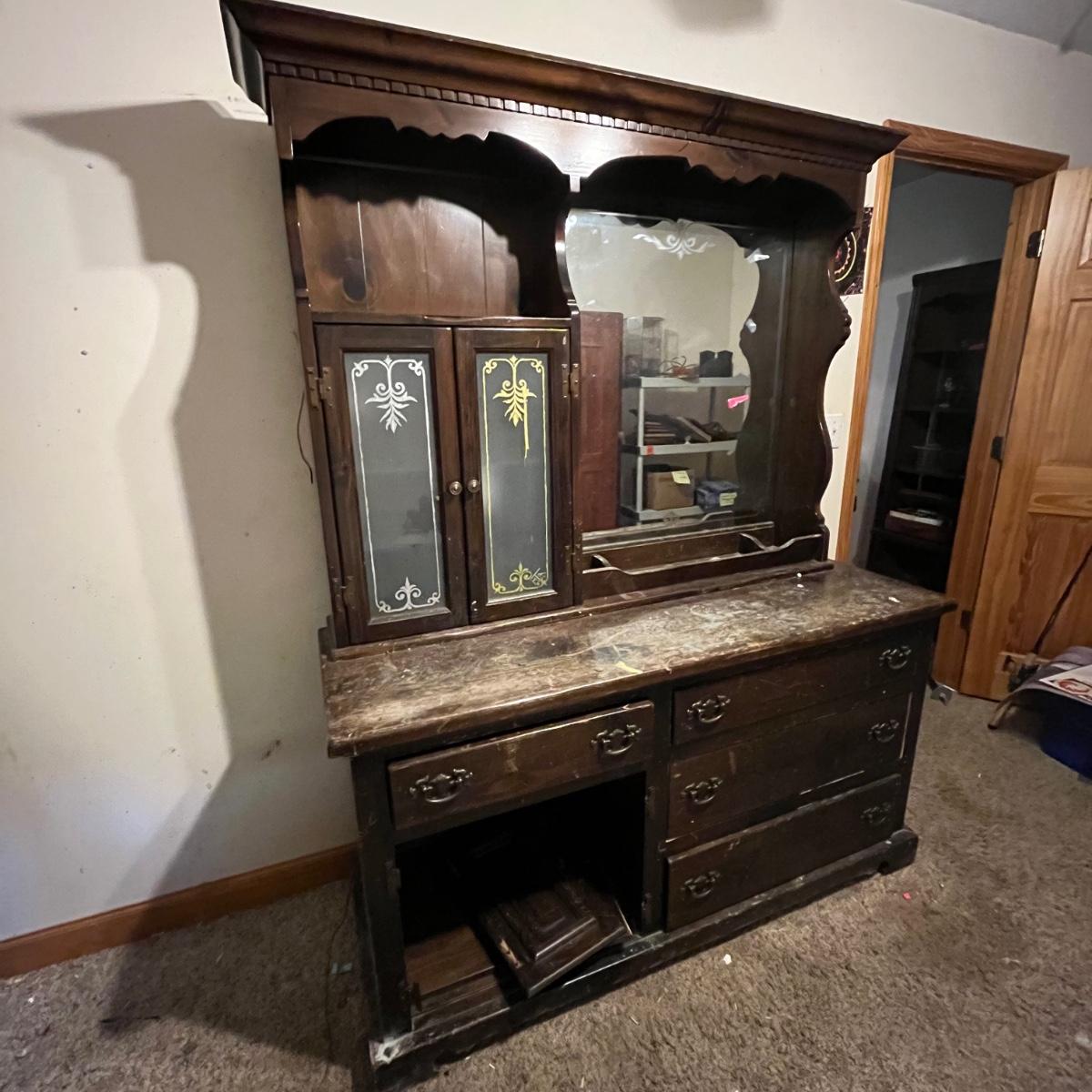 Lot includes a four dovetailed drawer dresser with a two door cabinet on the bottom piece and a light above the mirror, a well as in the glass door cabinet. Both lights worked when tested. Dresser is heavily scratched and nicked and bottom cabinet doors are not attached, but have hardware to reattach. Bottom piece measures 20” x 60” x 32” and top piece measures 9” x 56” x 45”. This is a two piece unit. Bring help to move as item is substantial.