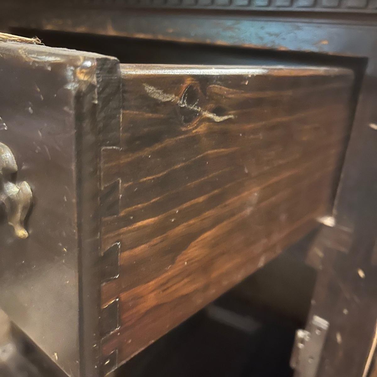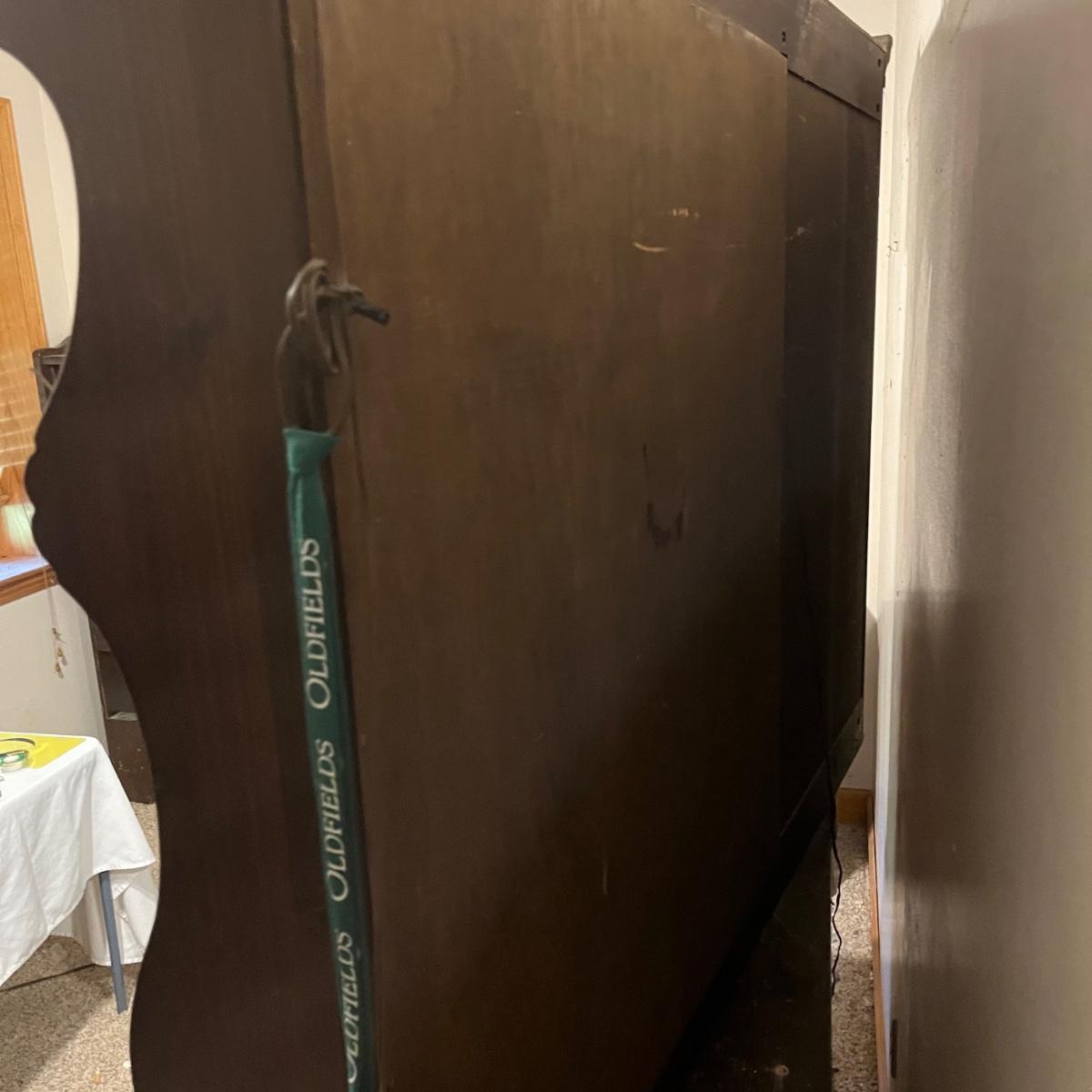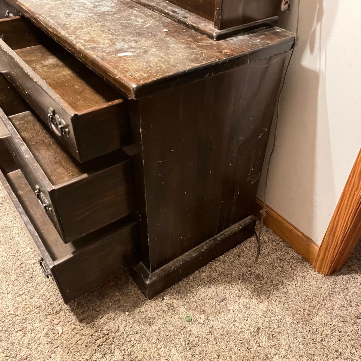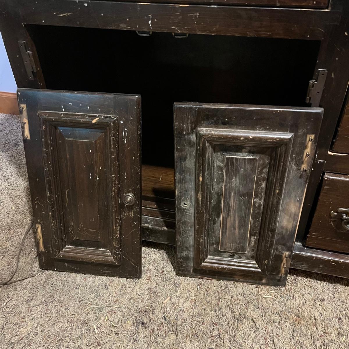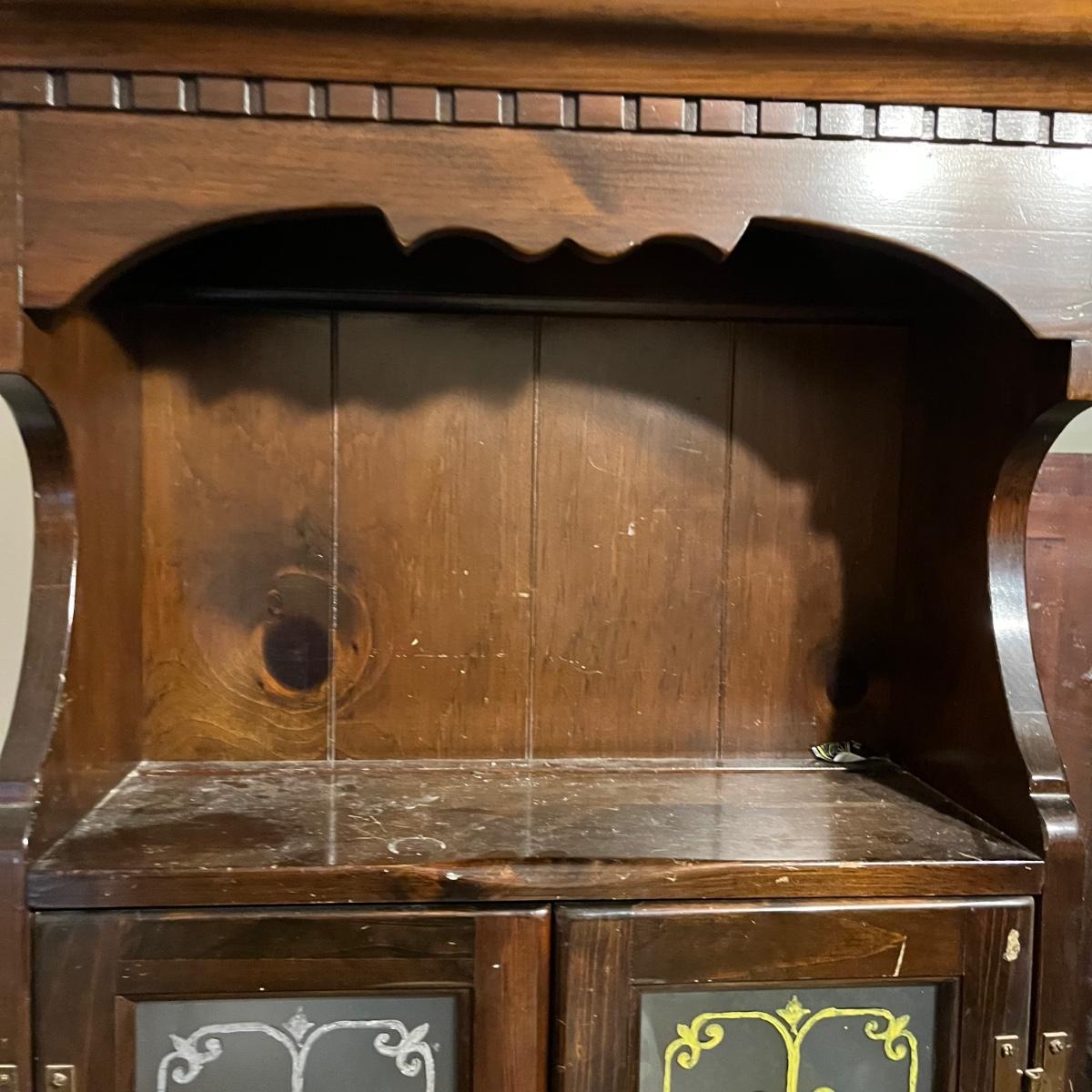 Lot includes a four dovetailed drawer dresser with a two door cabinet on the bottom piece and a light above the mirror, a well as in the glass door cabinet. Both lights worked when tested. Dresser is heavily scratched and nicked and bottom cabinet doors are not attached, but have hardware to reattach. Bottom piece measures 20” x 60” x 32” and top piece measures 9” x 56” x 45”. This is a two piece unit. Bring help to move as item is substantial.