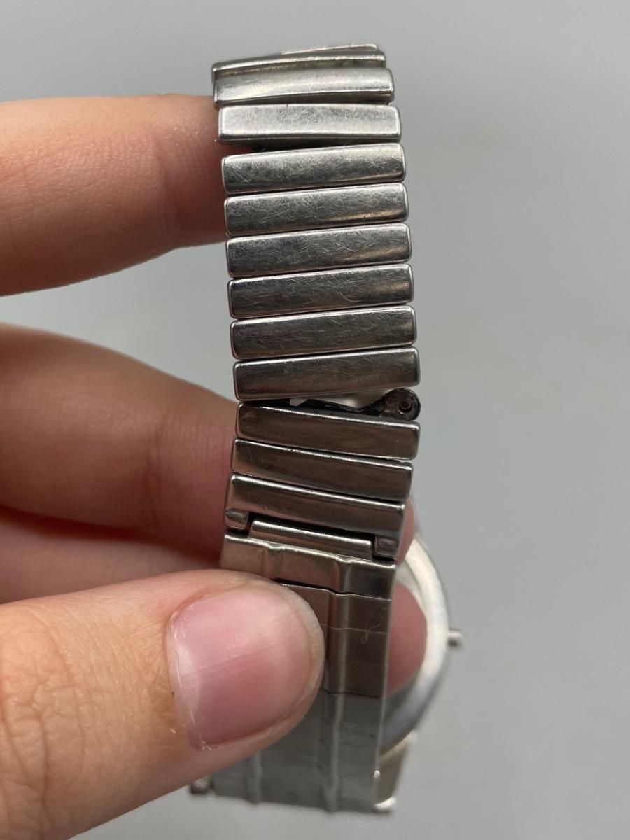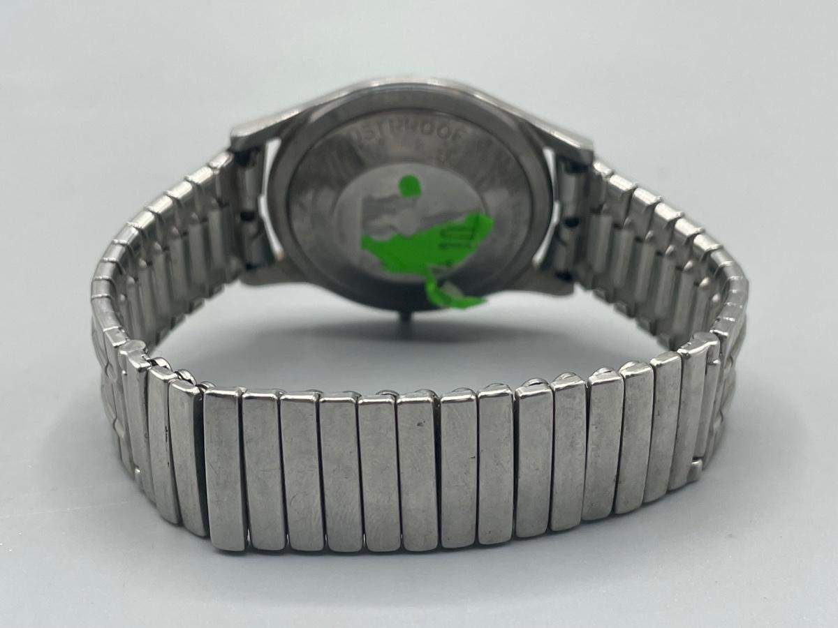 This item is in used condition. It does not work and is a little bit worn out. The band on the watch is stretchy and can adjust to any wrist size. Tried moving around and it would not start up. Great for parts or repair.
