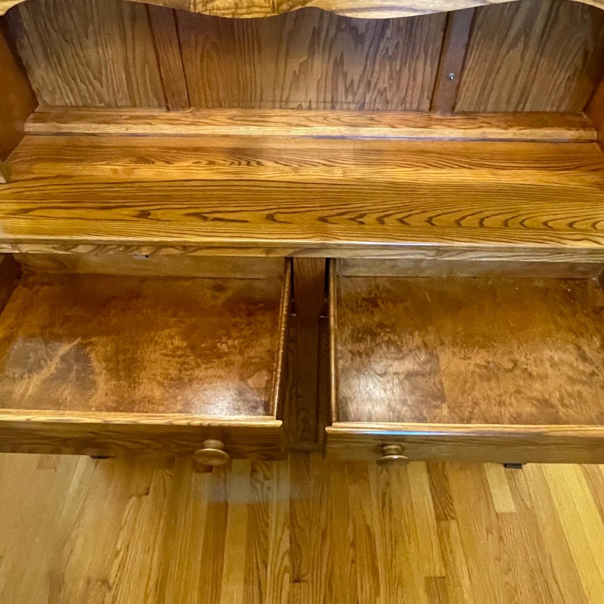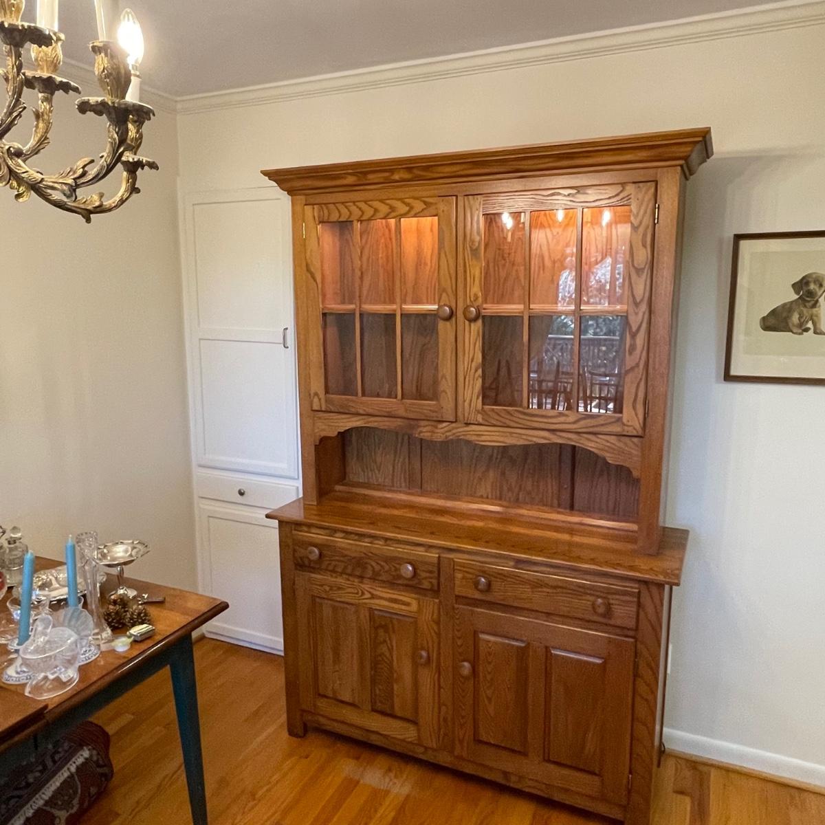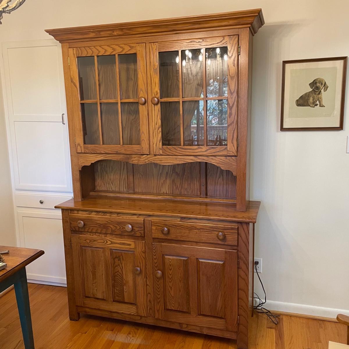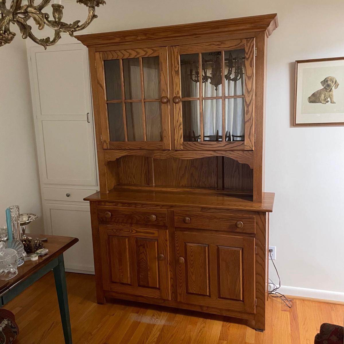 This country style solid wood hutch by S. Bent & Bros. has two dovetailed drawers above the lower cabinet that contains one shelf. The middle/open section of the hutch has a plate rail. The upper cabinet has one shelf with glass bottom and there are 2 spotlights. Piece is in excellent condition. Measures 34” wide x 17” deep x 80” tall (34” tall lower cabinet, 46” upper piece). Hutch is a 2 piece, winning bidder will need to dismantle (Phillips head screwdriver) and must bring help to load due to the size and weight of this item. It is on the main floor and will not need to be moved up or down any stairs.