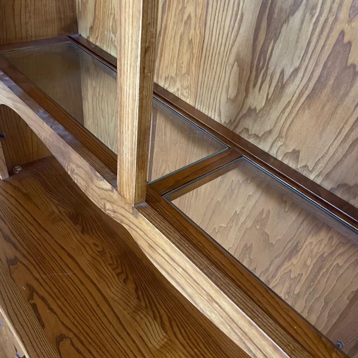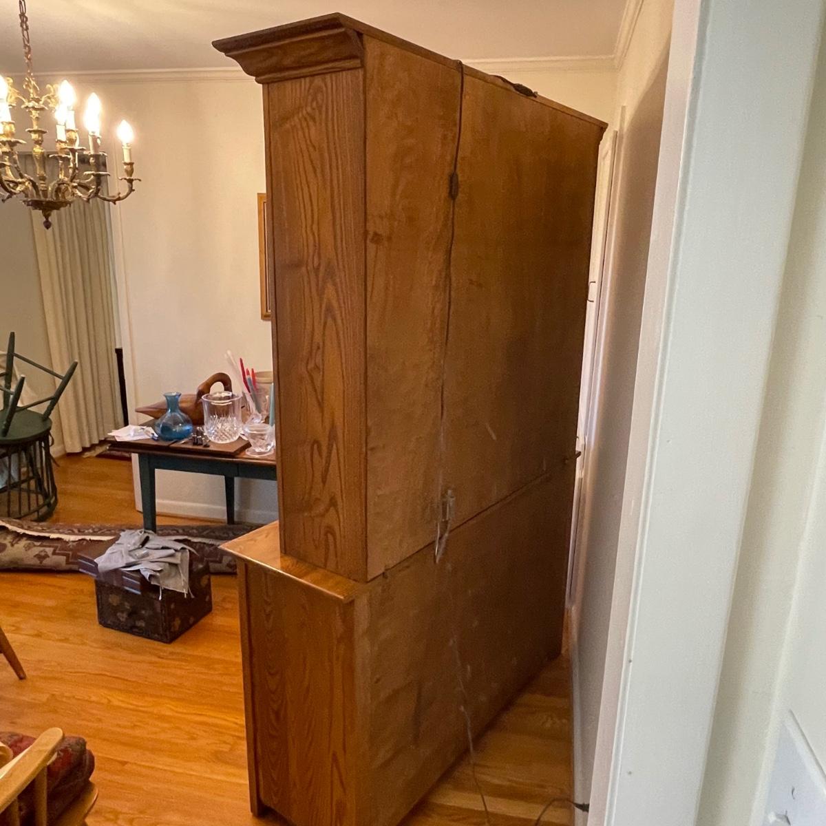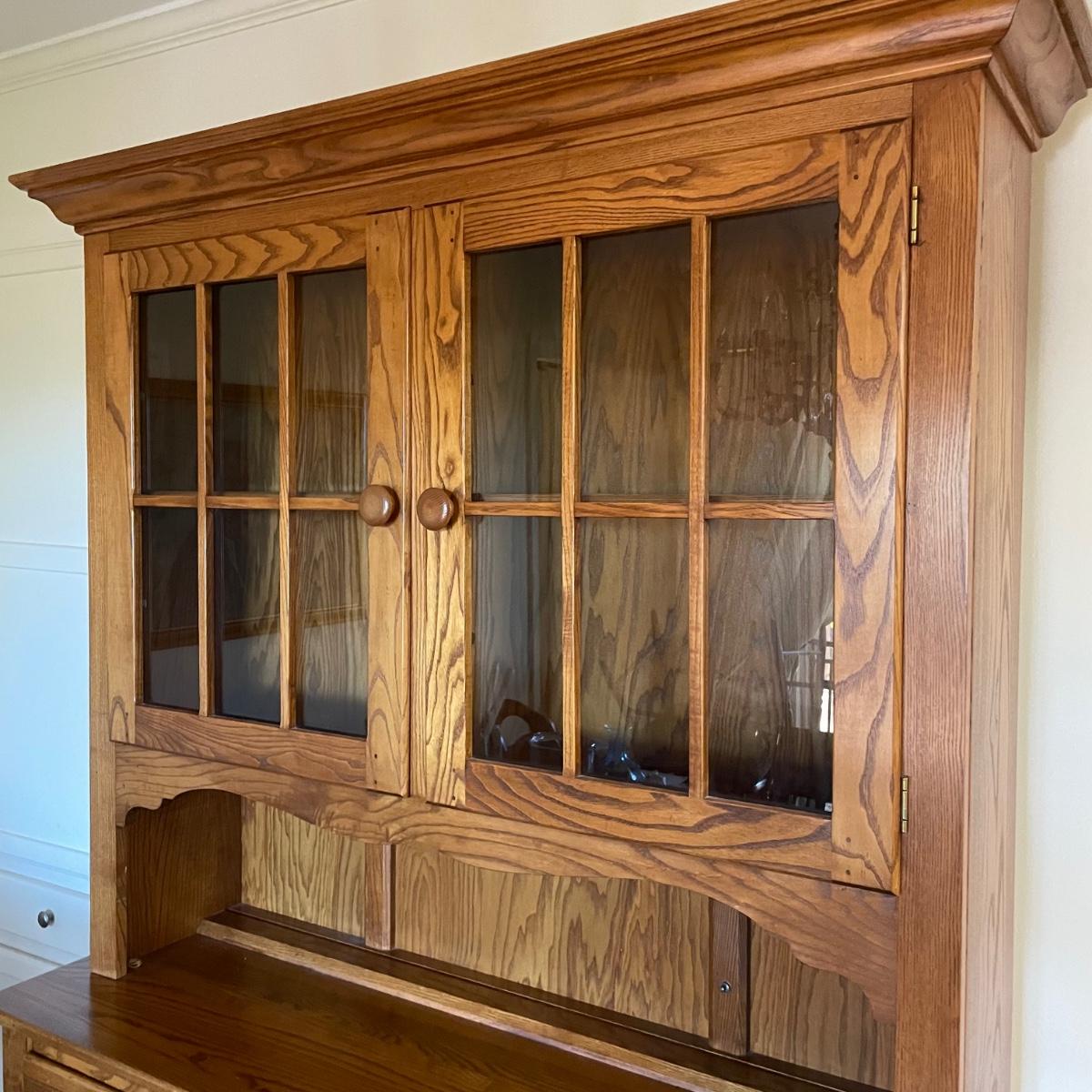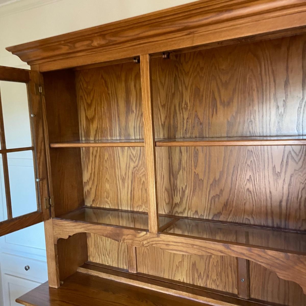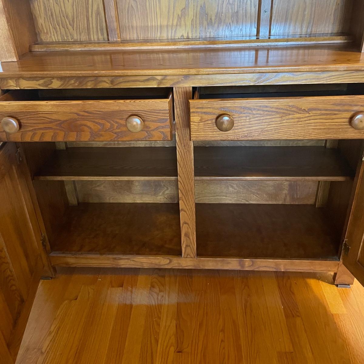 This country style solid wood hutch by S. Bent & Bros. has two dovetailed drawers above the lower cabinet that contains one shelf. The middle/open section of the hutch has a plate rail. The upper cabinet has one shelf with glass bottom and there are 2 spotlights. Piece is in excellent condition. Measures 34” wide x 17” deep x 80” tall (34” tall lower cabinet, 46” upper piece). Hutch is a 2 piece, winning bidder will need to dismantle (Phillips head screwdriver) and must bring help to load due to the size and weight of this item. It is on the main floor and will not need to be moved up or down any stairs.