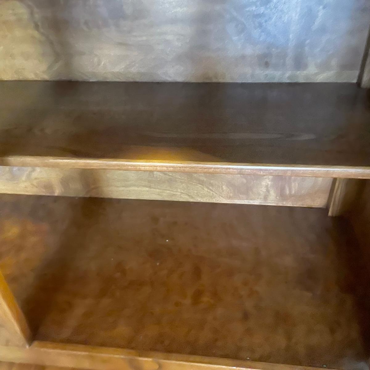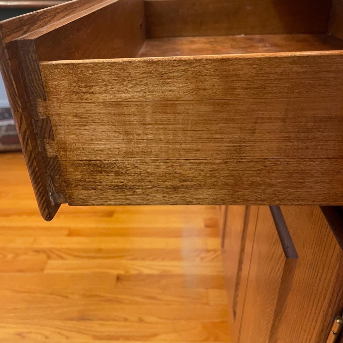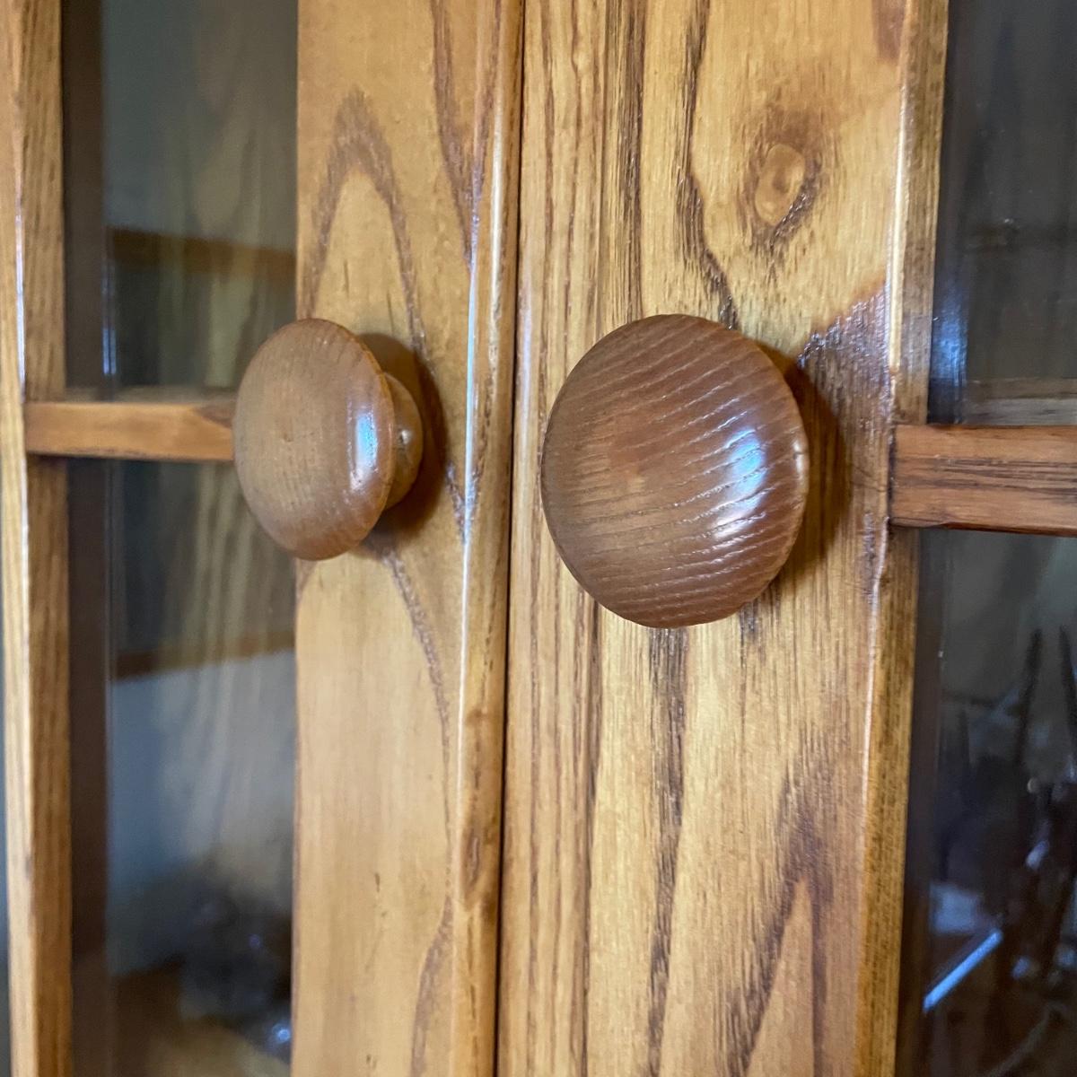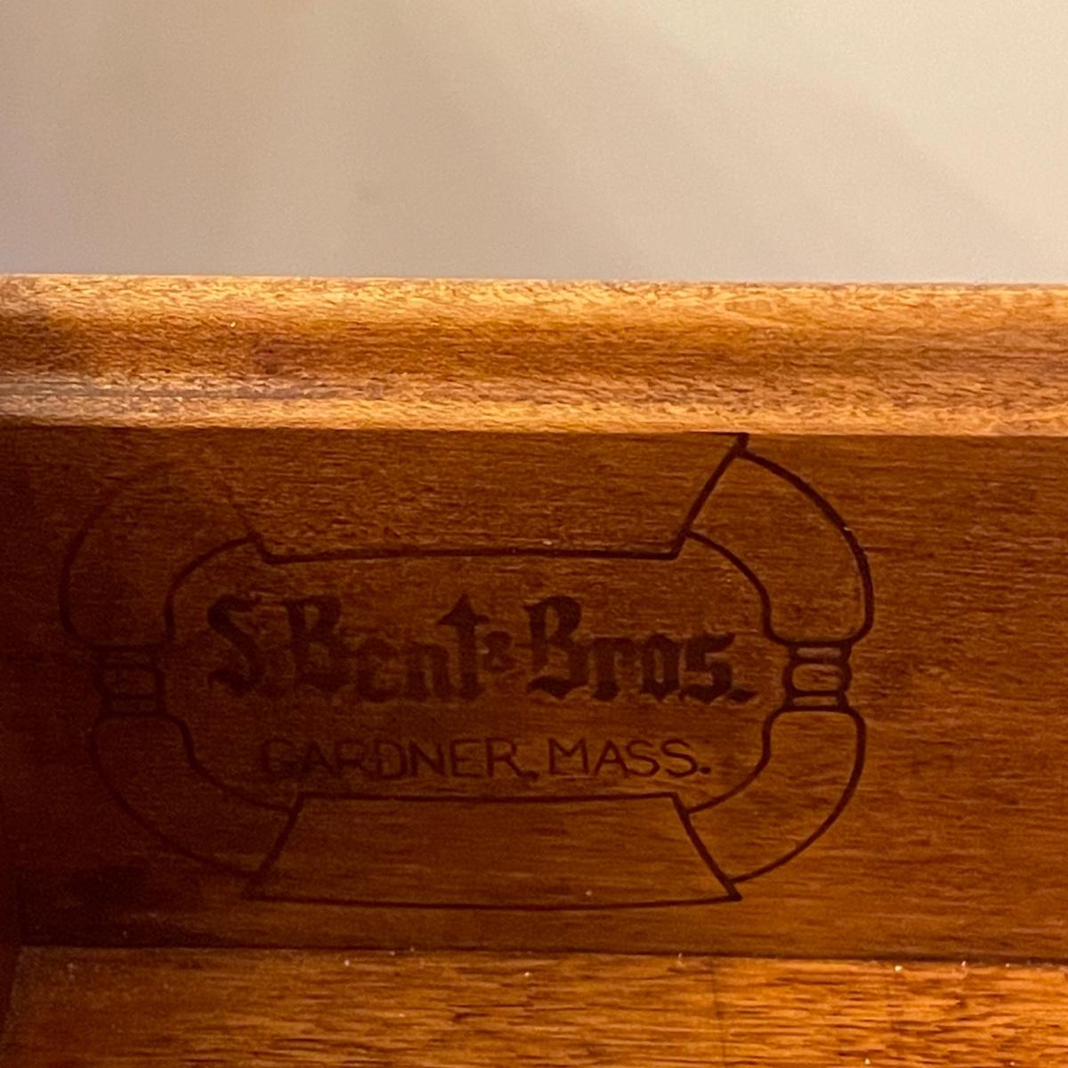 This country style solid wood hutch by S. Bent & Bros. has two dovetailed drawers above the lower cabinet that contains one shelf. The middle/open section of the hutch has a plate rail. The upper cabinet has one shelf with glass bottom and there are 2 spotlights. Piece is in excellent condition. Measures 34” wide x 17” deep x 80” tall (34” tall lower cabinet, 46” upper piece). Hutch is a 2 piece, winning bidder will need to dismantle (Phillips head screwdriver) and must bring help to load due to the size and weight of this item. It is on the main floor and will not need to be moved up or down any stairs.