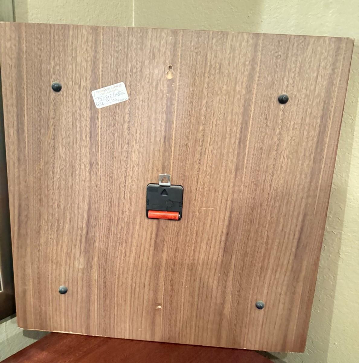 Made of solid walnut, it has black metal hands, a second hand and runs on A batterie.