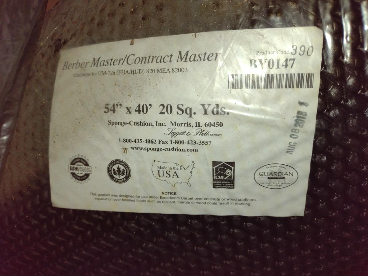 Pair of Berber Master/Contract Master Carpet Underlayment Rolls New in Pack 20 sq. yds. Shipping option via freight or local mover is Buyer's responsibility and expense. Buyer must have all shipping scheduled within the stated dates and times of pickup. Recommended local movers are Beaty Bros. Moving 828-201-2982 and Carolina Pack n Go 828-489-9773.