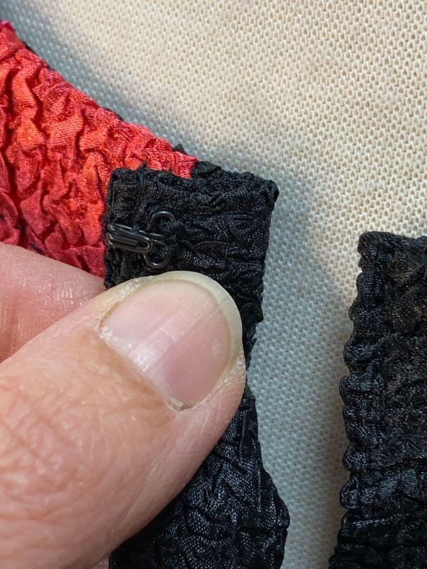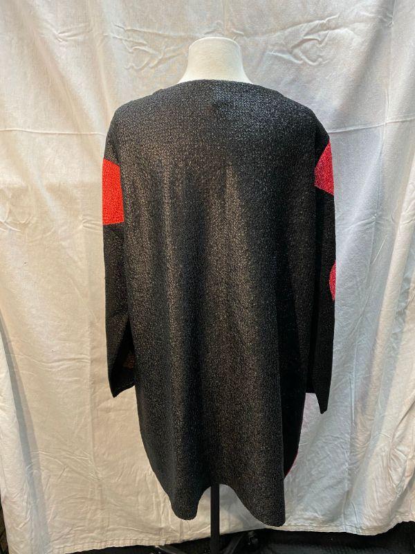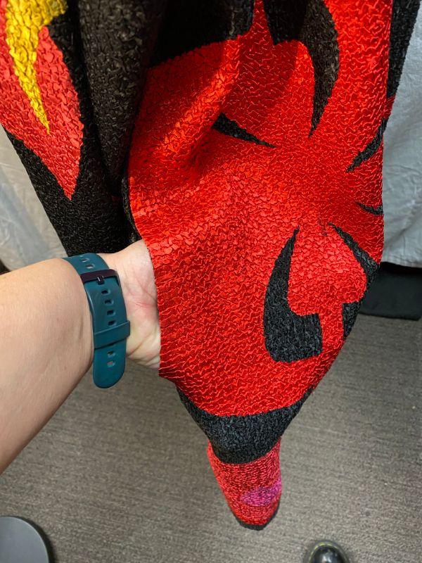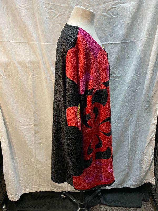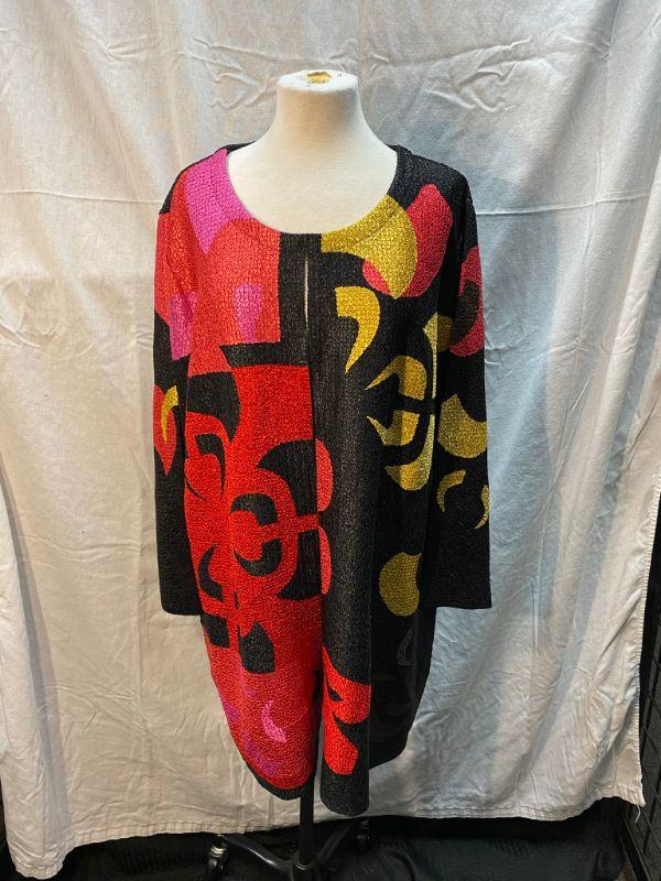 Berek abstract duster jacket. Bold color design. Two small hook and eye closure at the top. Material has a crinkle crepe like texture to it. Size 2XL.
