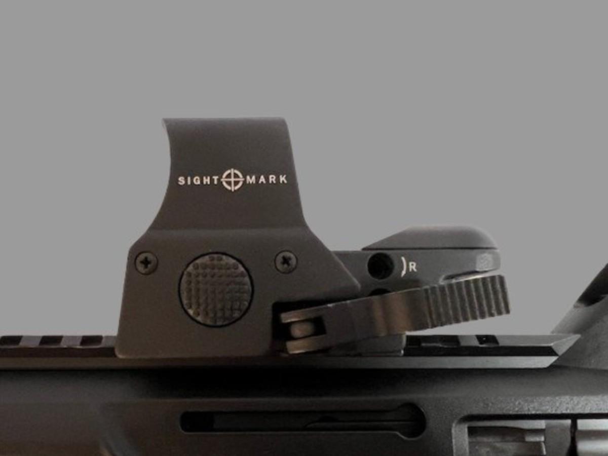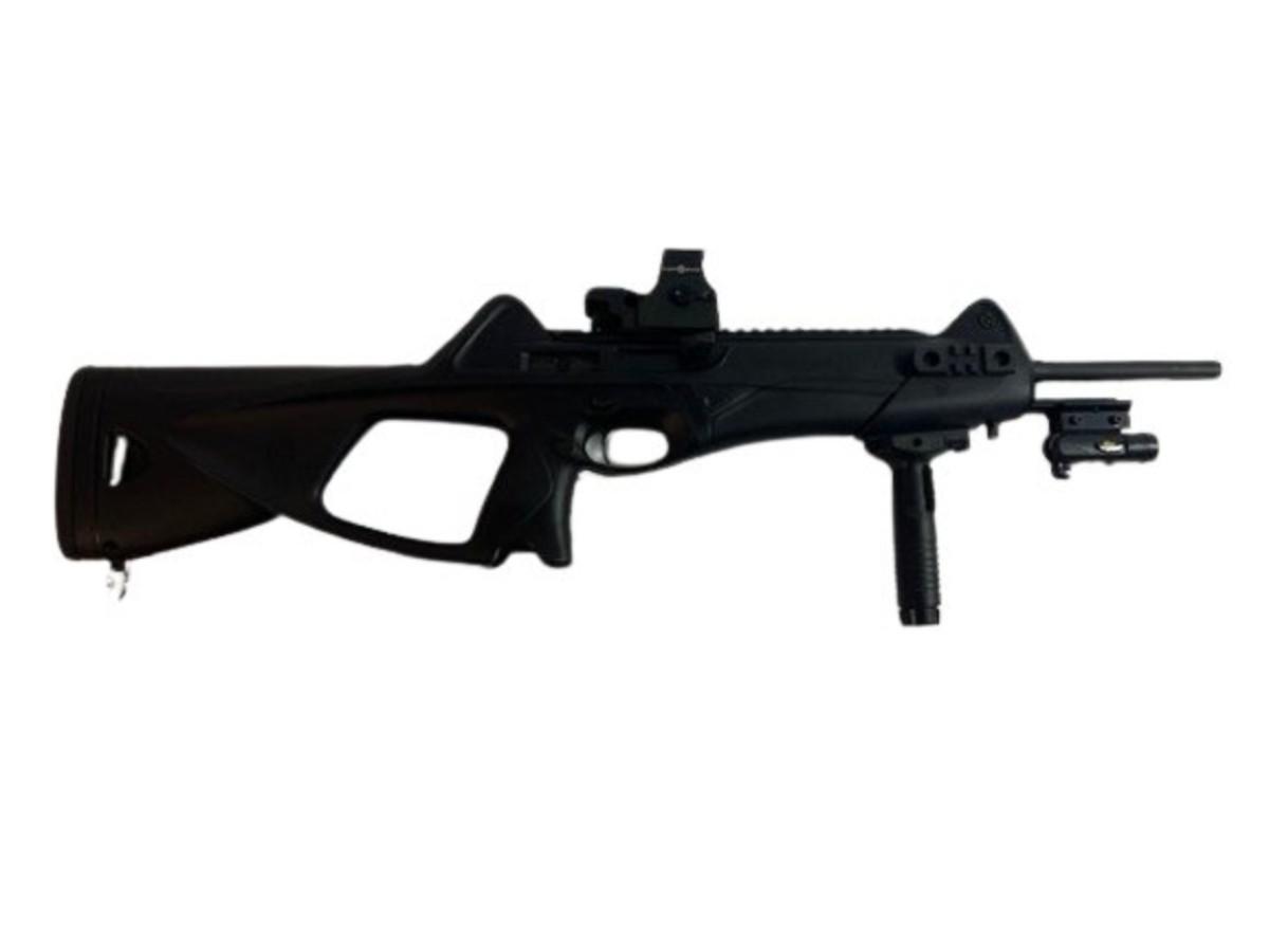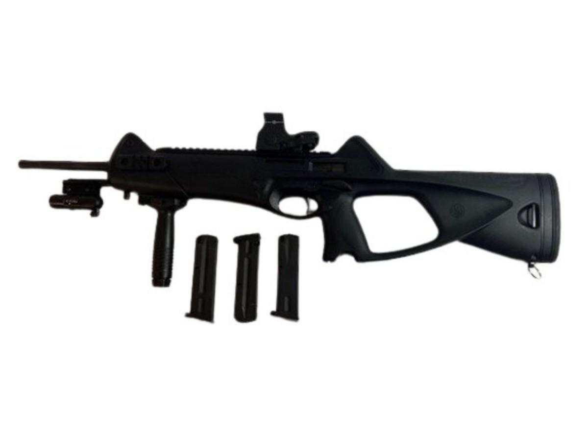 Caliber is 9mm. Has Sight Mark optics, composite stock, pistol grip, broom handle grip, BSA flashlight, 3 magazines, carrying bag, and additional accessories. Serial number CX08550. Not tested. [LF]